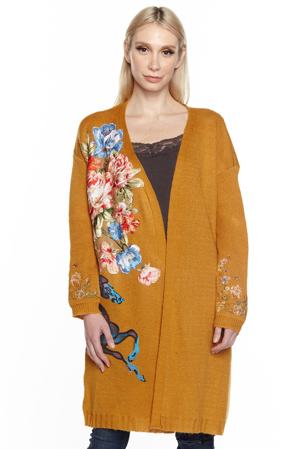 - Long sweater cardigan with embroidered front & embroidered sleeves, lower front & back attached with the horse patch