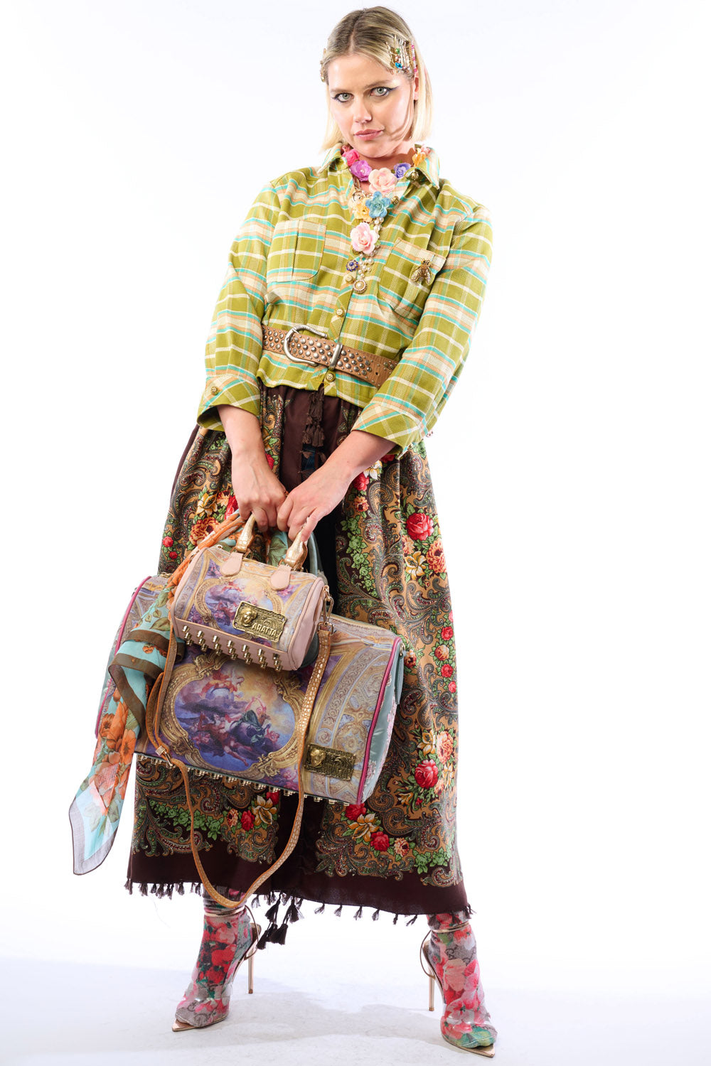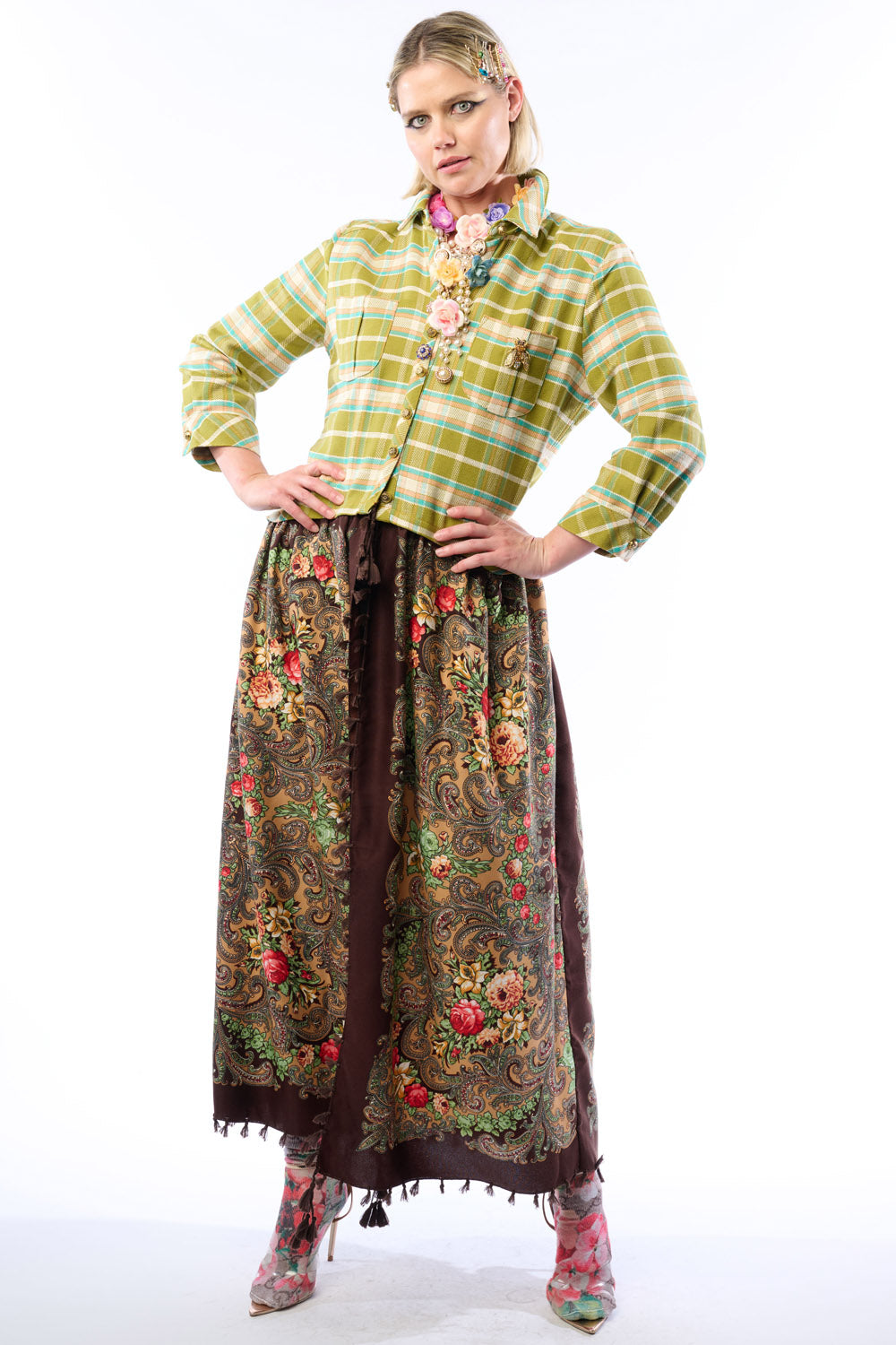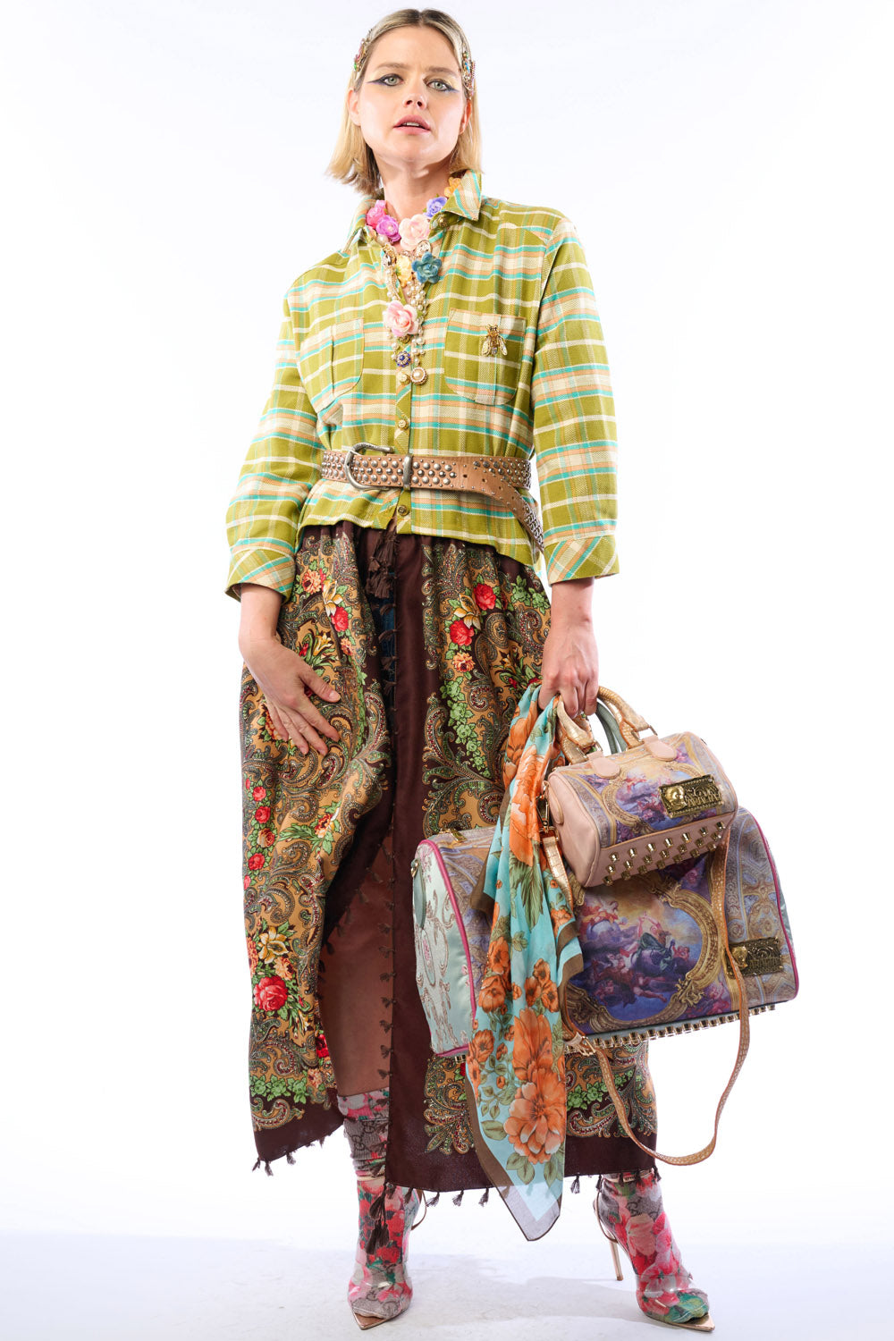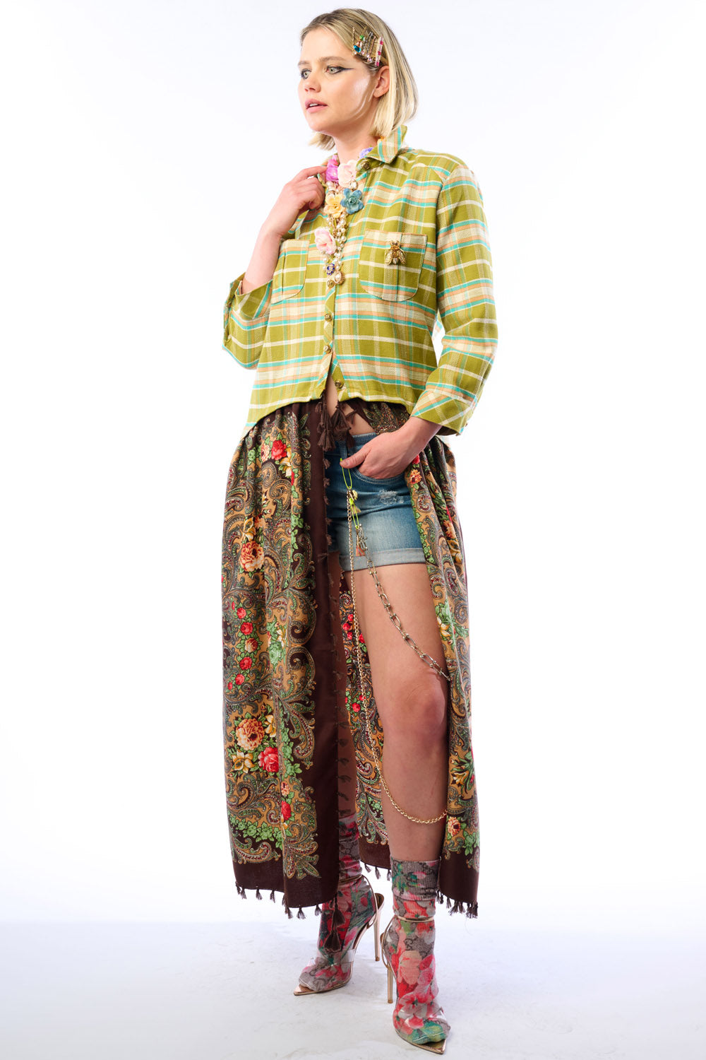 - Plaid/floral scarf print button-up duster, 2 front pockets, 2 decorative crystal buttons attached to CF placket, 1 brooch pinned on front left pocket