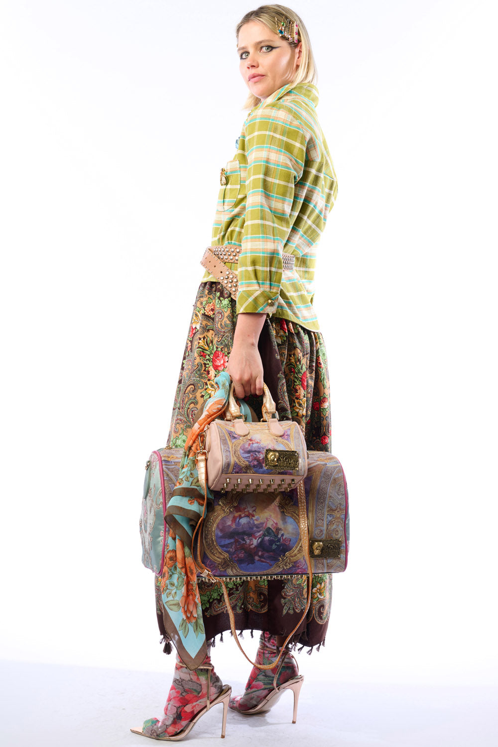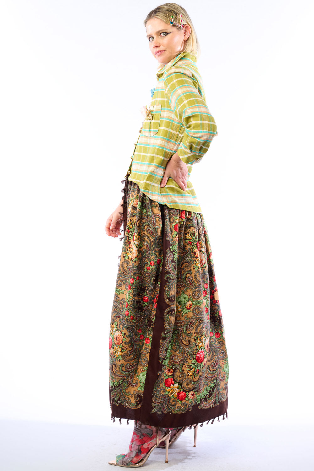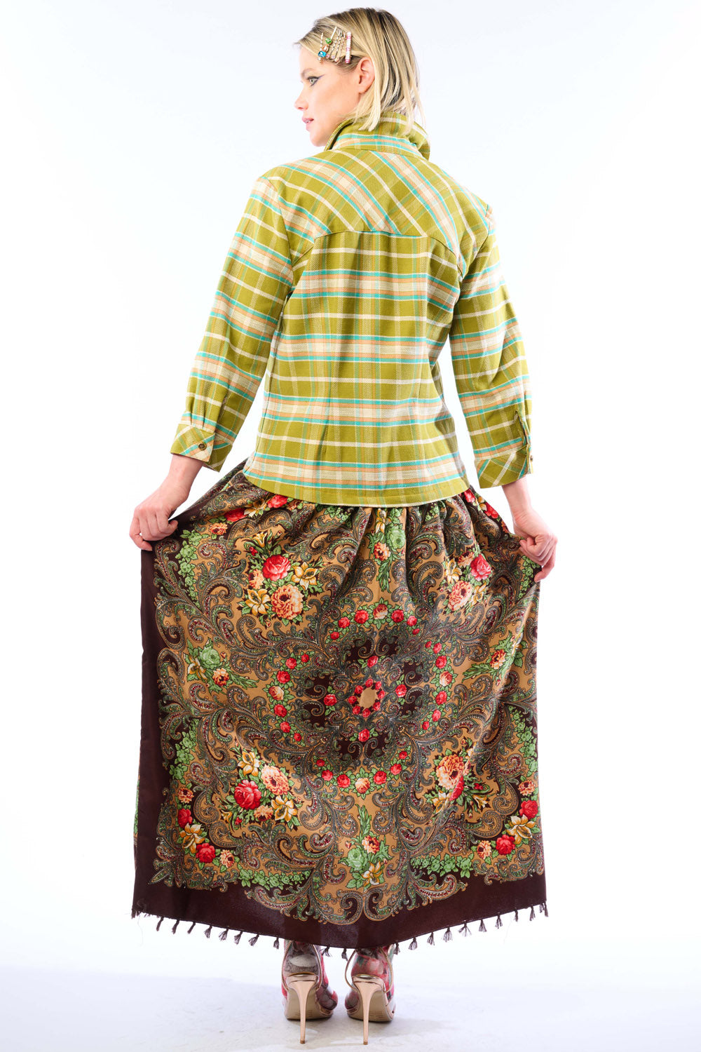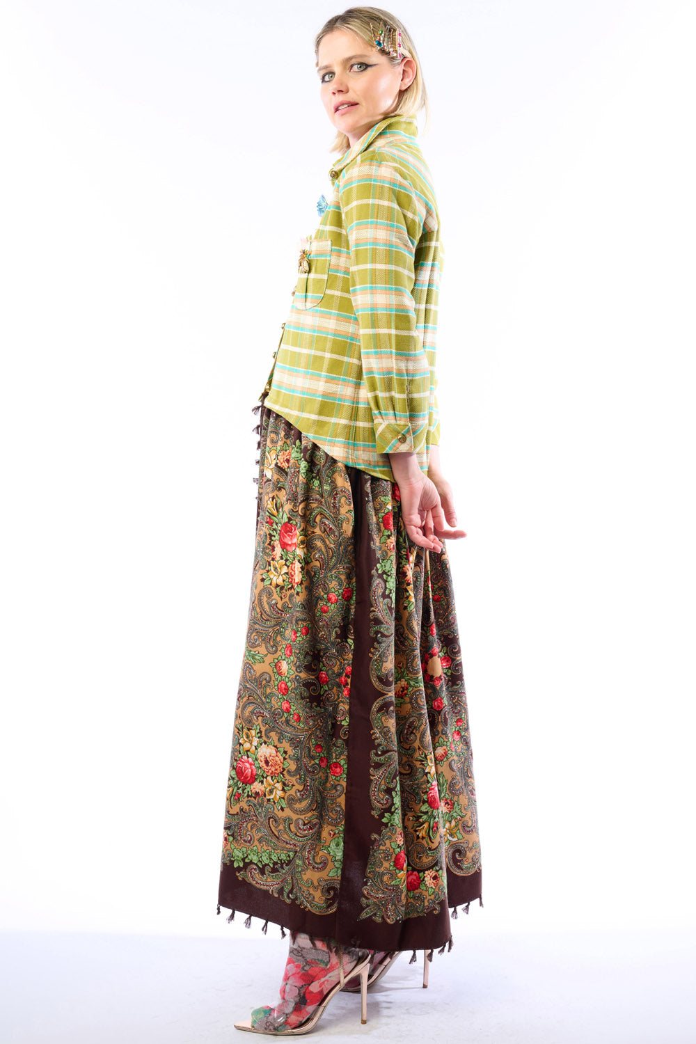 - Plaid/floral scarf print button-up duster, 2 front pockets, 2 decorative crystal buttons attached to CF placket, 1 brooch pinned on front left pocket