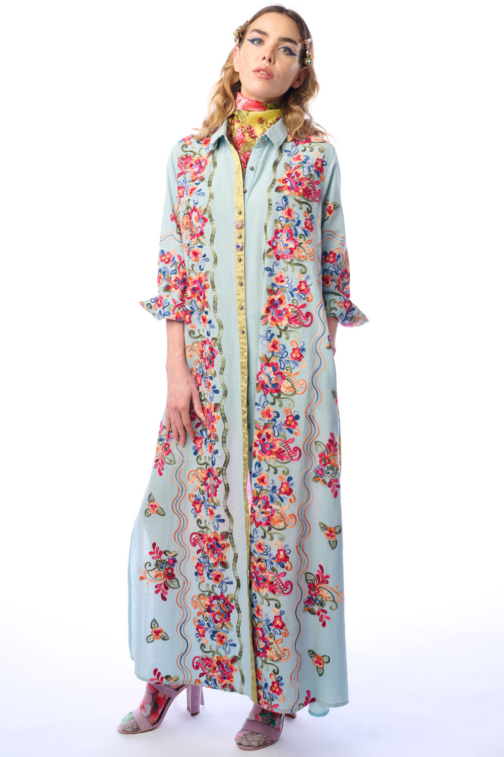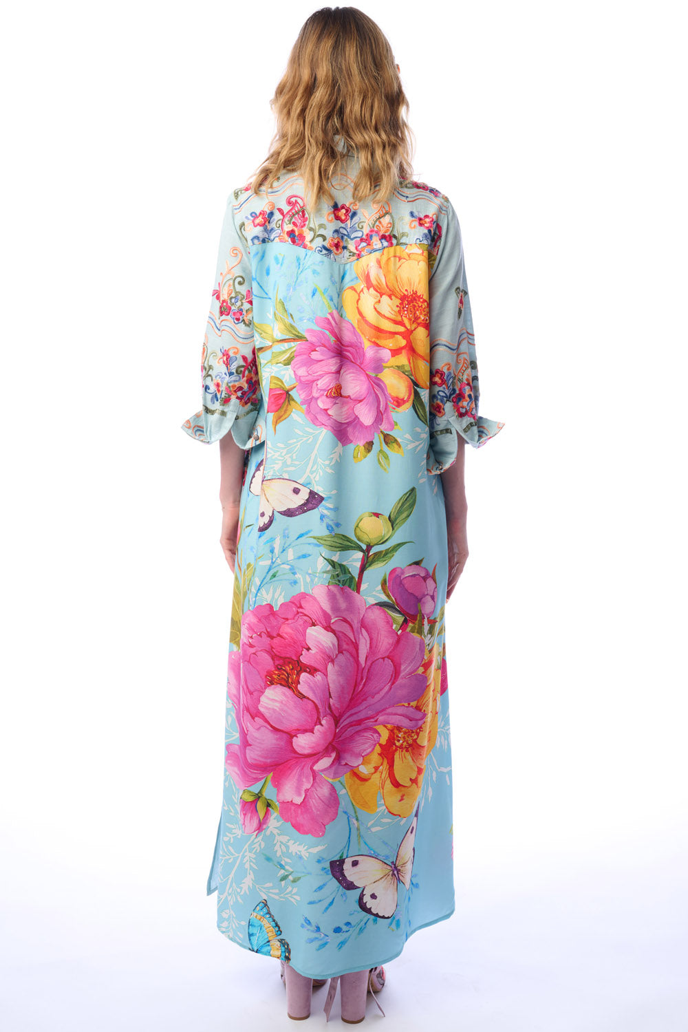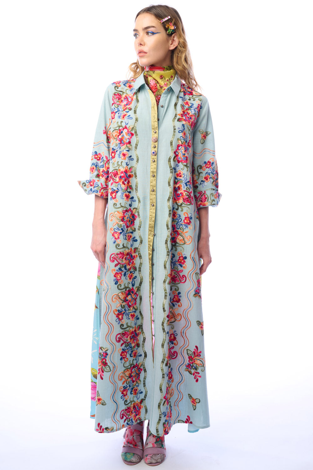 - Embroidered button-up duster with butterfly floral print on the back, 2 side pockets, 2 crystal buttons attached to CF placket, side slits