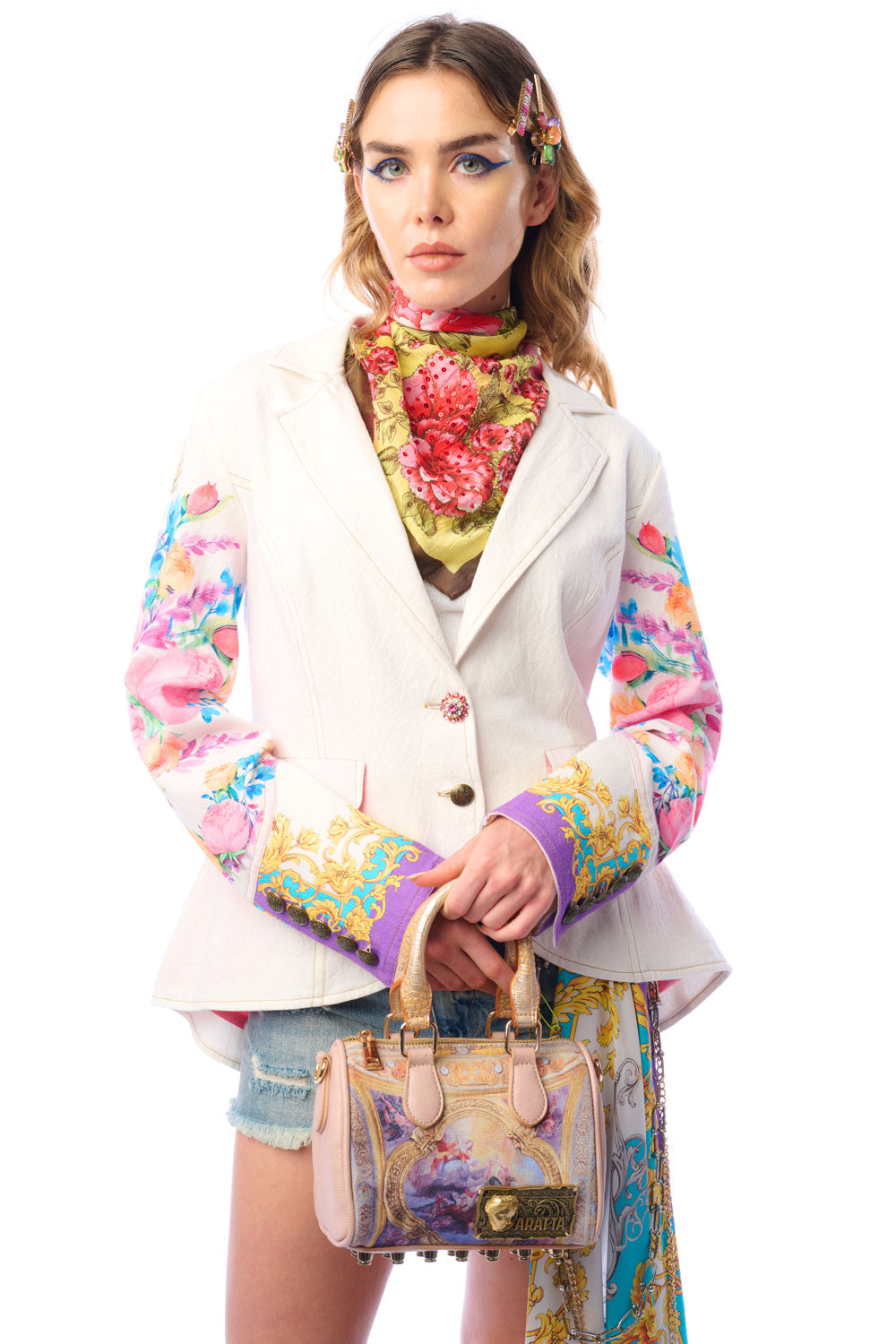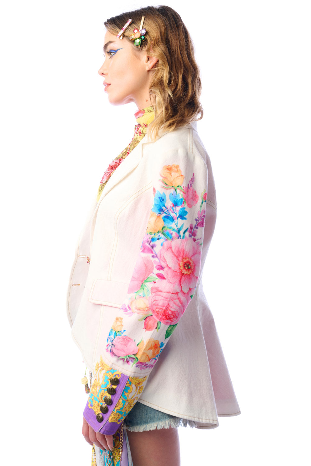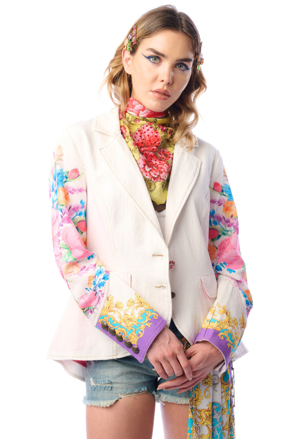 - Button-up blazer with floral print sleeves, 1 CF crystal button, 2 front flap pockets, satin lining