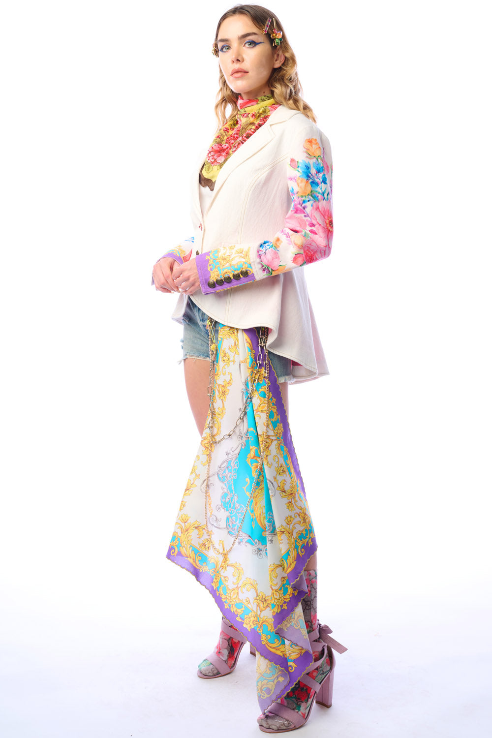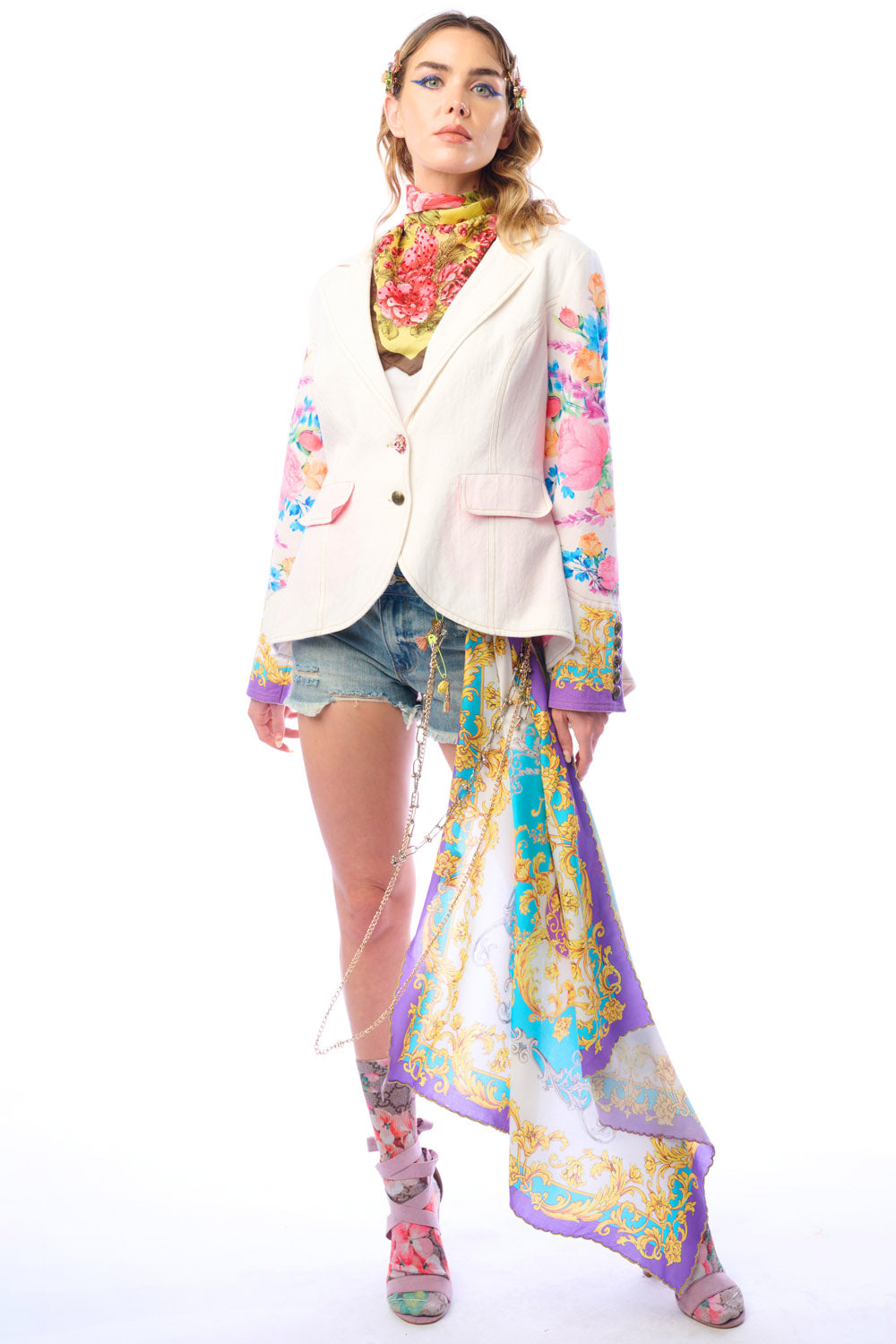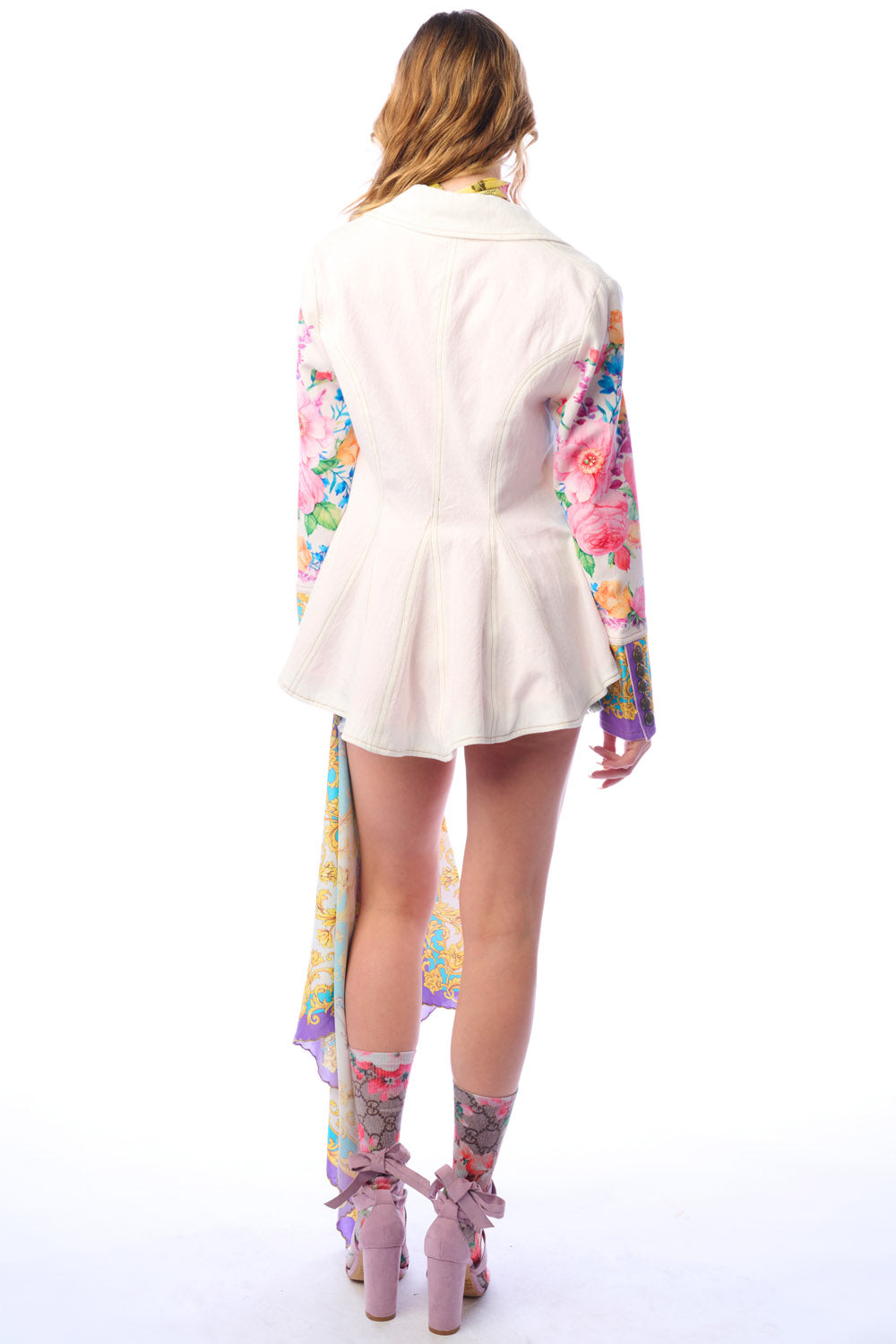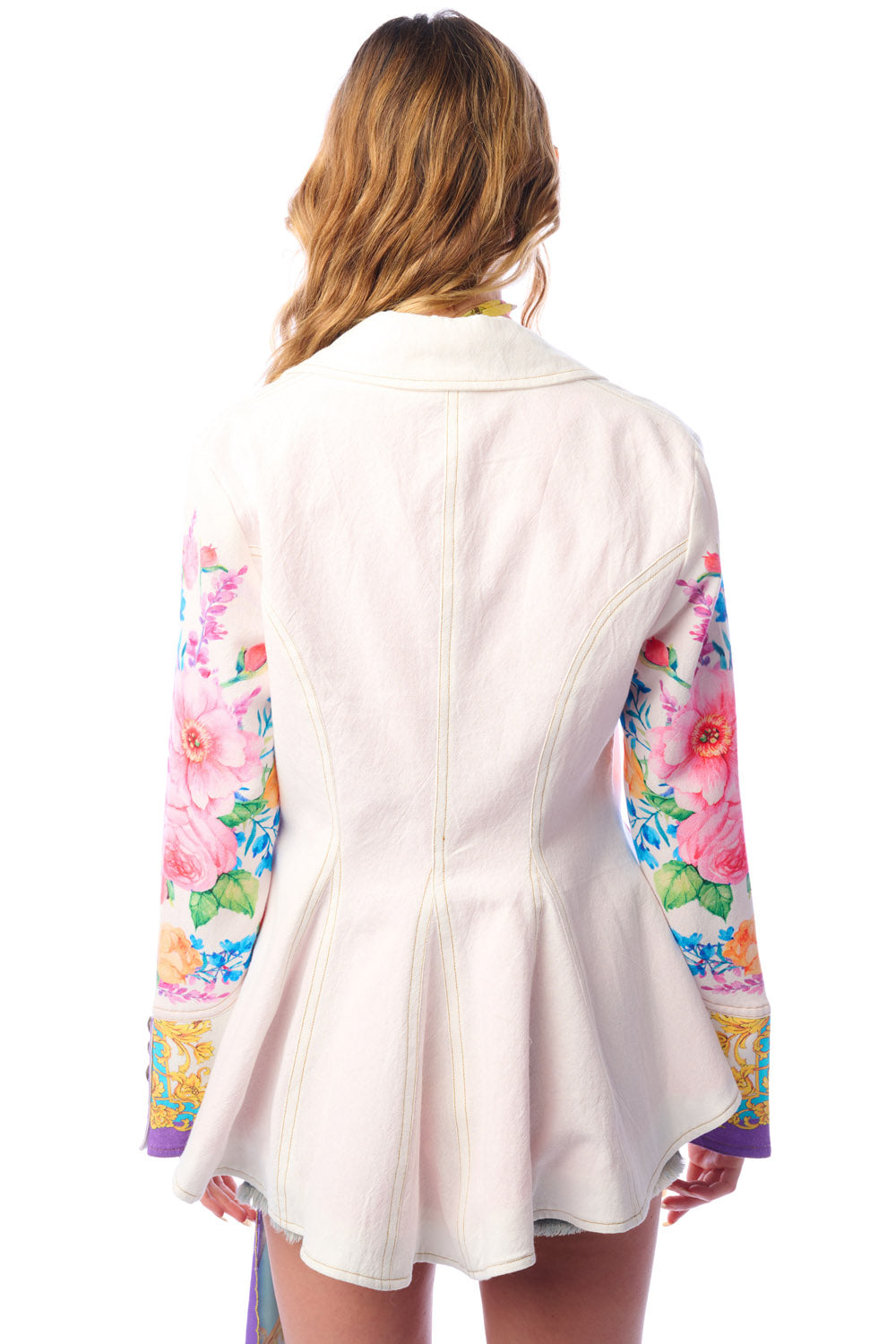 - Button-up blazer with floral print sleeves, 1 CF crystal button, 2 front flap pockets, satin lining