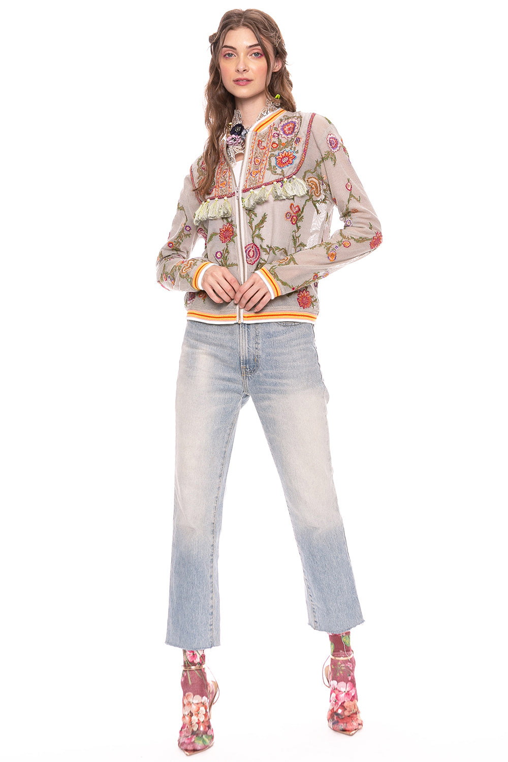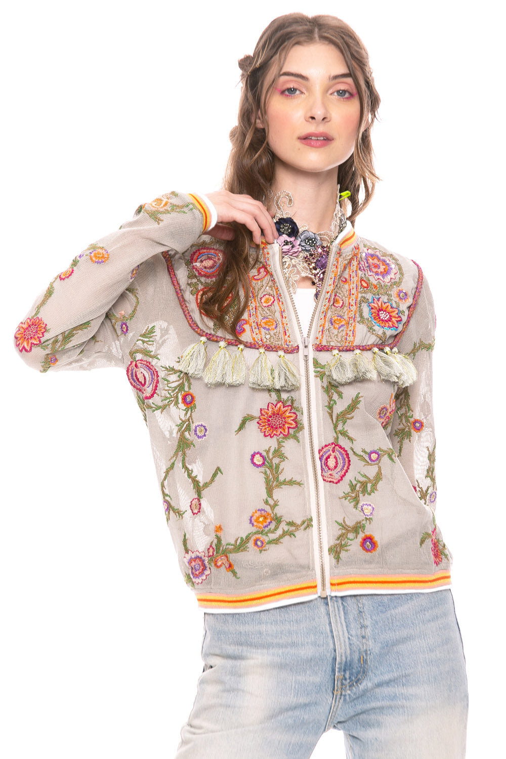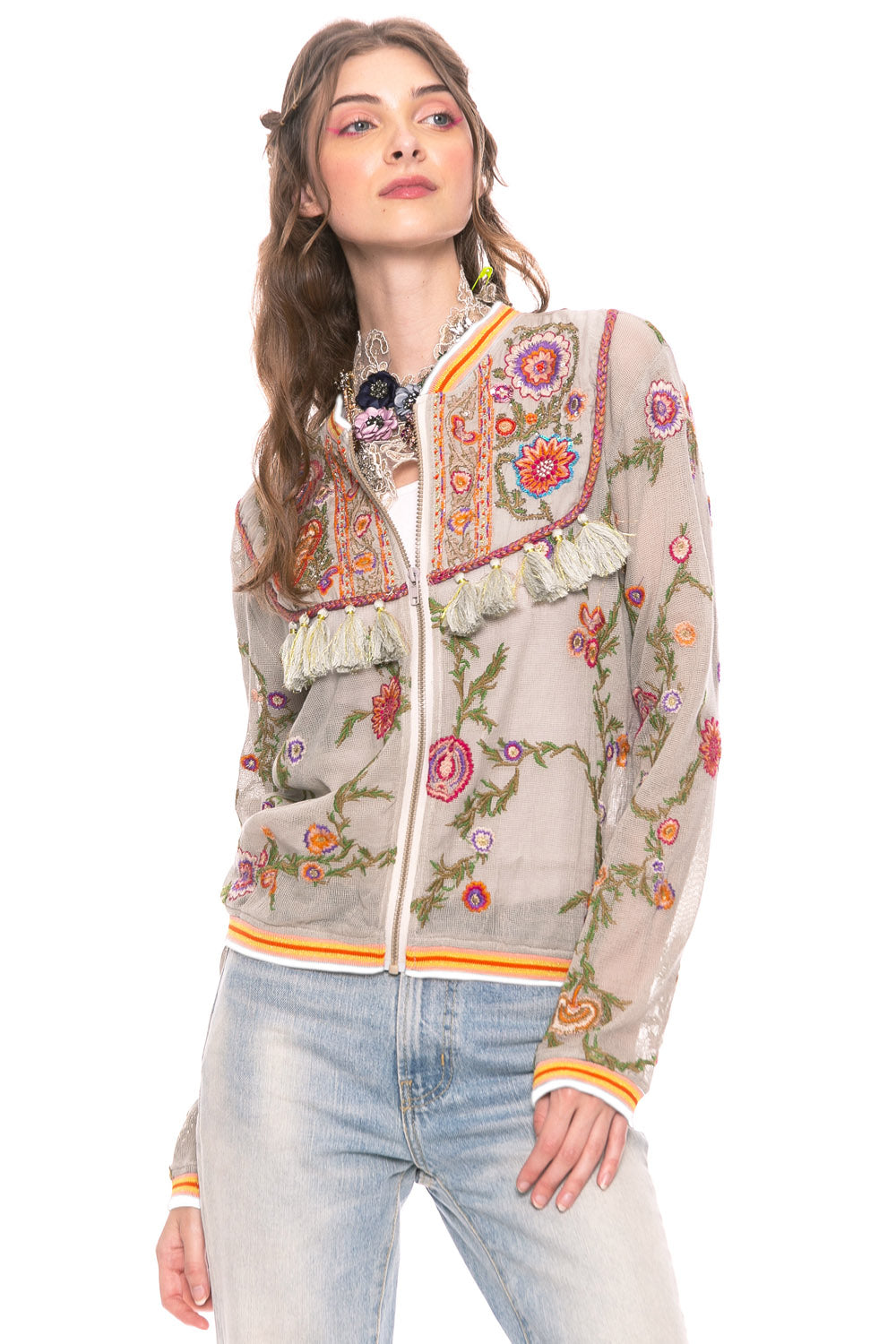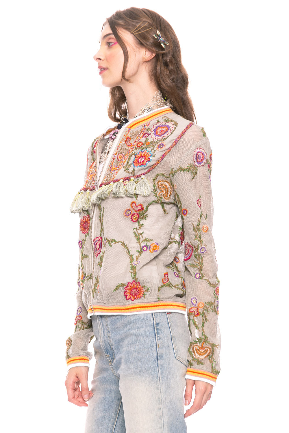 - Embroidered mesh zip bomber jacket, front yokes with sequin embroidery and tassels, contrast stripe collar, cuffs and waistband