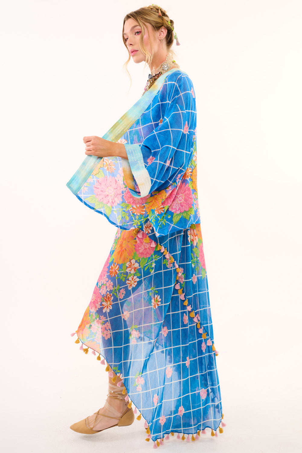 - Hand-beaded diagonal floral border print kimono with tie-dye lurex contrast CF placket and sleeve cuffs, side slits