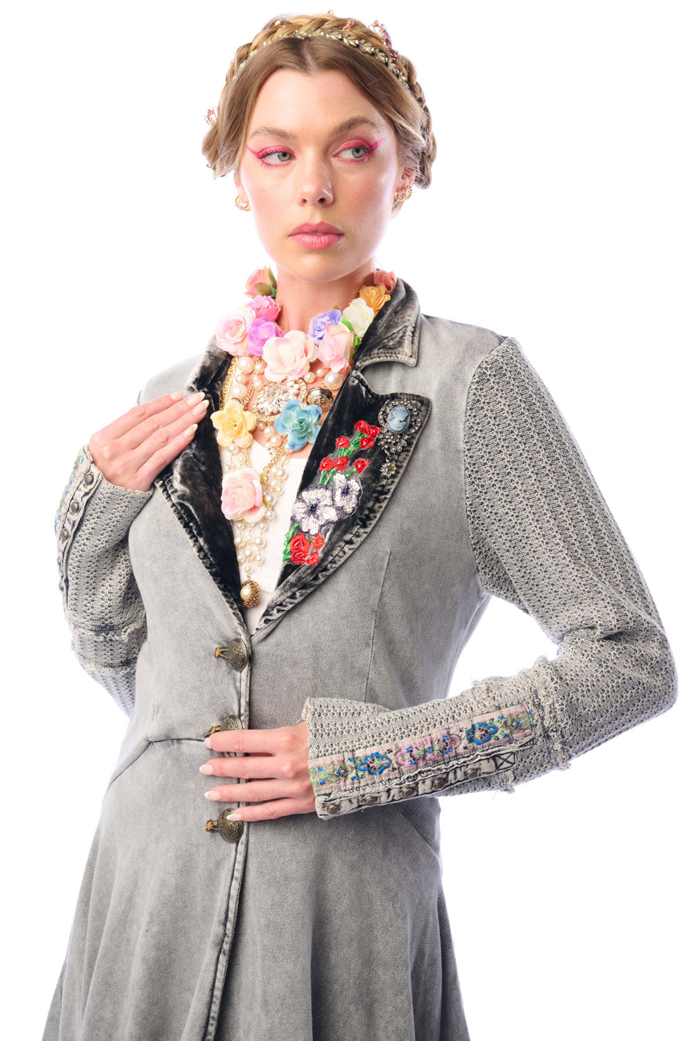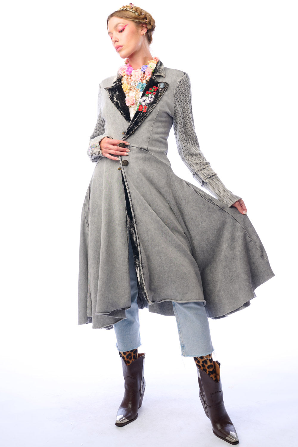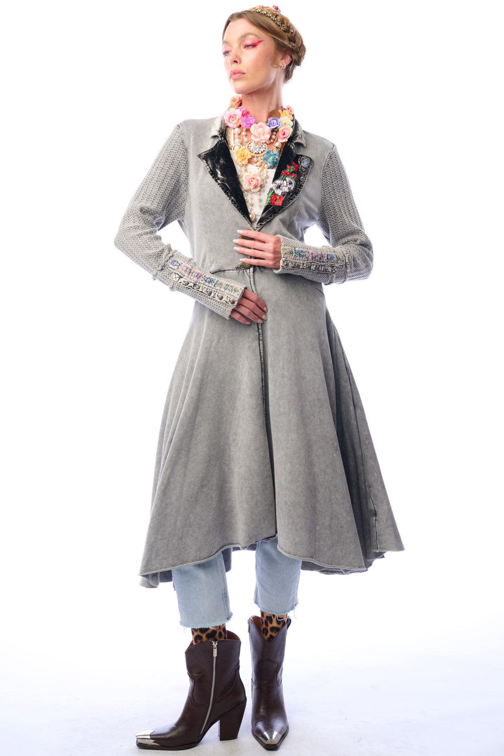 - Washed asymmetric hem French terry coat with brooch and hand embellished trim attached to the velvet lapel