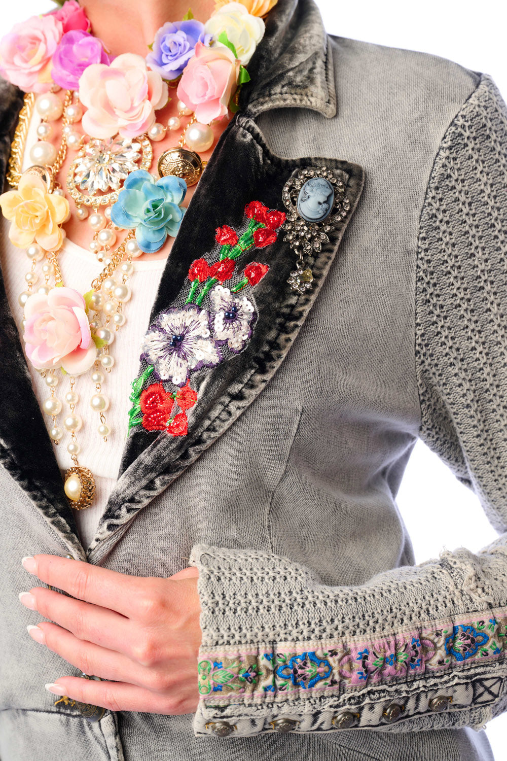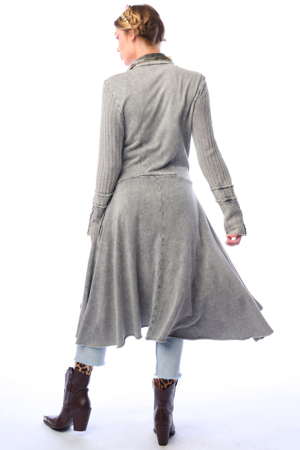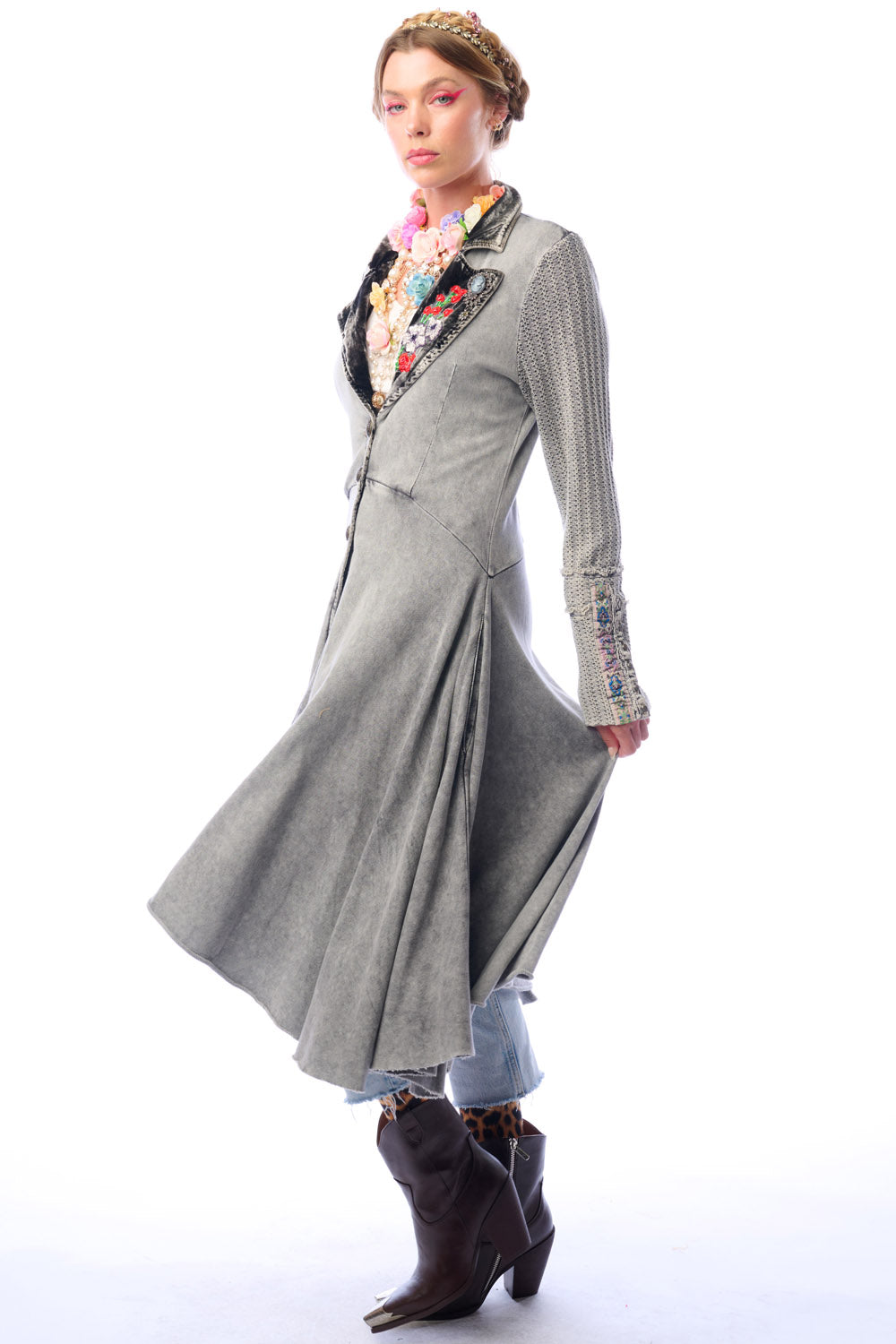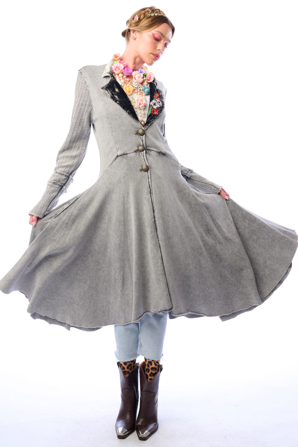- Washed asymmetric hem French terry coat with brooch and hand embellished trim attached to the velvet lapel