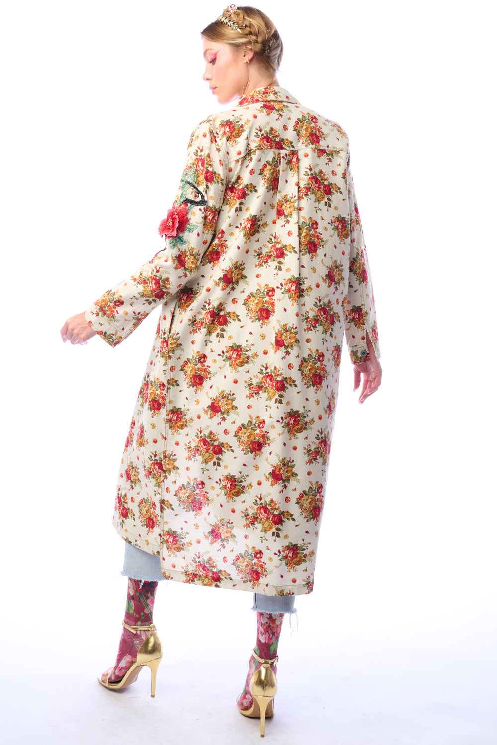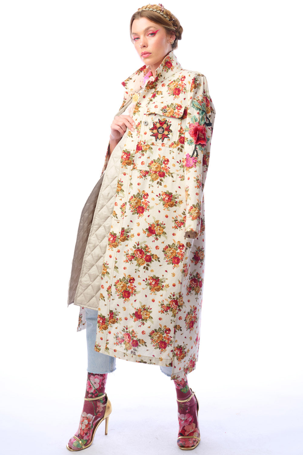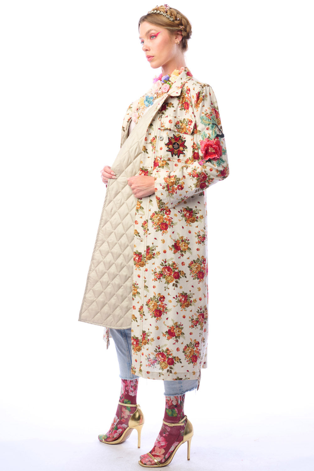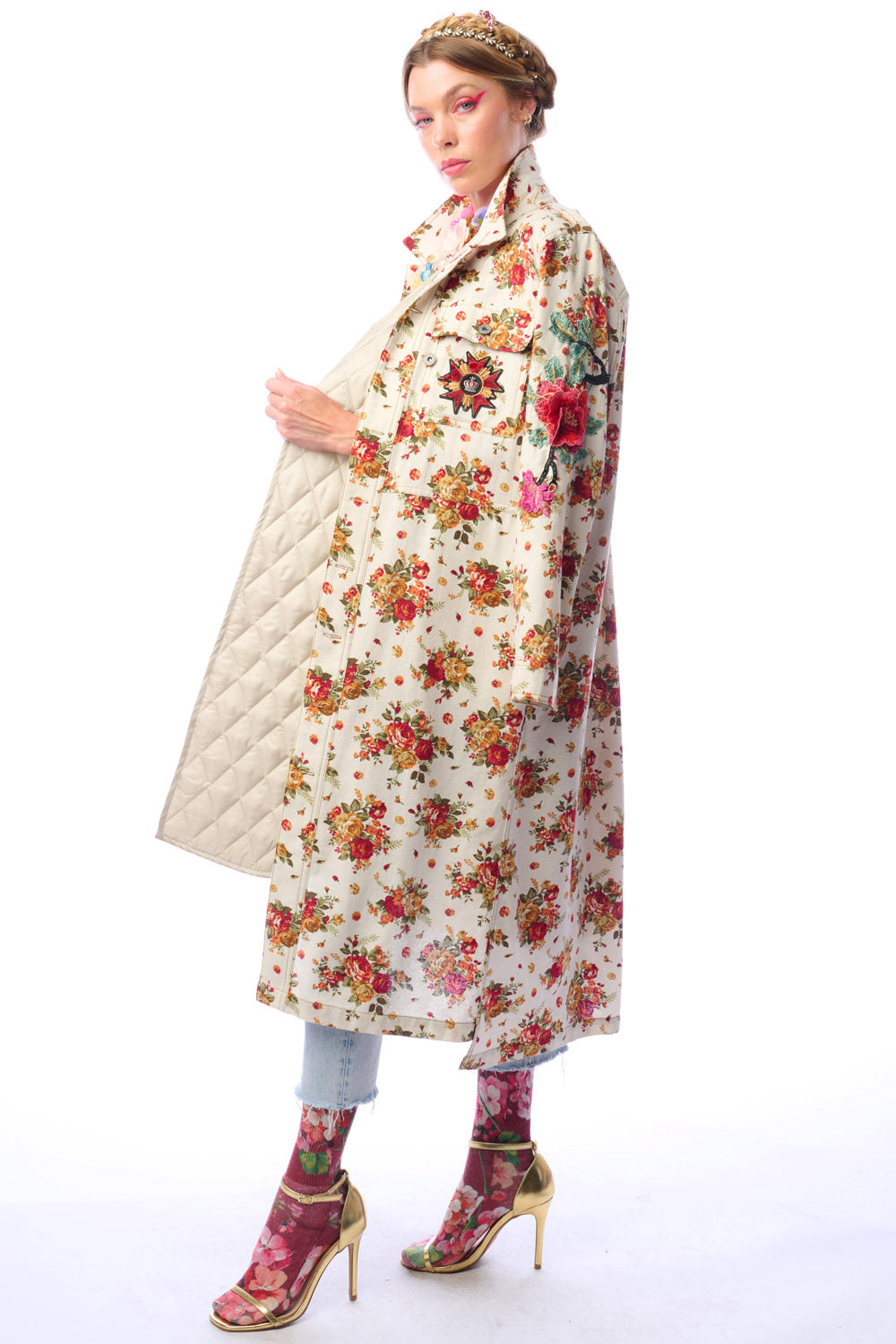 - Floral print button-up coat with embroidered floral patch sewn on left sleeve, 2 front pockets, left pocket with royal badge, slight high-low hem, detached quilted liner as lining, sleeveless lining