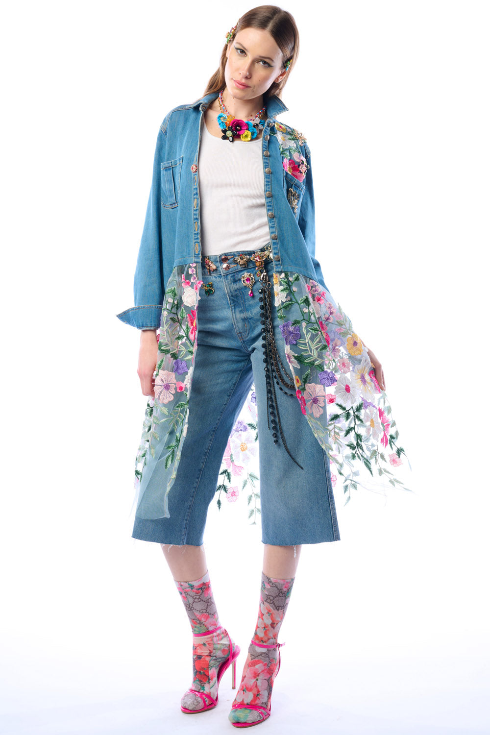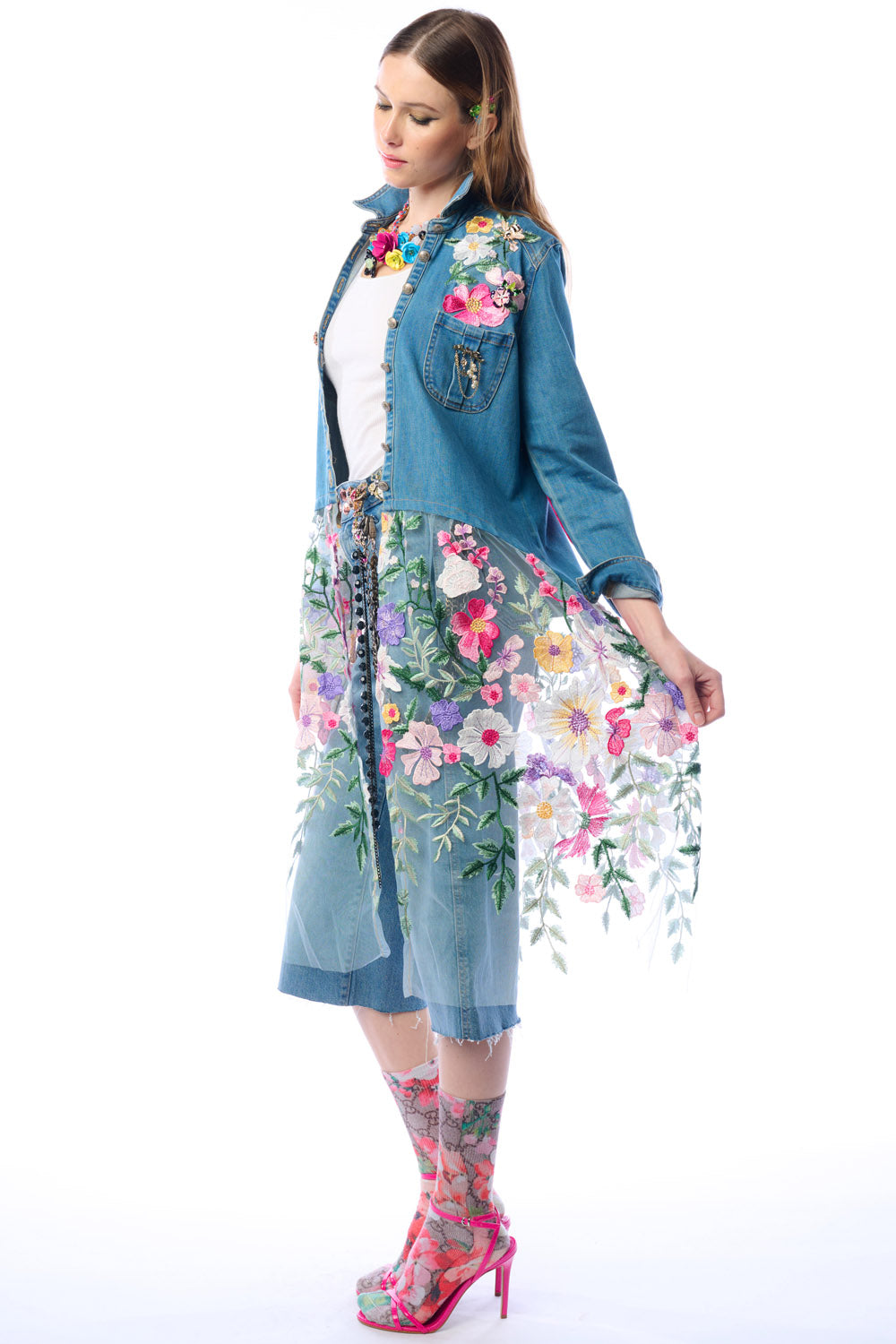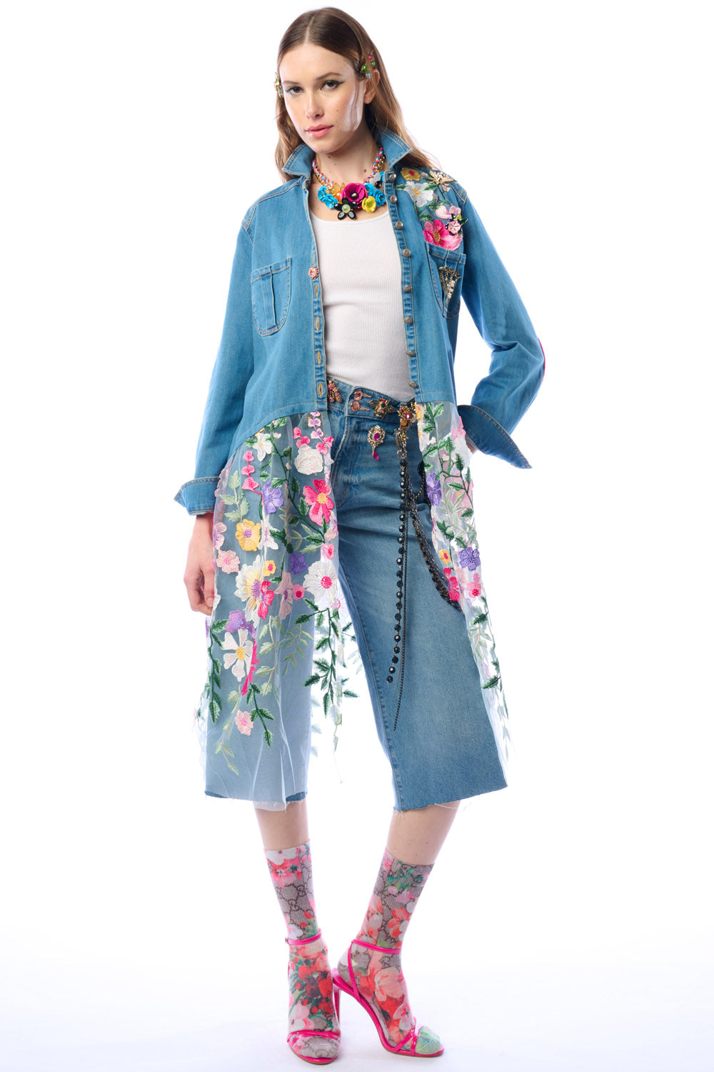 - Denim/embroidered mesh long sleeve button-up duster with 2 contrast velvet elbow patches, upper left front with floral embroidered patch, 2 front pockets, 1 crystal button attached to CF placket