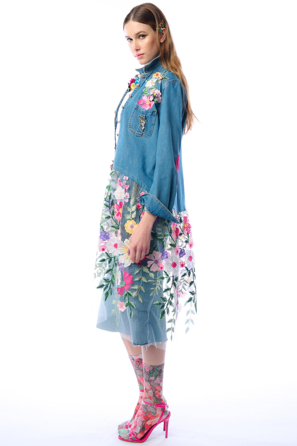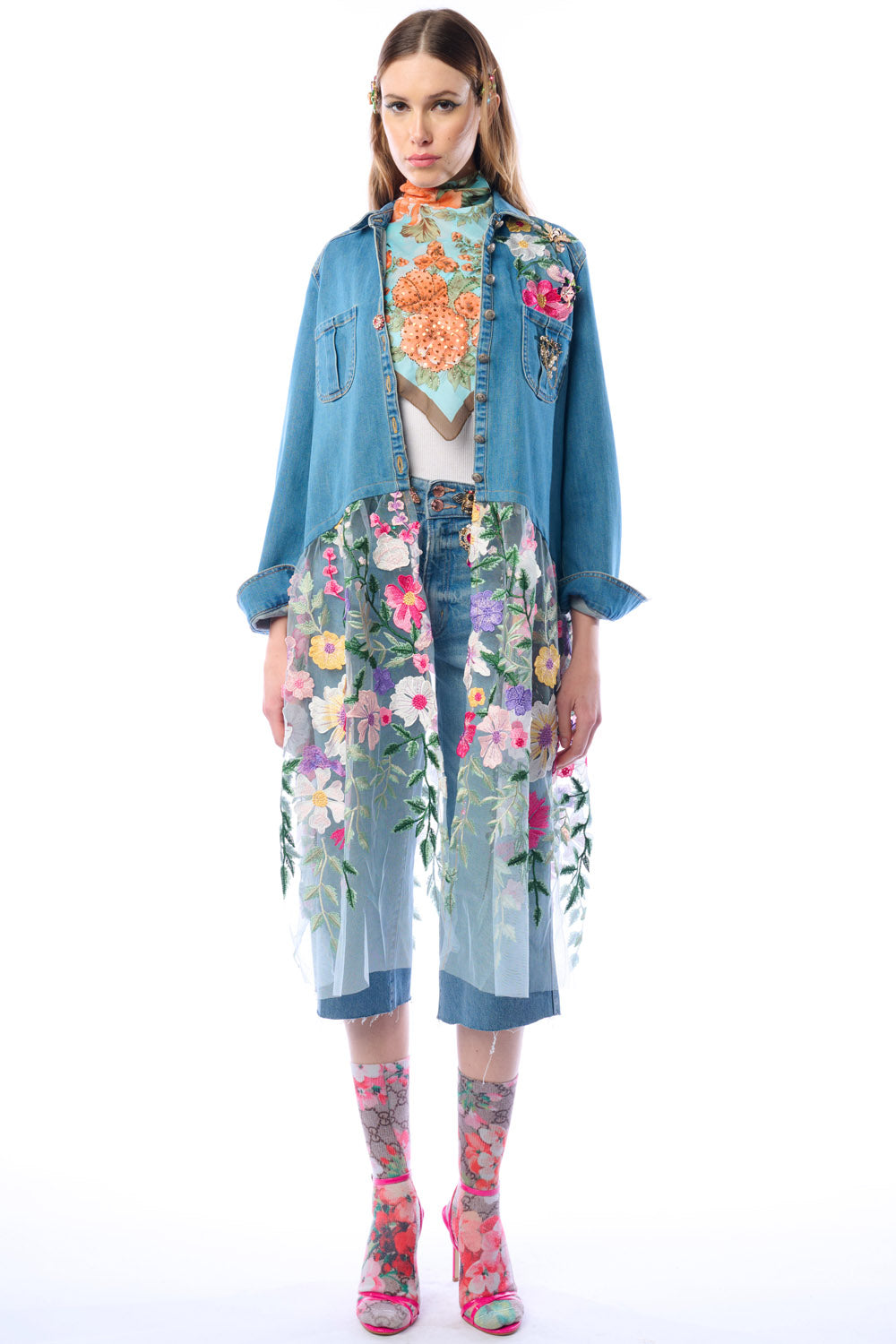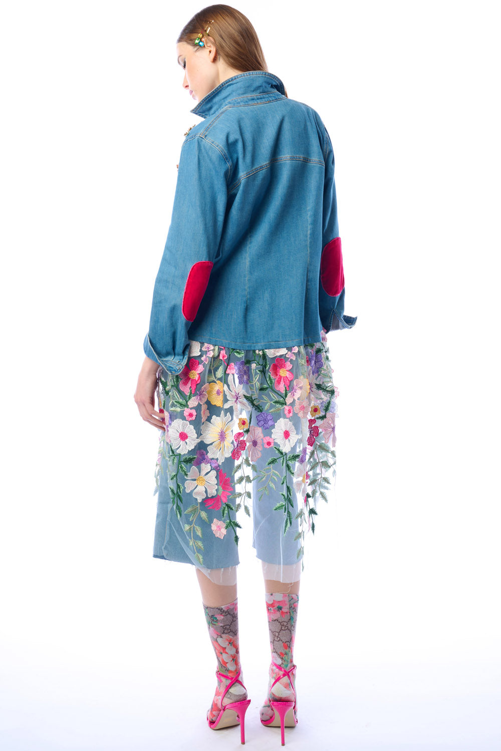 - Denim/embroidered mesh long sleeve button-up duster with 2 contrast velvet elbow patches, upper left front with floral embroidered patch, 2 front pockets, 1 crystal button attached to CF placket