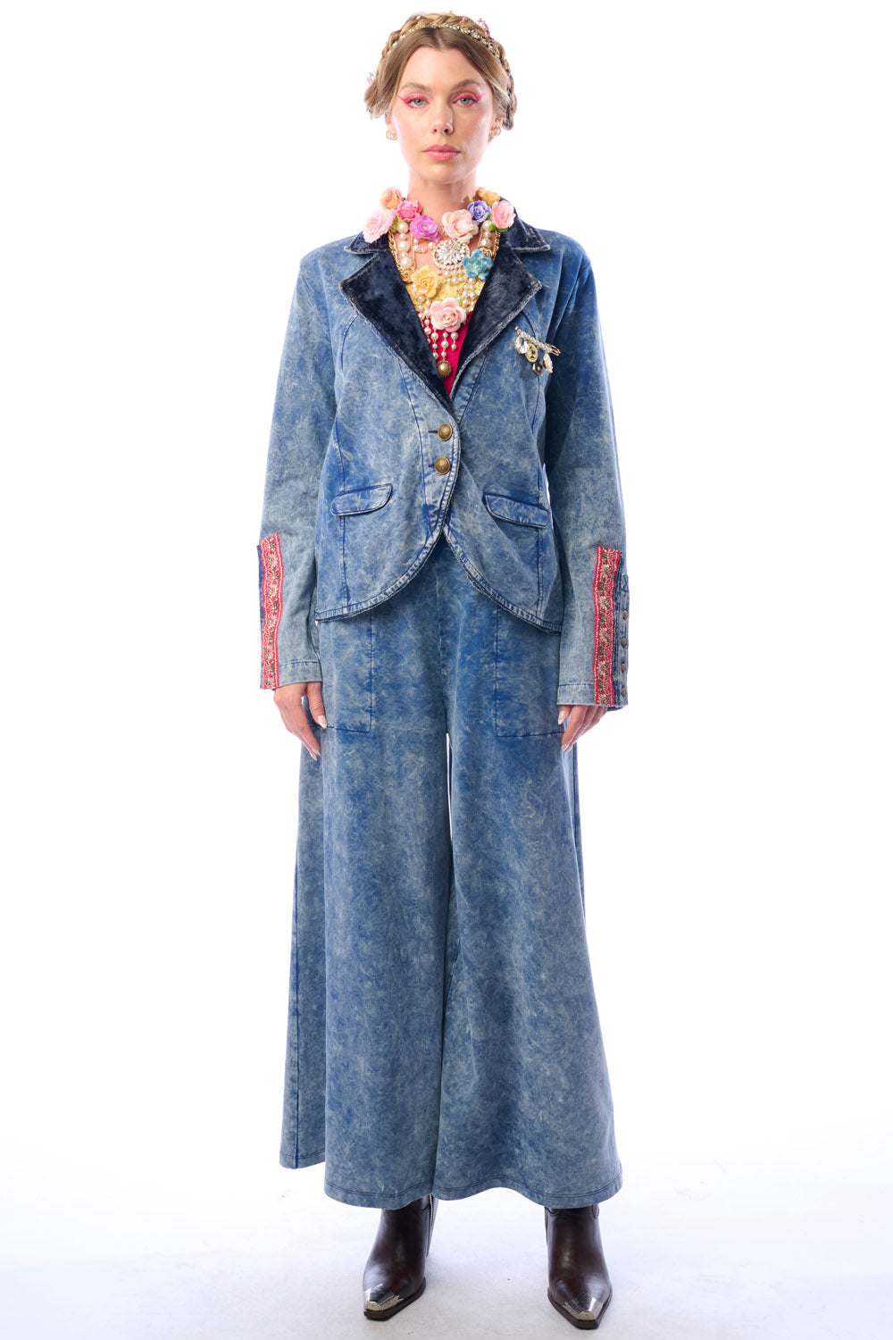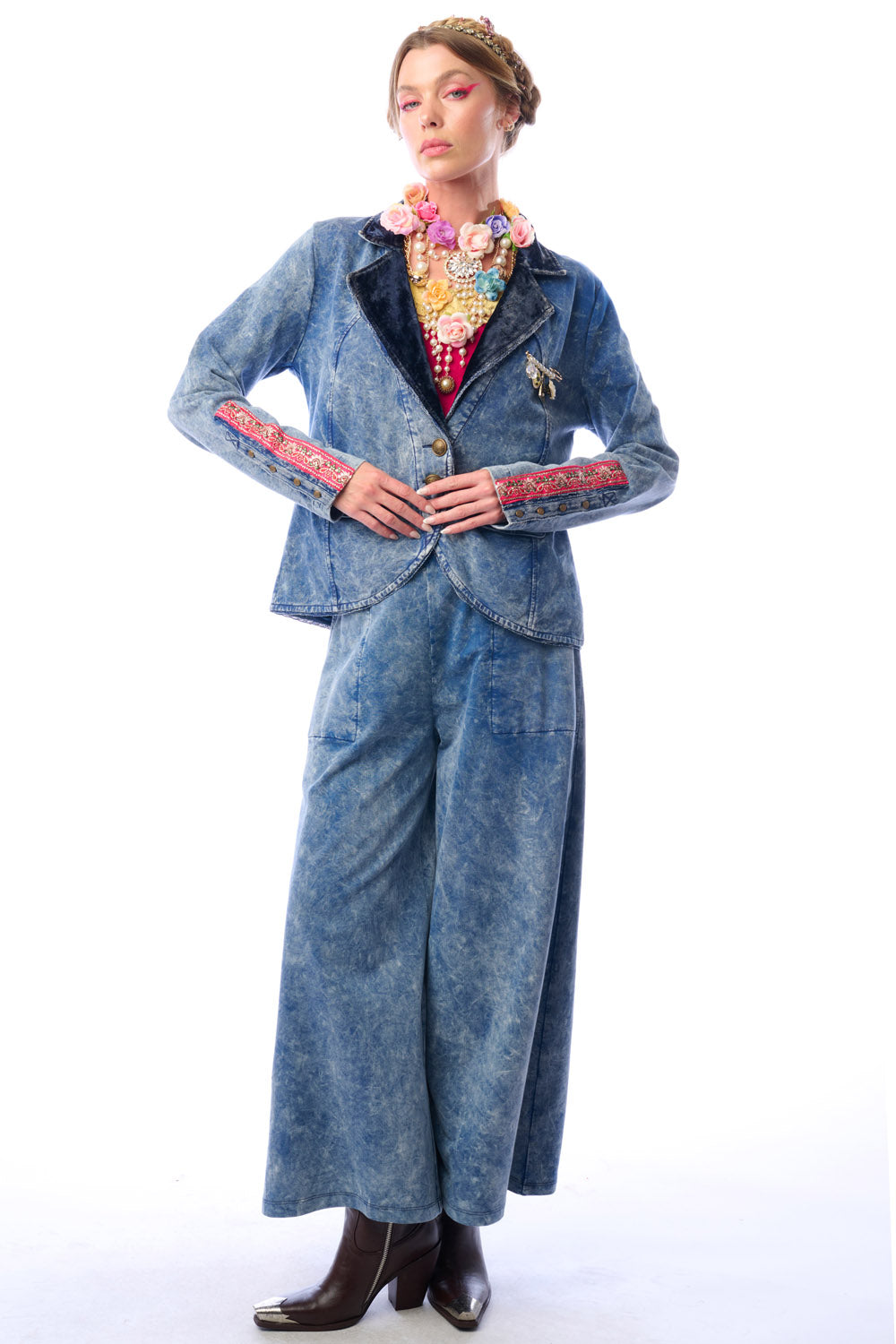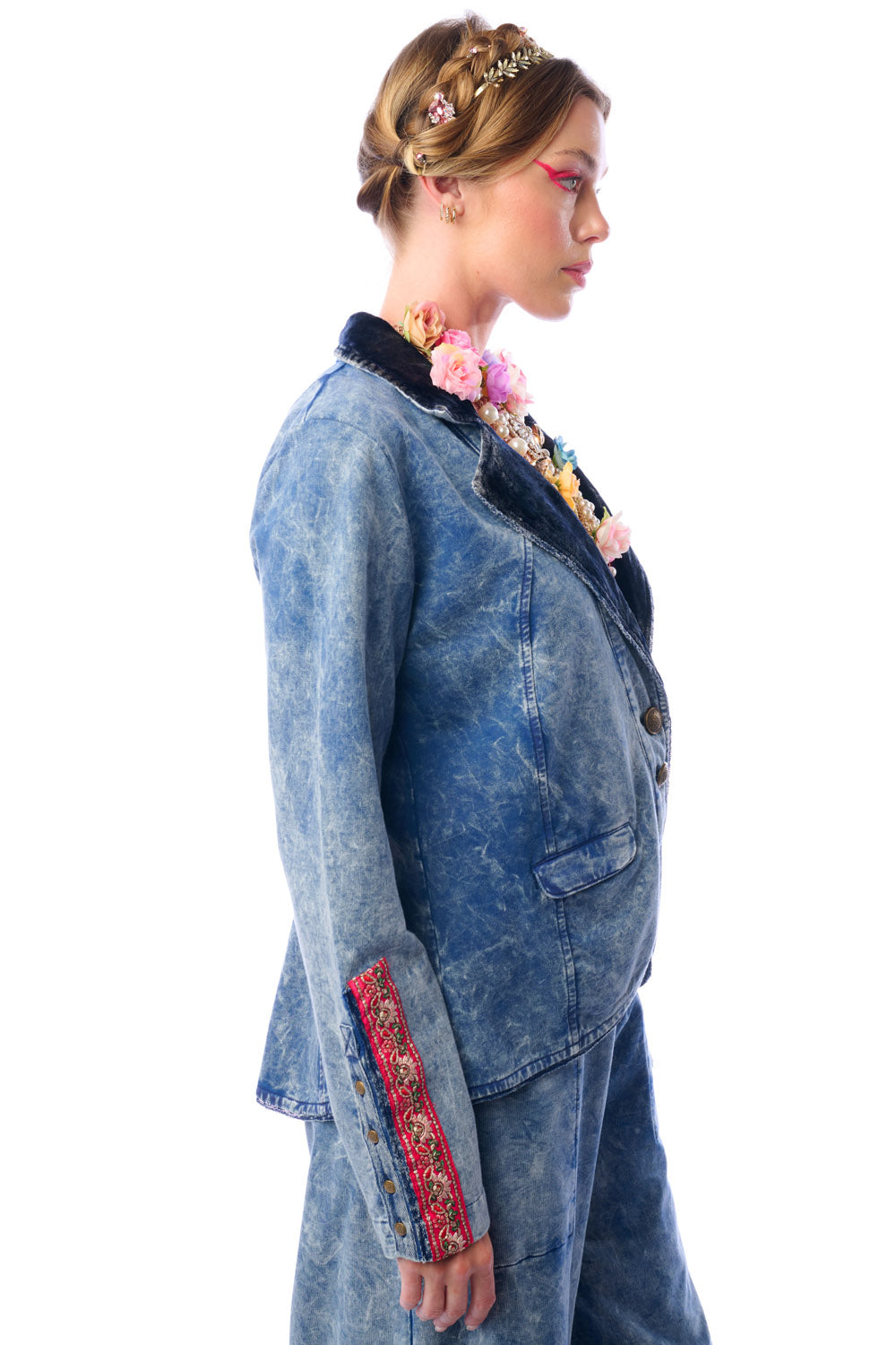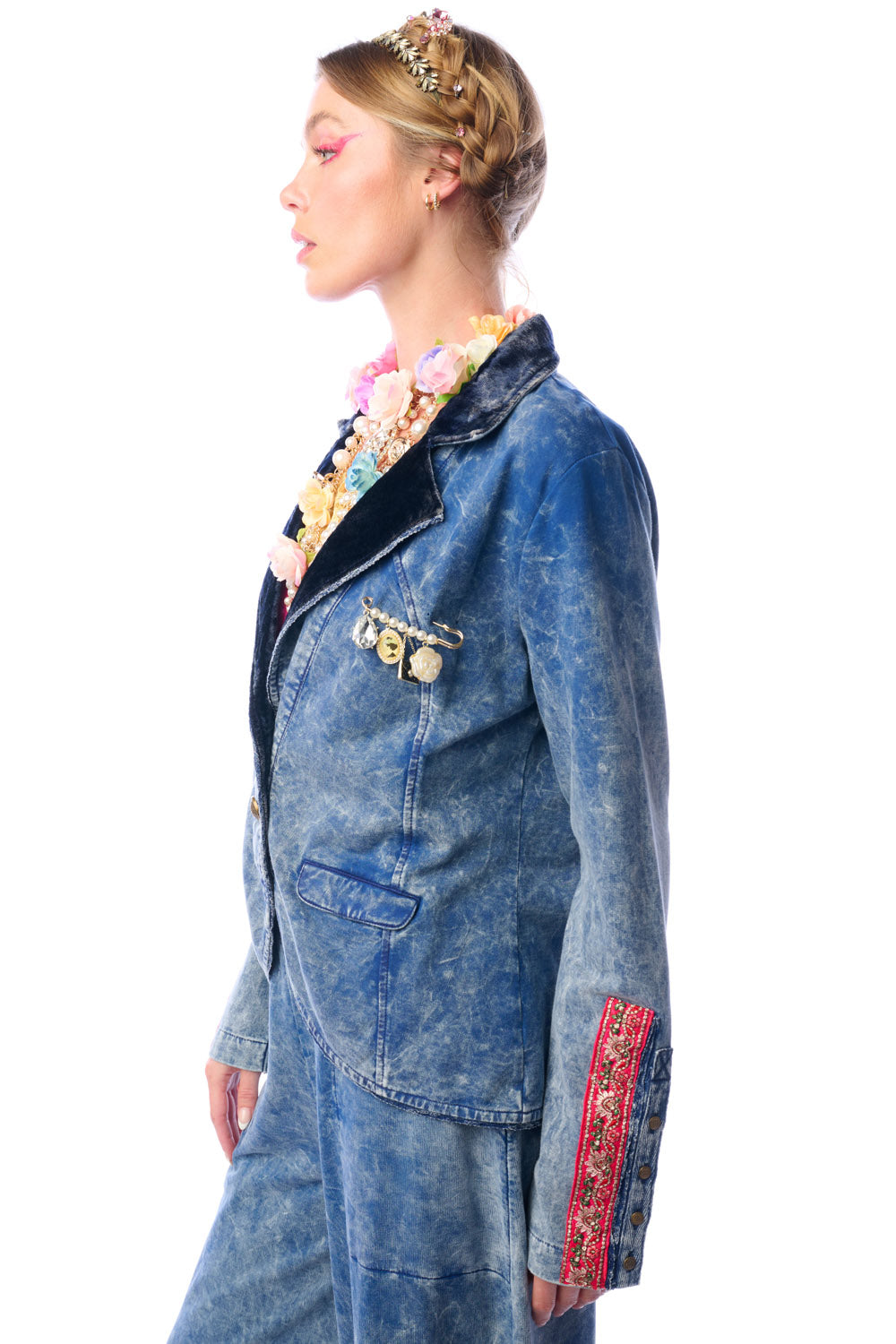 - Washed French terry button-up blazer, embroidered trim sewn on the sleeves, front left with decorative pearl crystal pin, 2 front flap pockets, 2 front metallic buttons