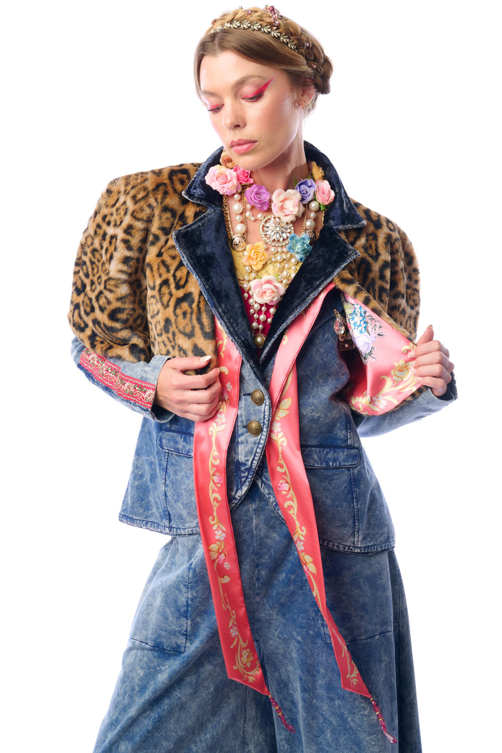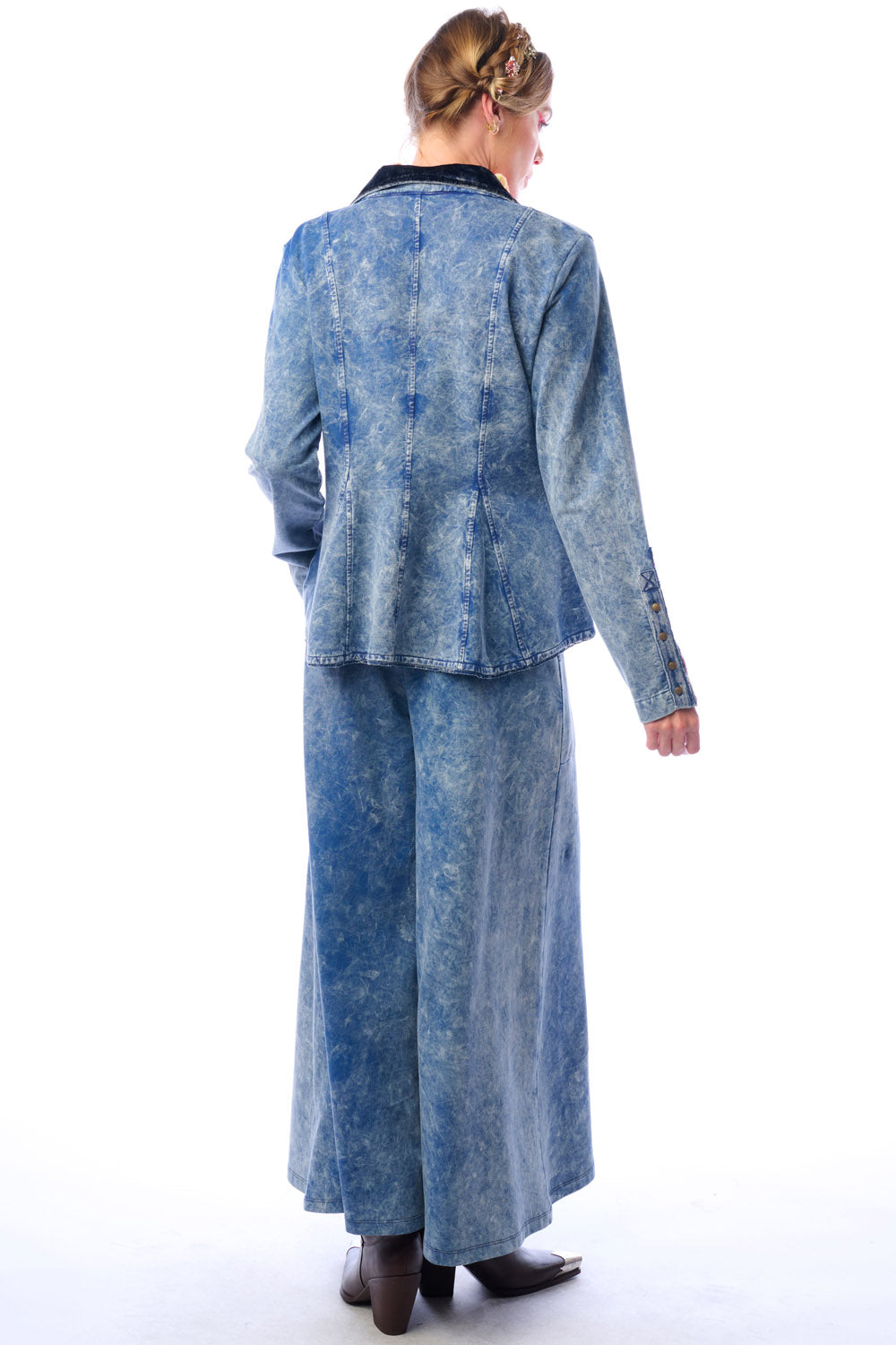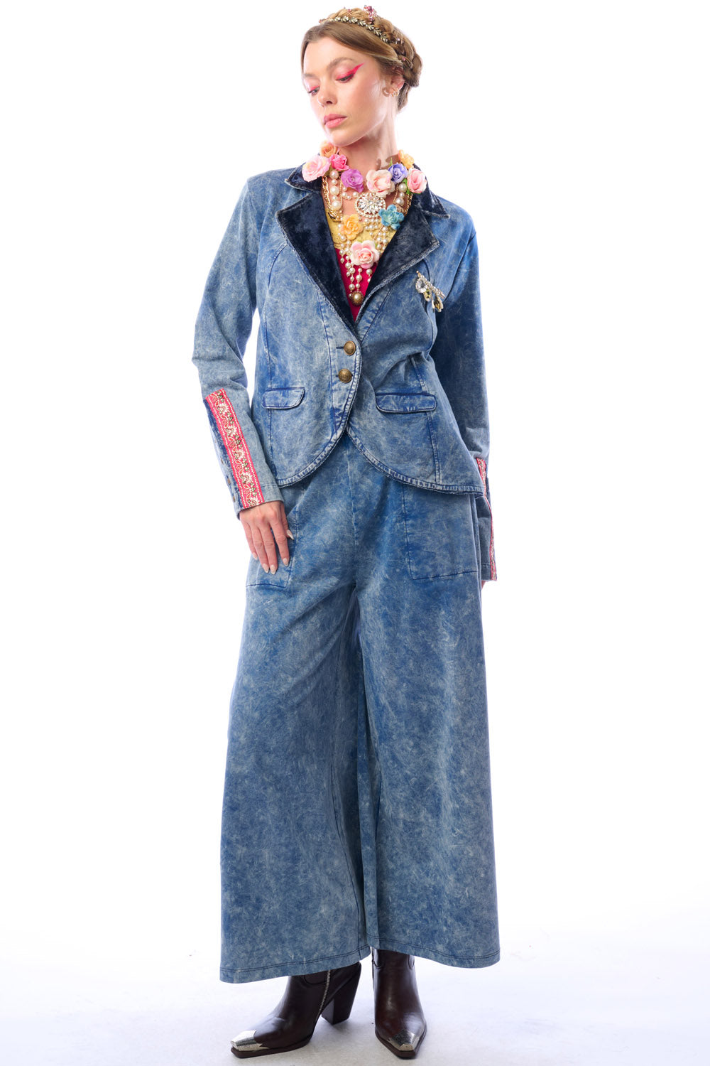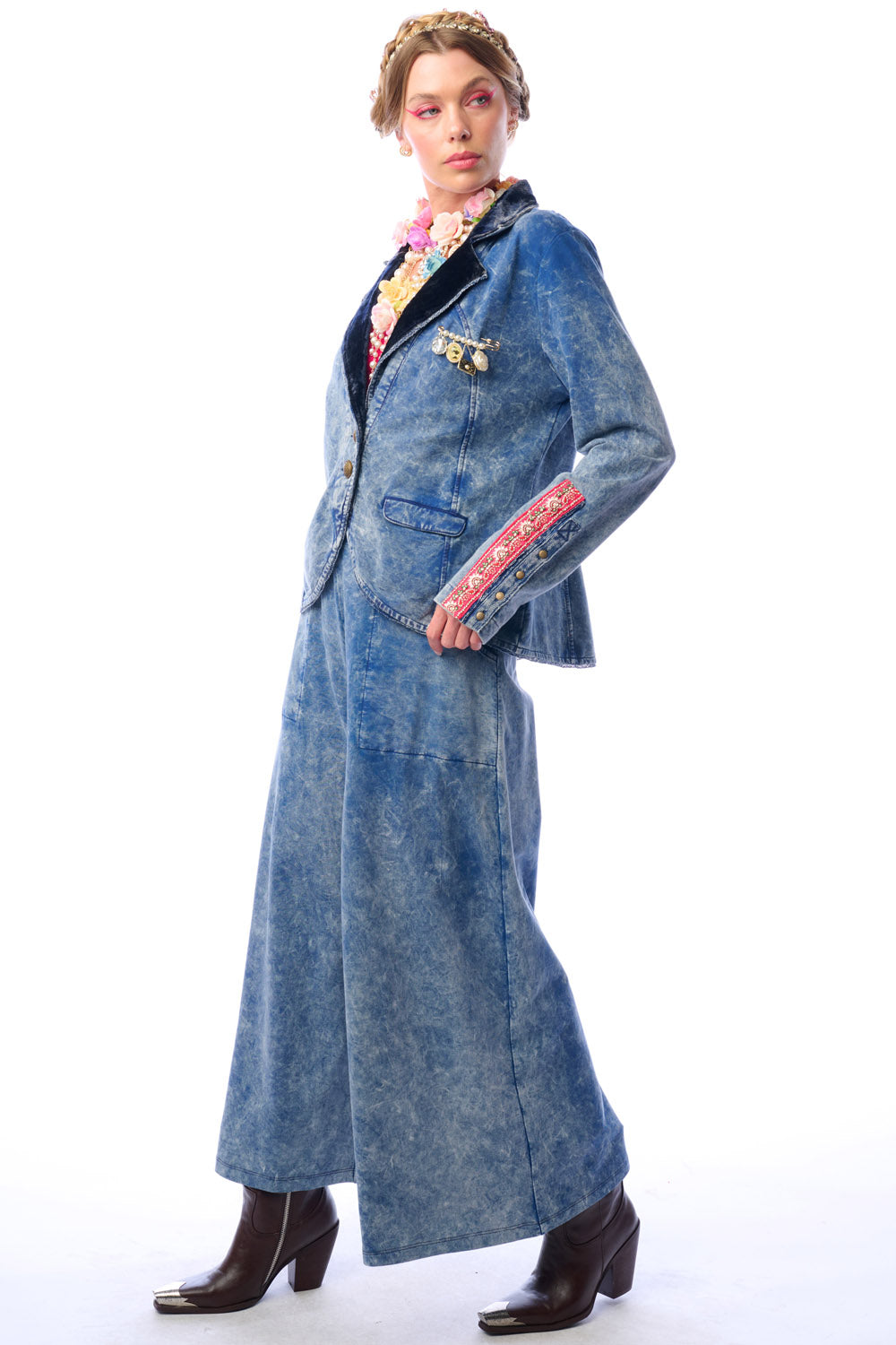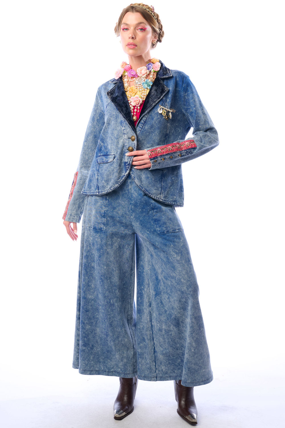 - Washed French terry button-up blazer, embroidered trim sewn on the sleeves, front left with decorative pearl crystal pin, 2 front flap pockets, 2 front metallic buttons