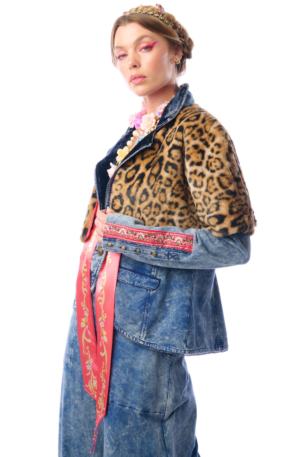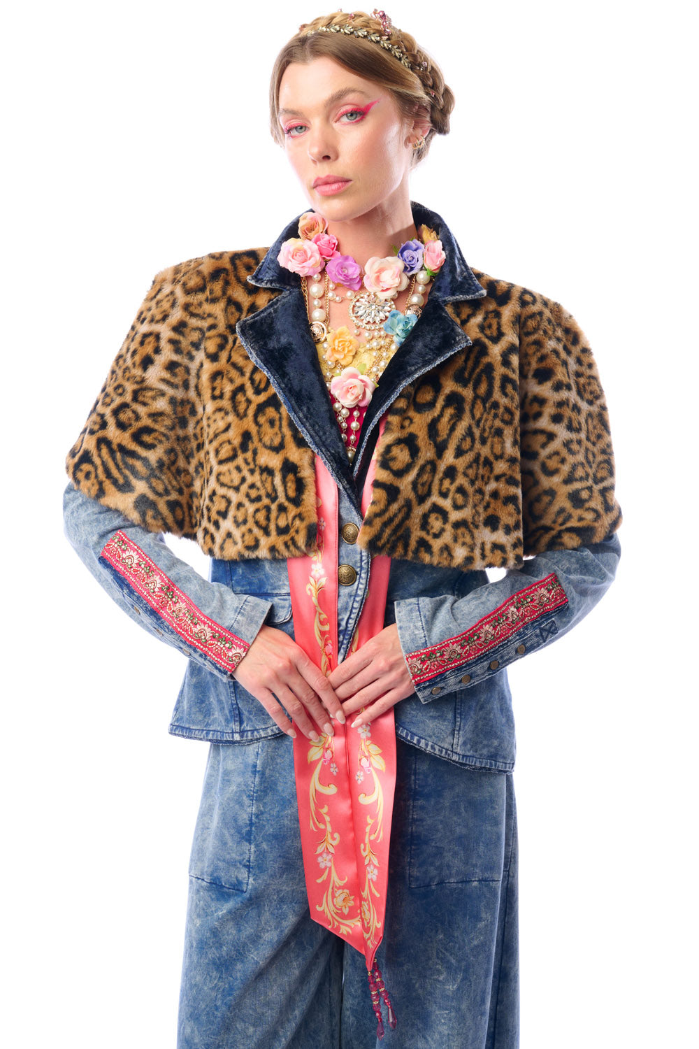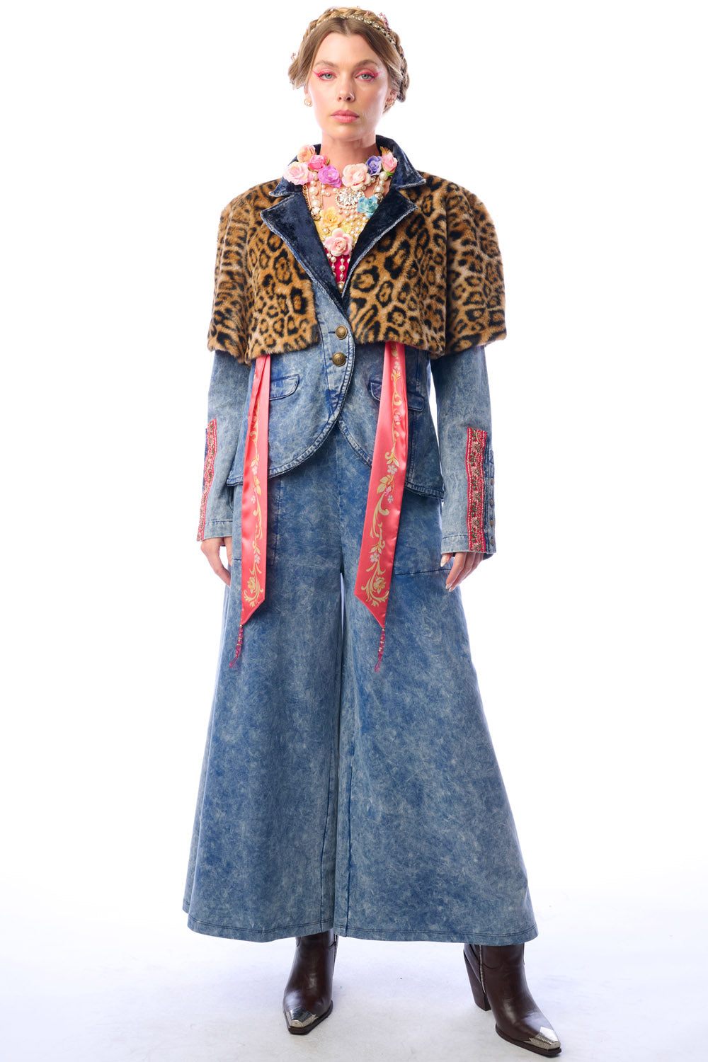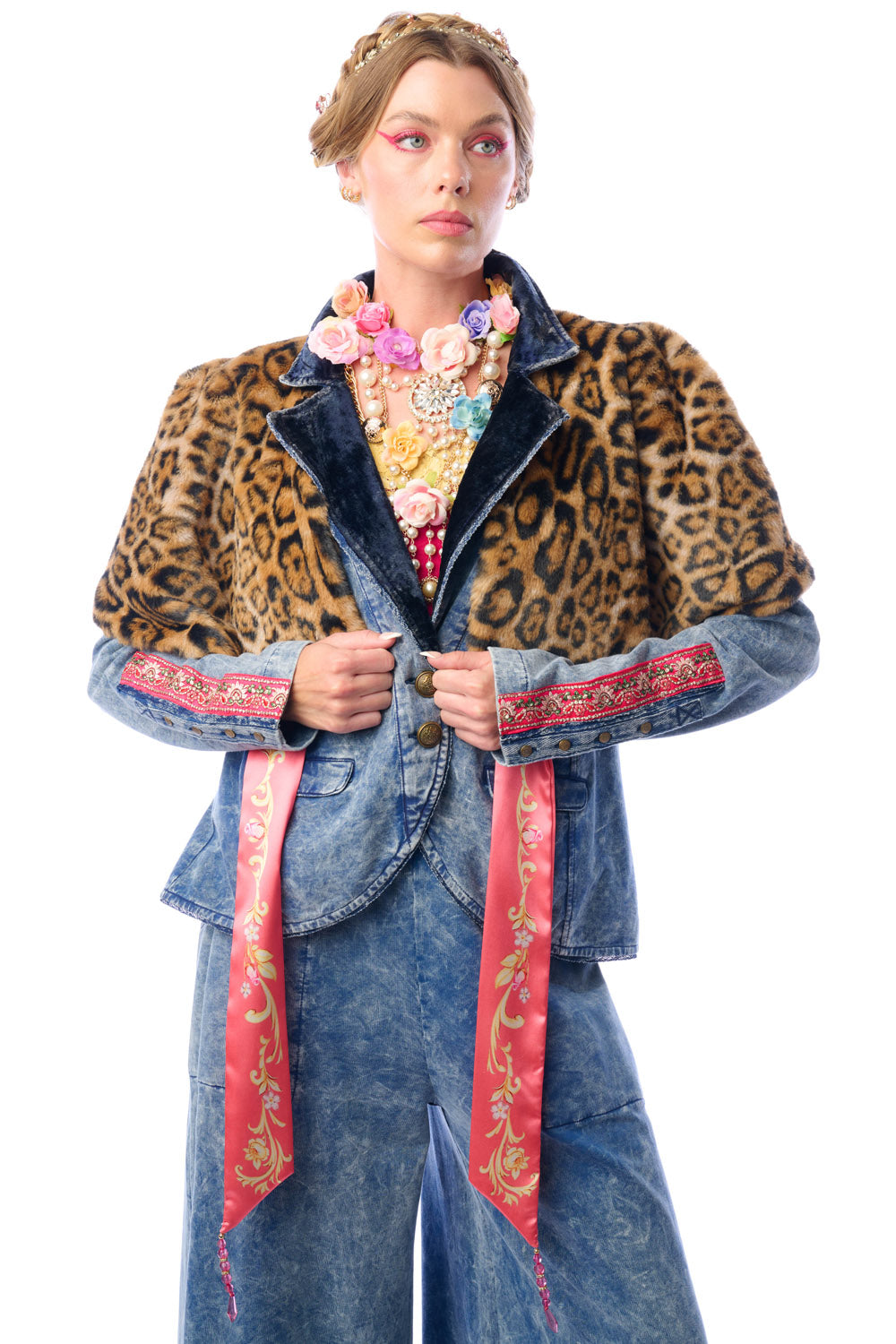 - Washed French terry button-up blazer, embroidered trim sewn on the sleeves, front left with decorative pearl crystal pin, 2 front flap pockets, 2 front metallic buttons