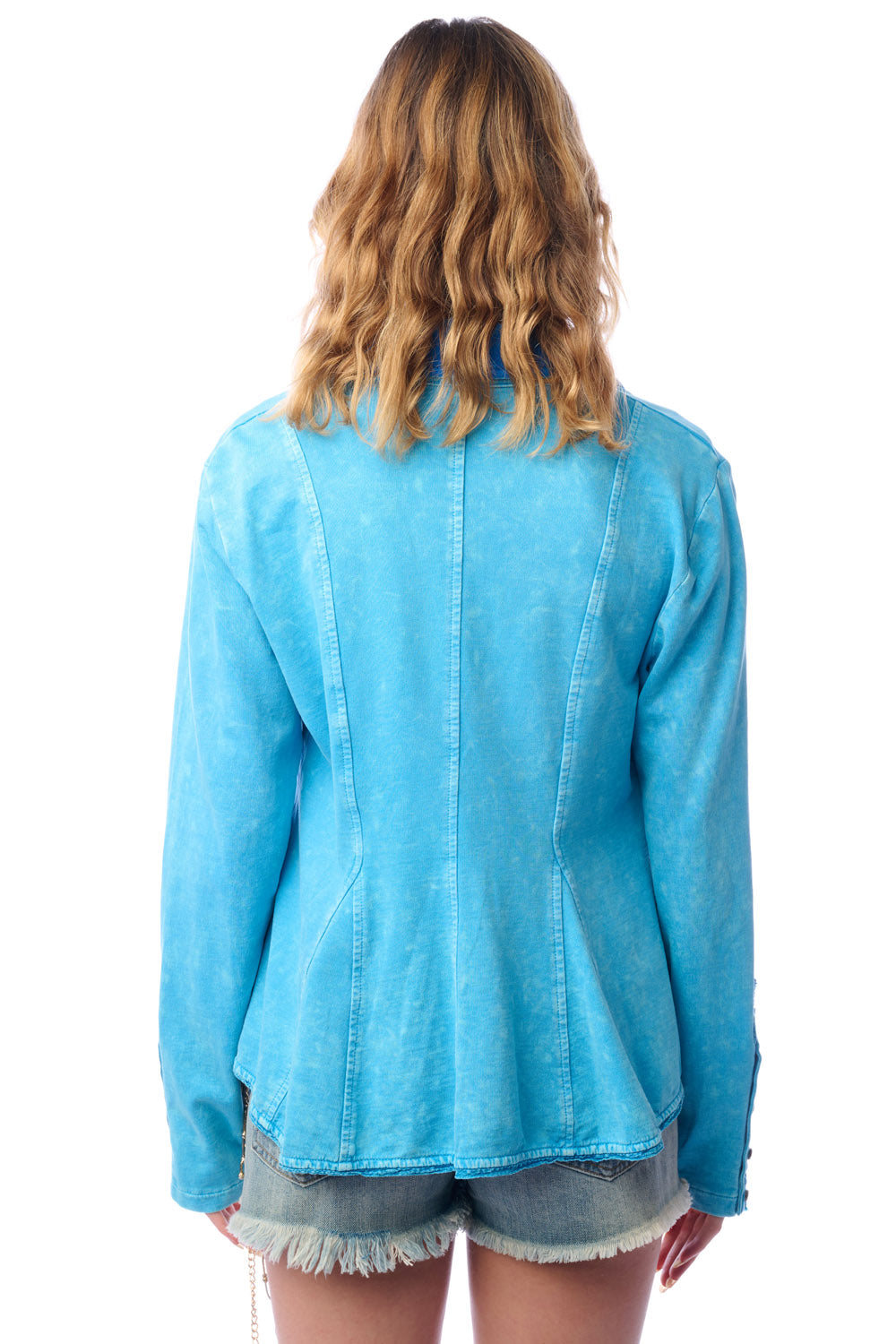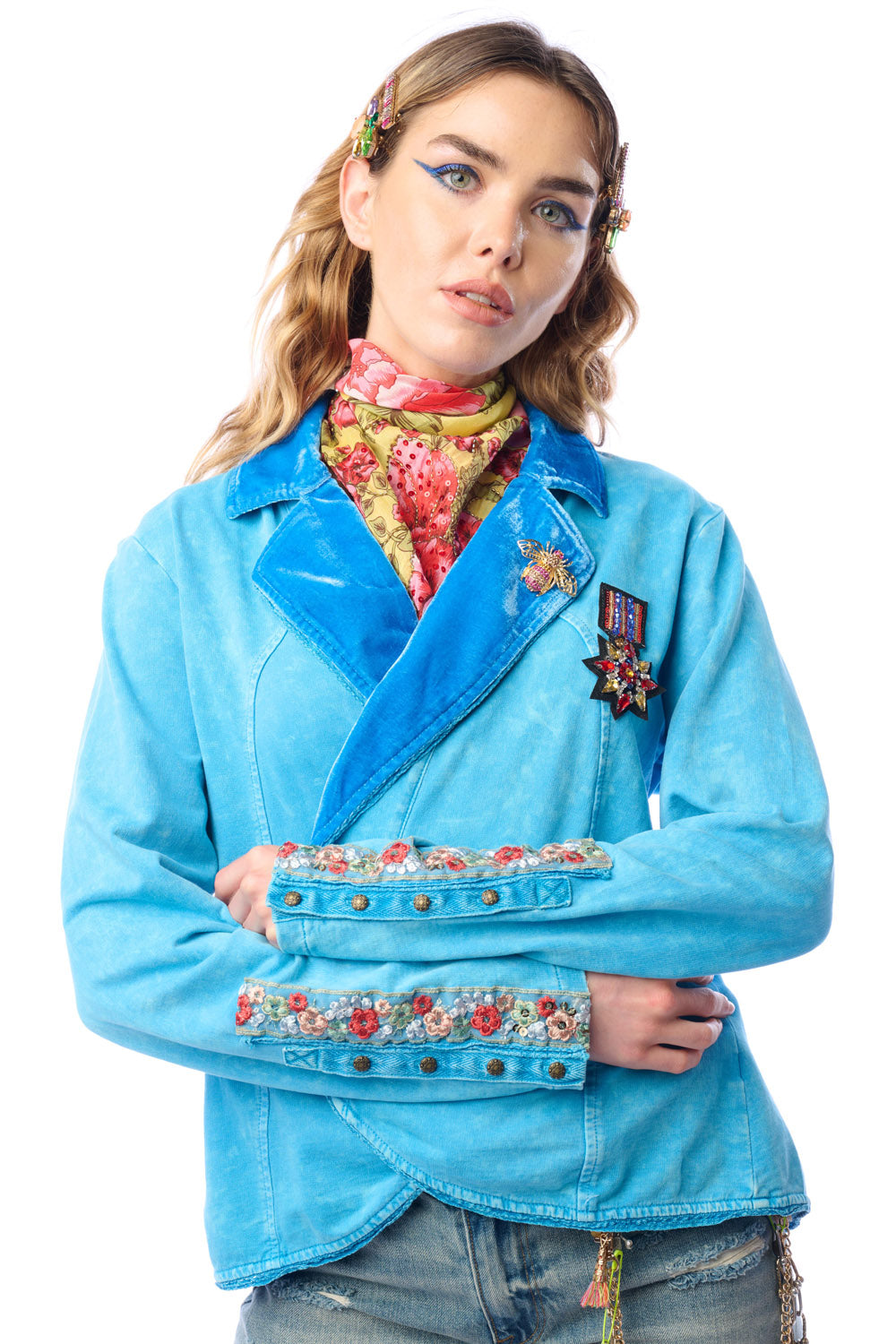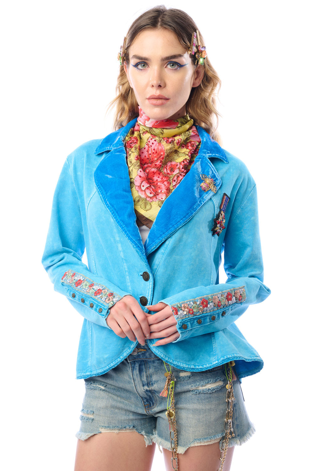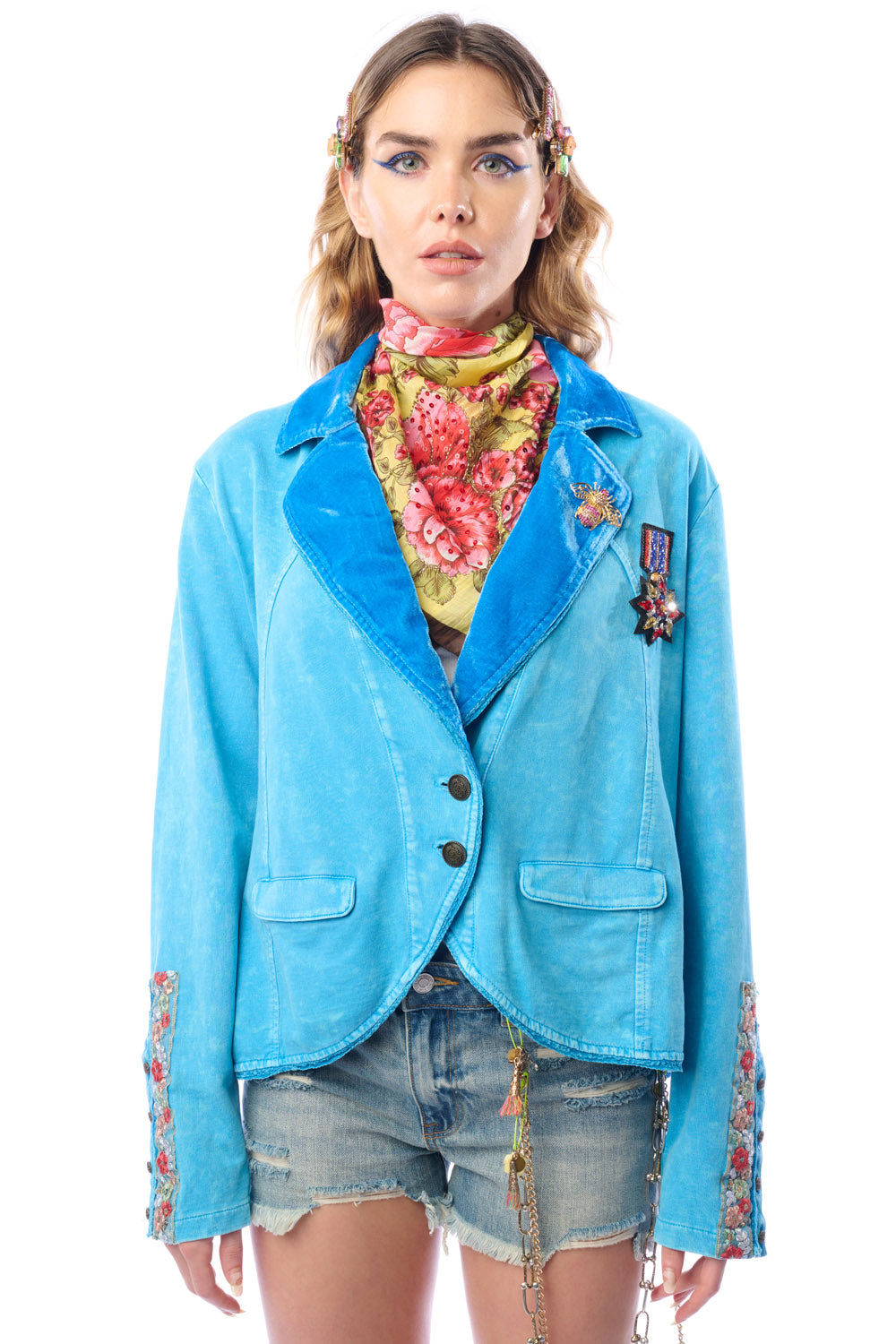 - Washed French terry button-up blazer, embroidered trim sewn on the sleeves, lapel pinned with crystal wasp brooch, 2 front flap pockets, 2 front buttons