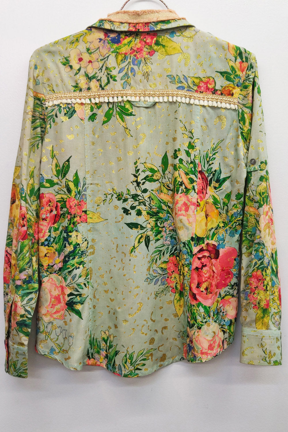- Washed floral print leopard glitter button-down shirt with special trimmings on CF placket, collar, shoulder tabs, and back yoke seam, 2 front flap pockets