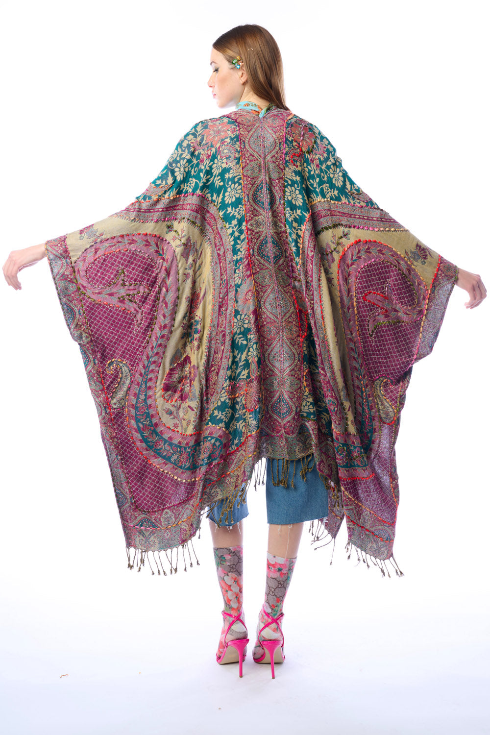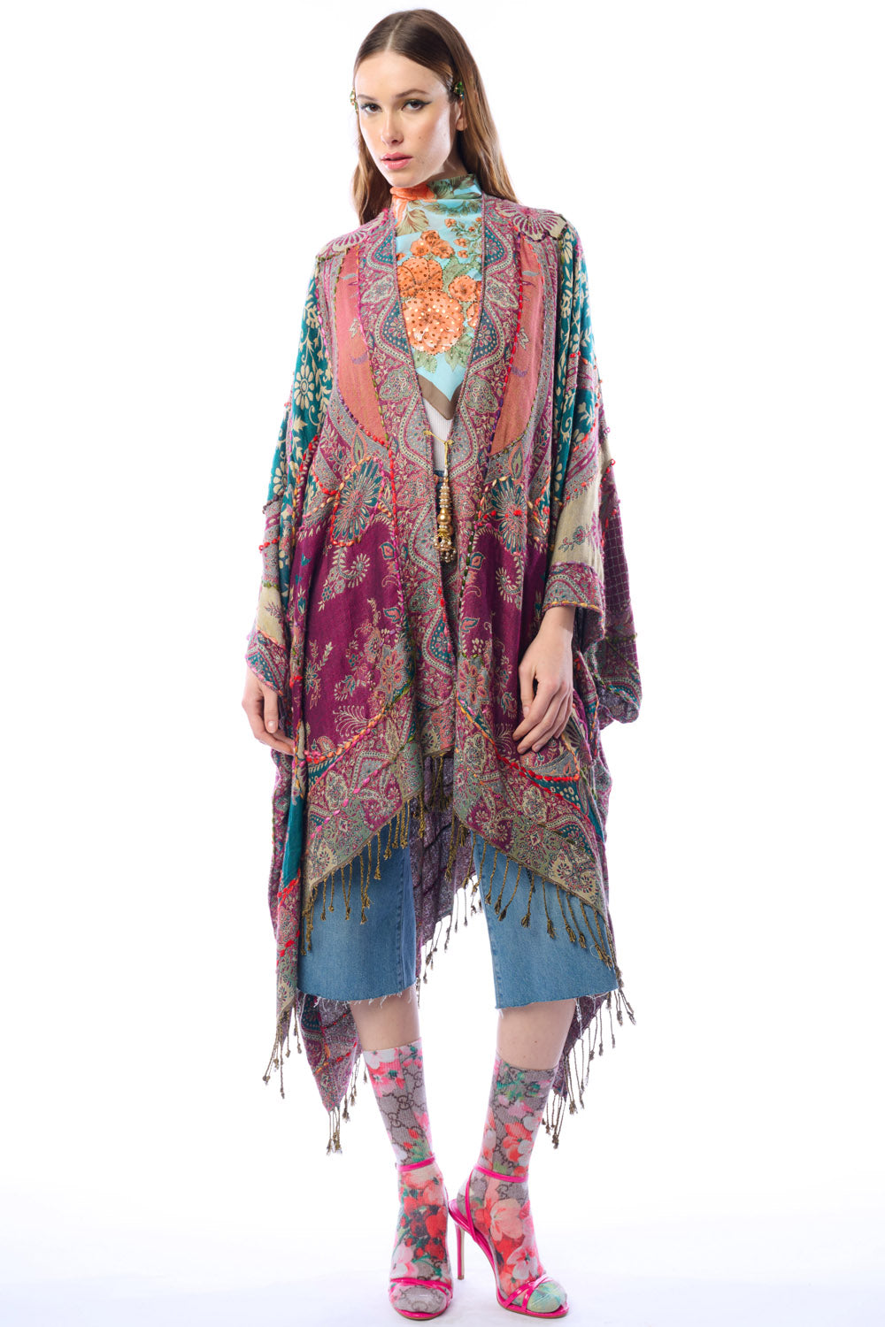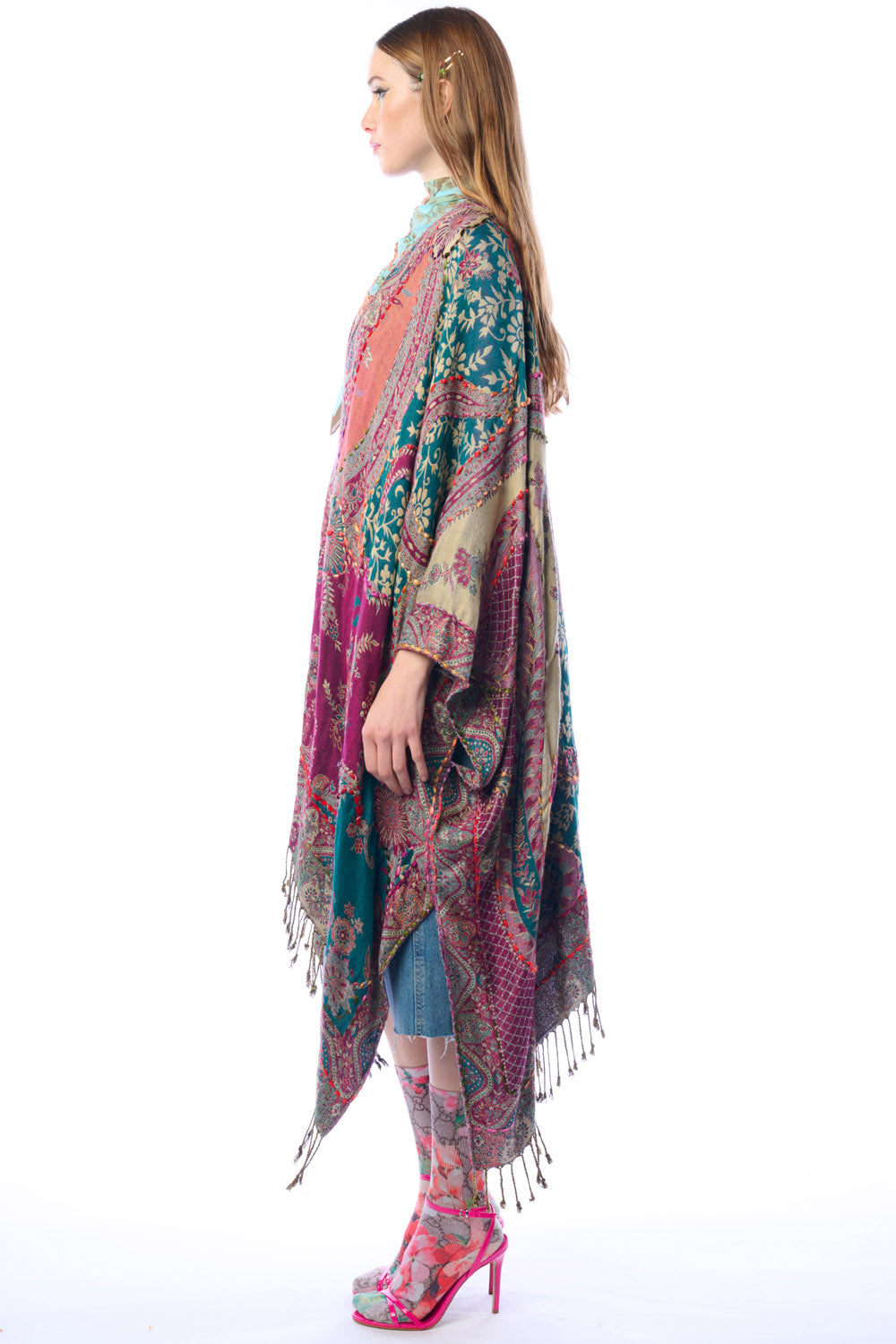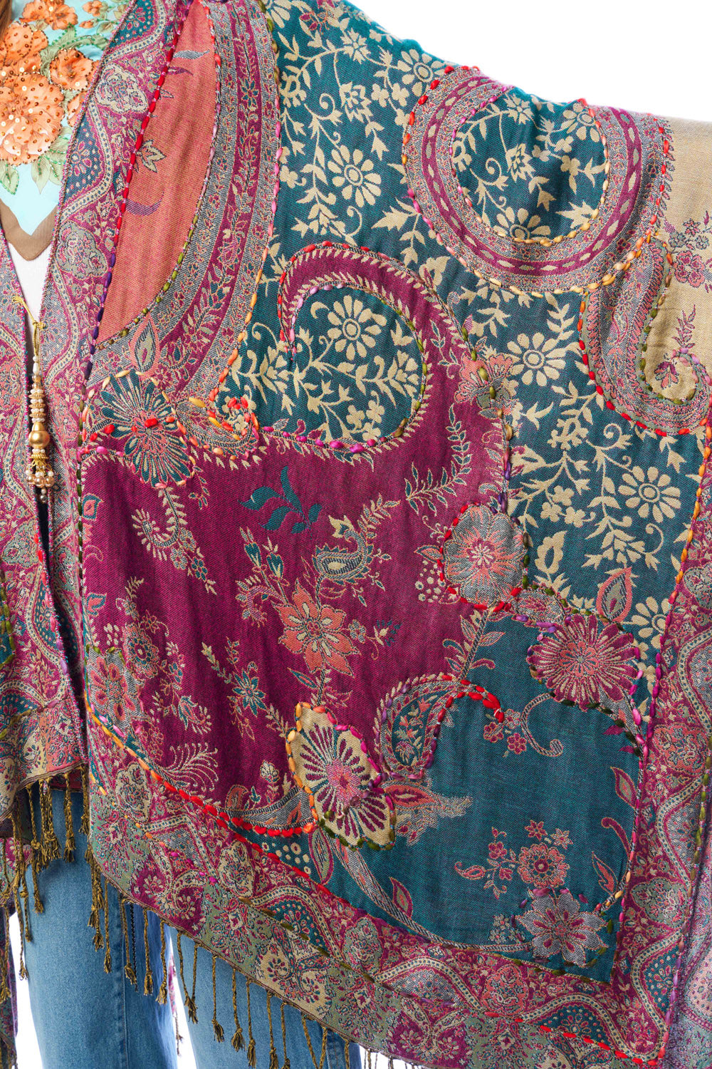 - Hand-stitched paisley floral print kimono with fringe hem, beaded pearl tassel closure on center front