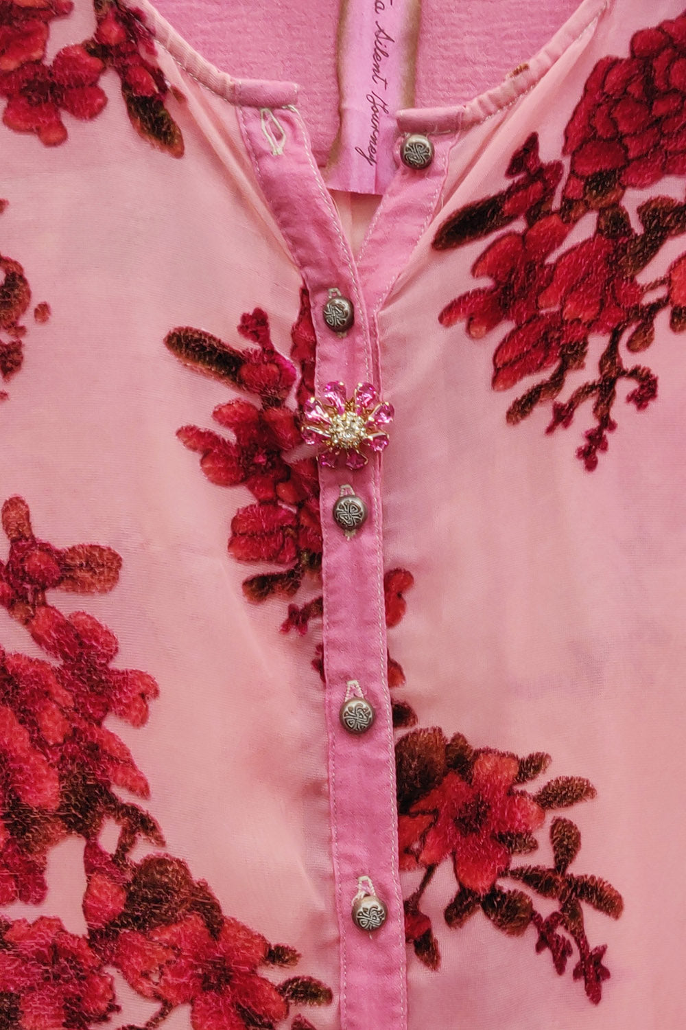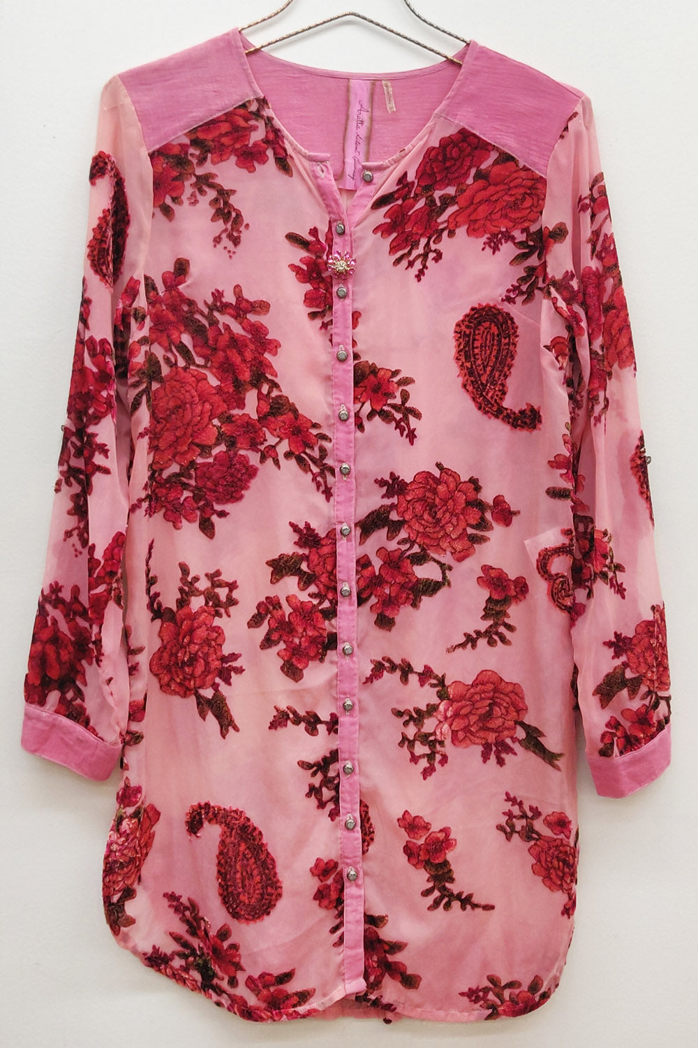 - Washed floral burnout velvet button-up tunic with center back box pleat, center front placket with 1 decorative floral button