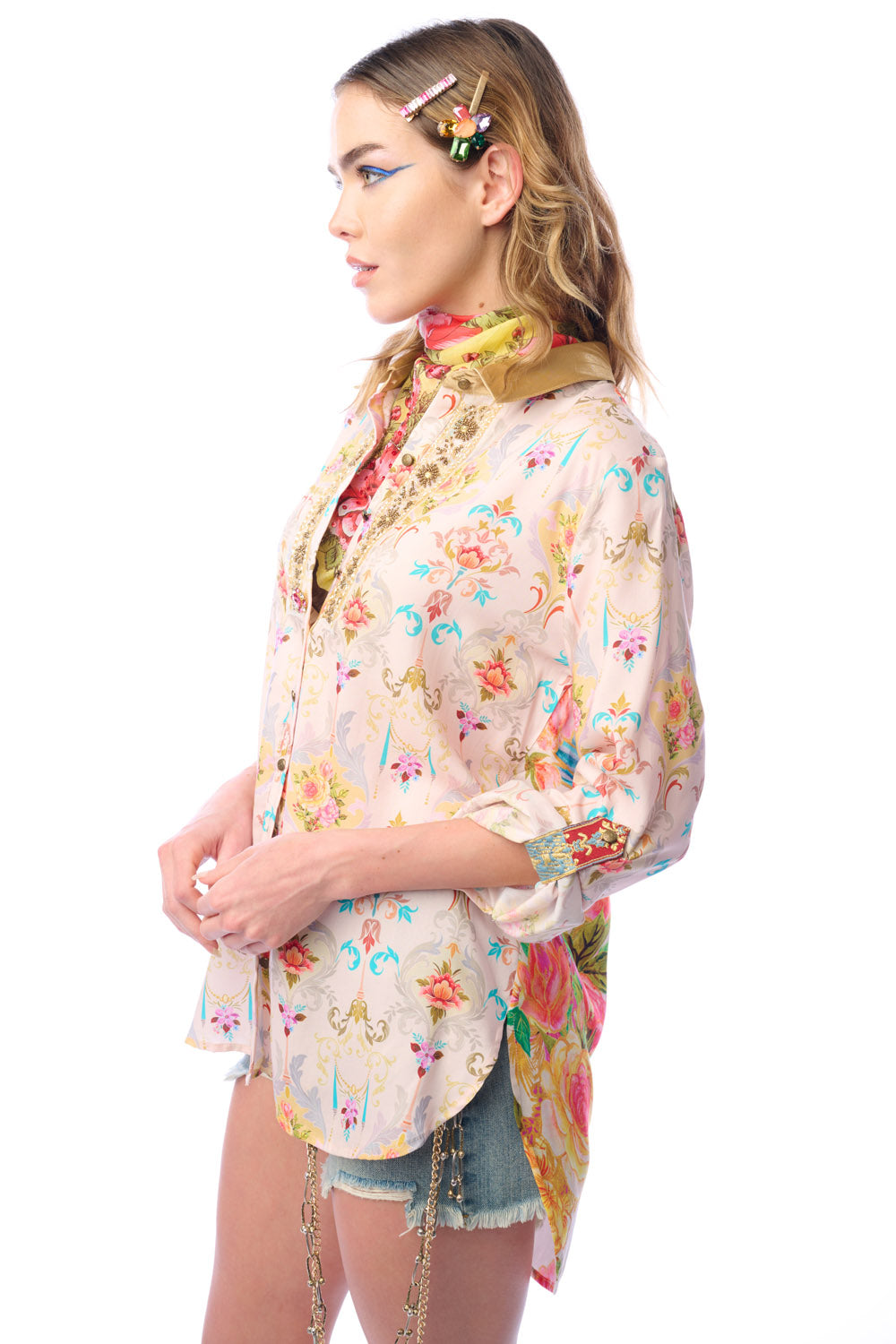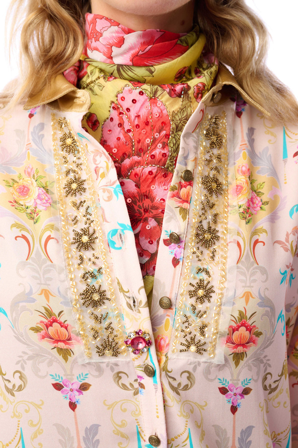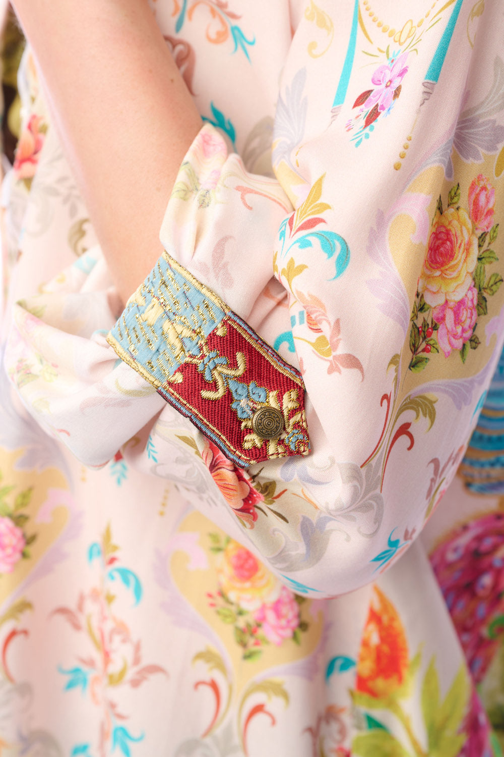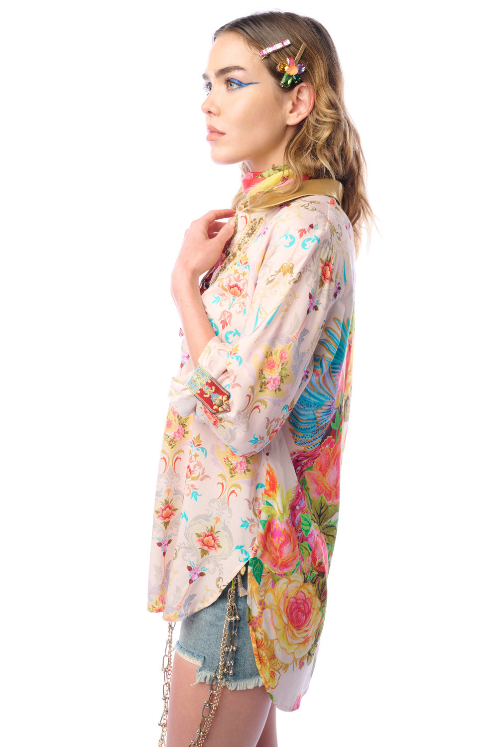 - Floral/peacock print button-up shirt with beaded trim next to the upper CF placket, CF placket with 1 crystal decorative button, jacquard trim roll-over sleeve tabs, high-low hem