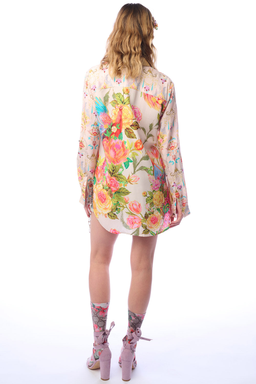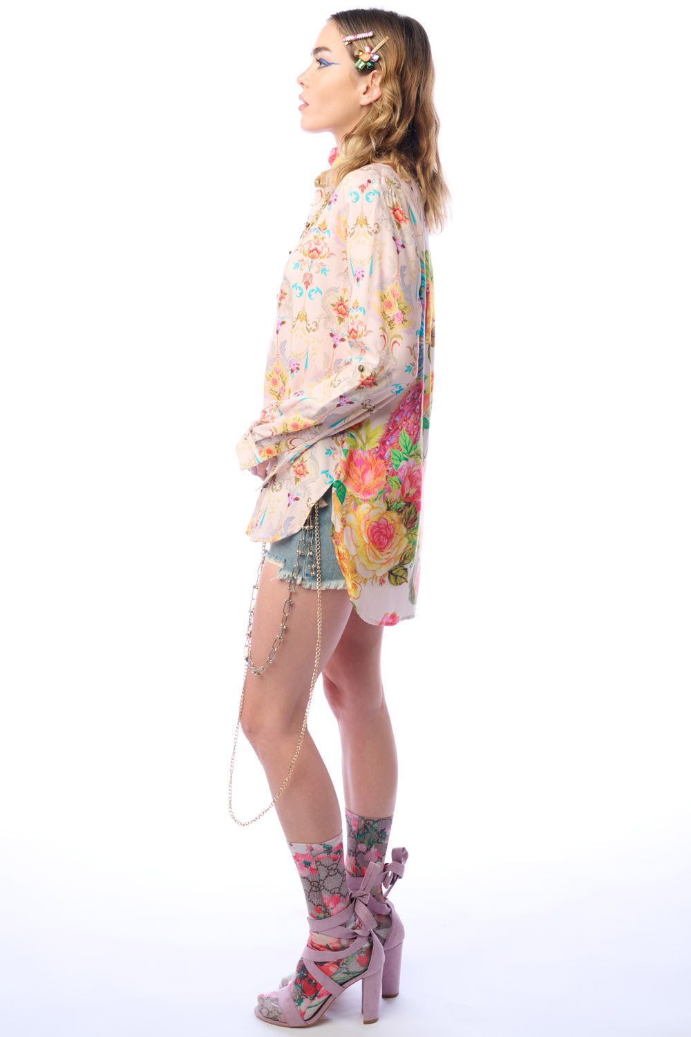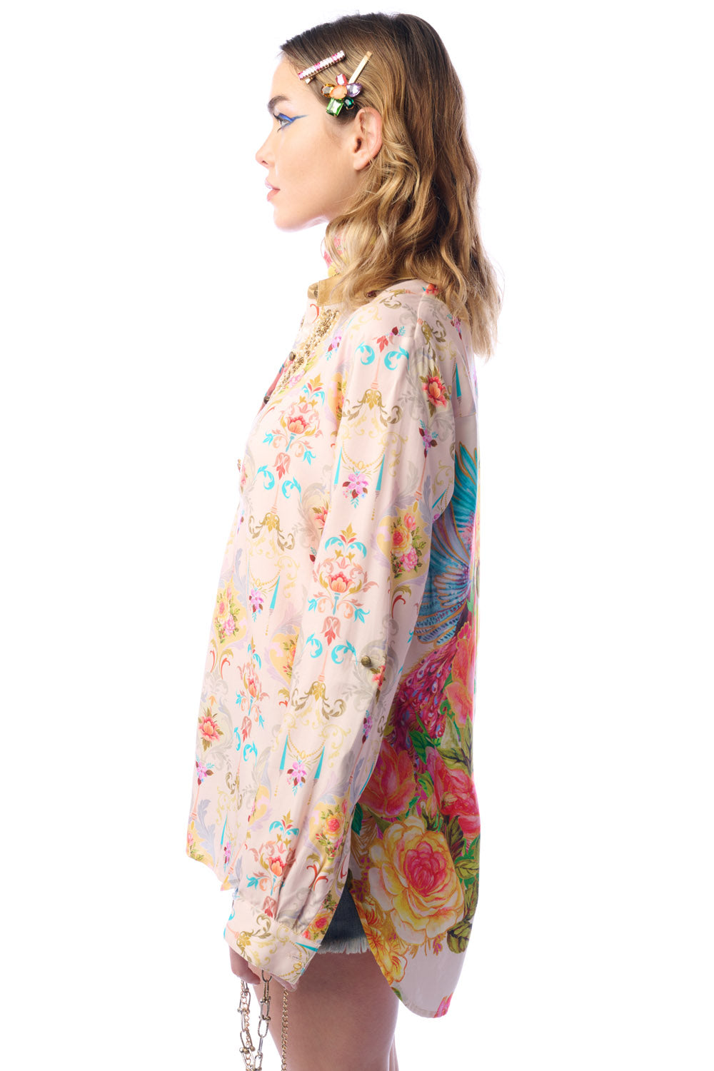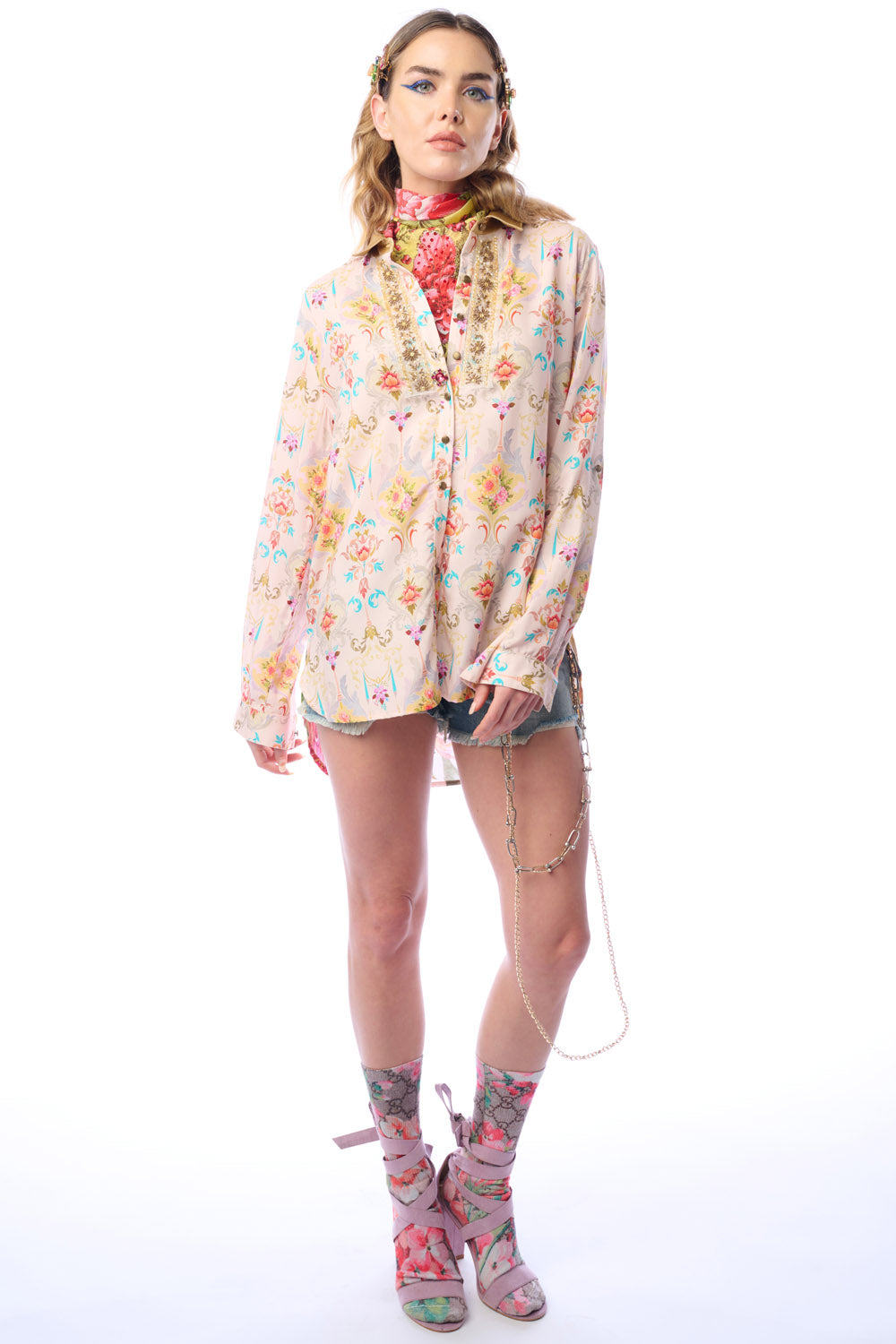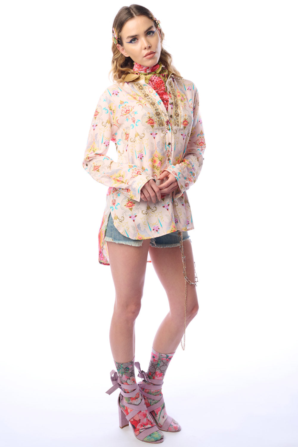 - Floral/peacock print button-up shirt with beaded trim next to the upper CF placket, CF placket with 1 crystal decorative button, jacquard trim roll-over sleeve tabs, high-low hem