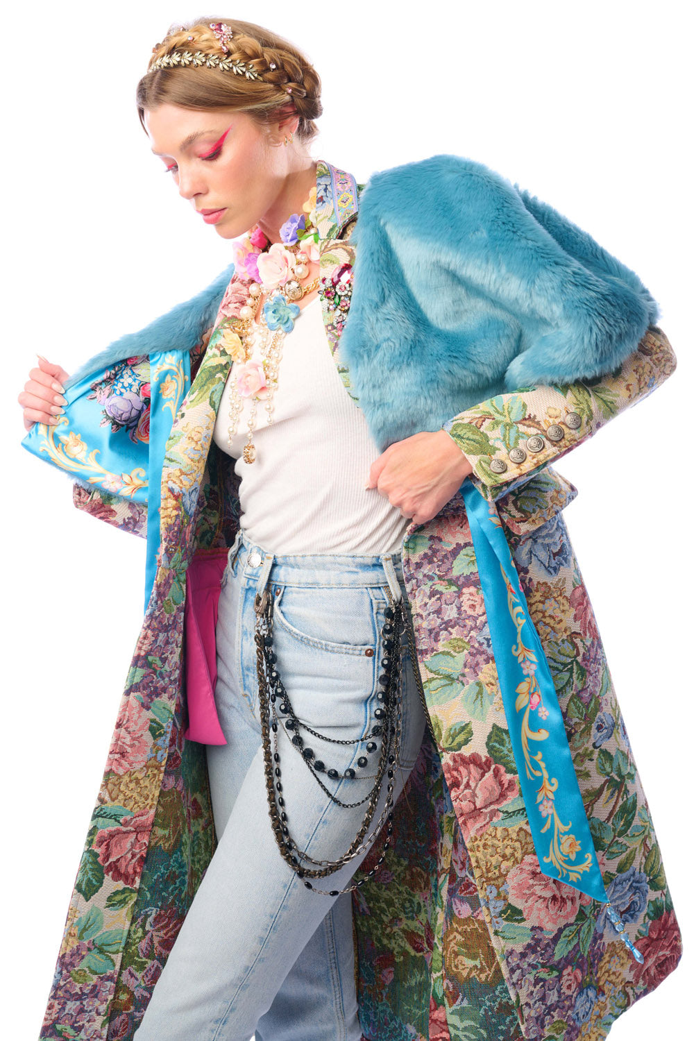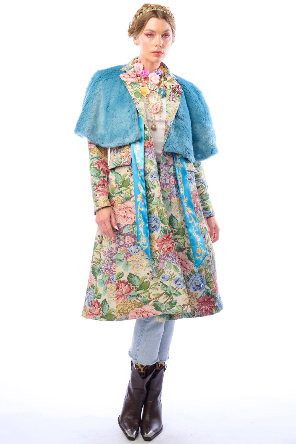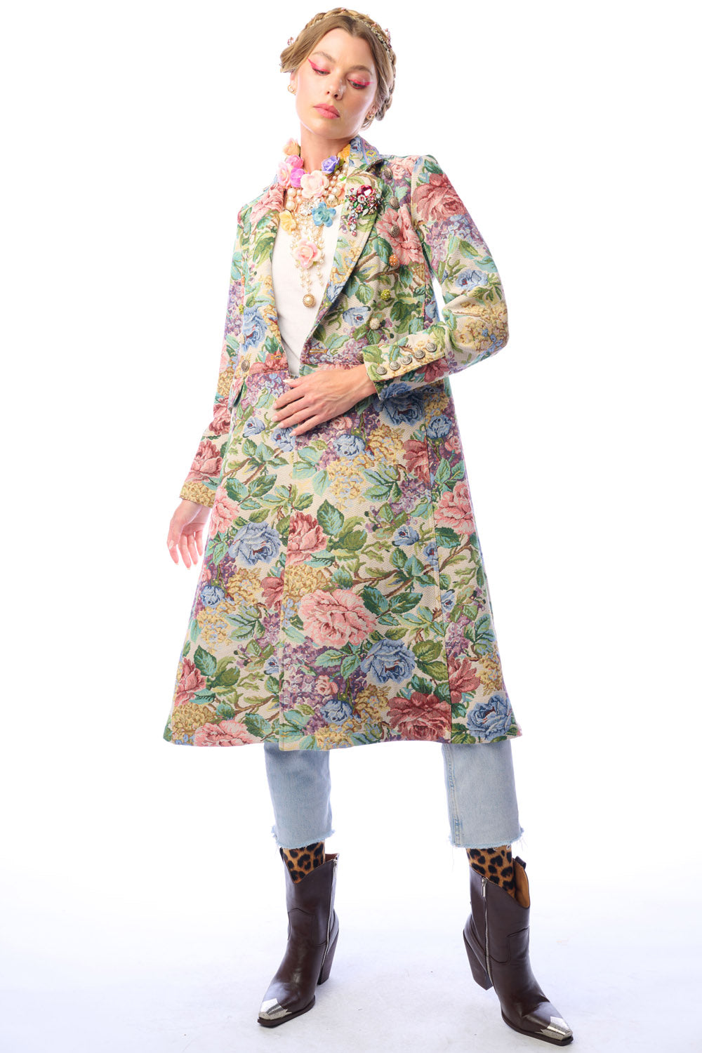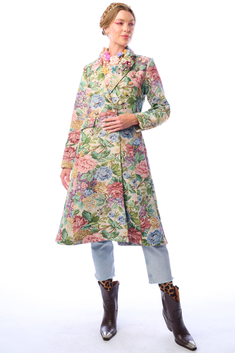 - Floral jacquard coat with 1 removable crystal brooch pinned on lapel, jacquard trim sewn on collar, brass buttons and floral crystal buttons, 2 front flap pockets, back slit