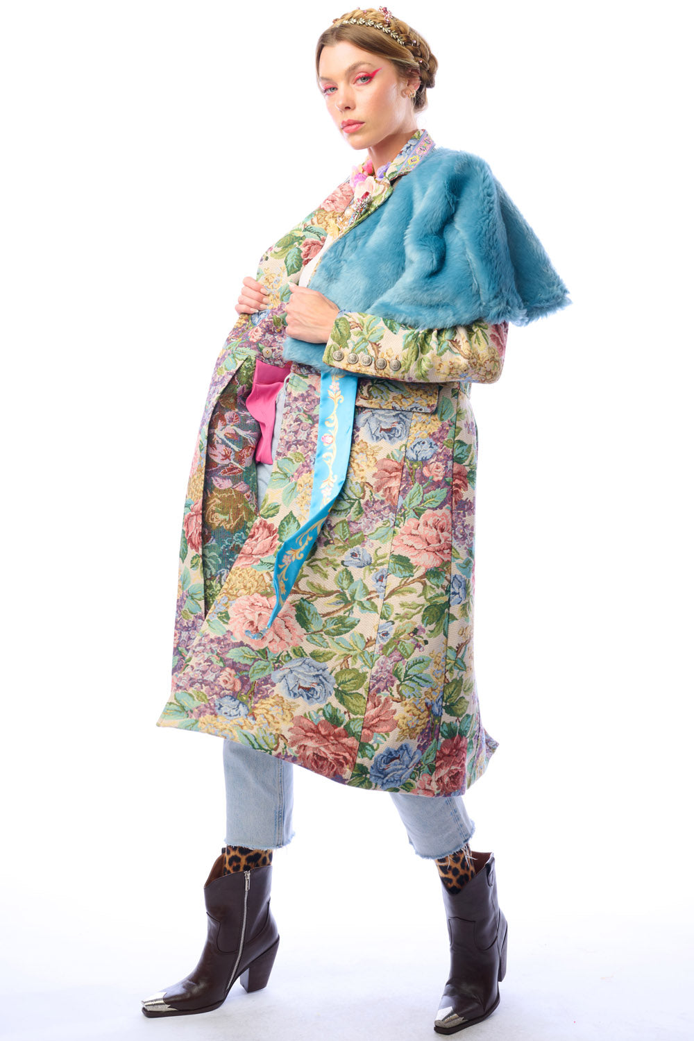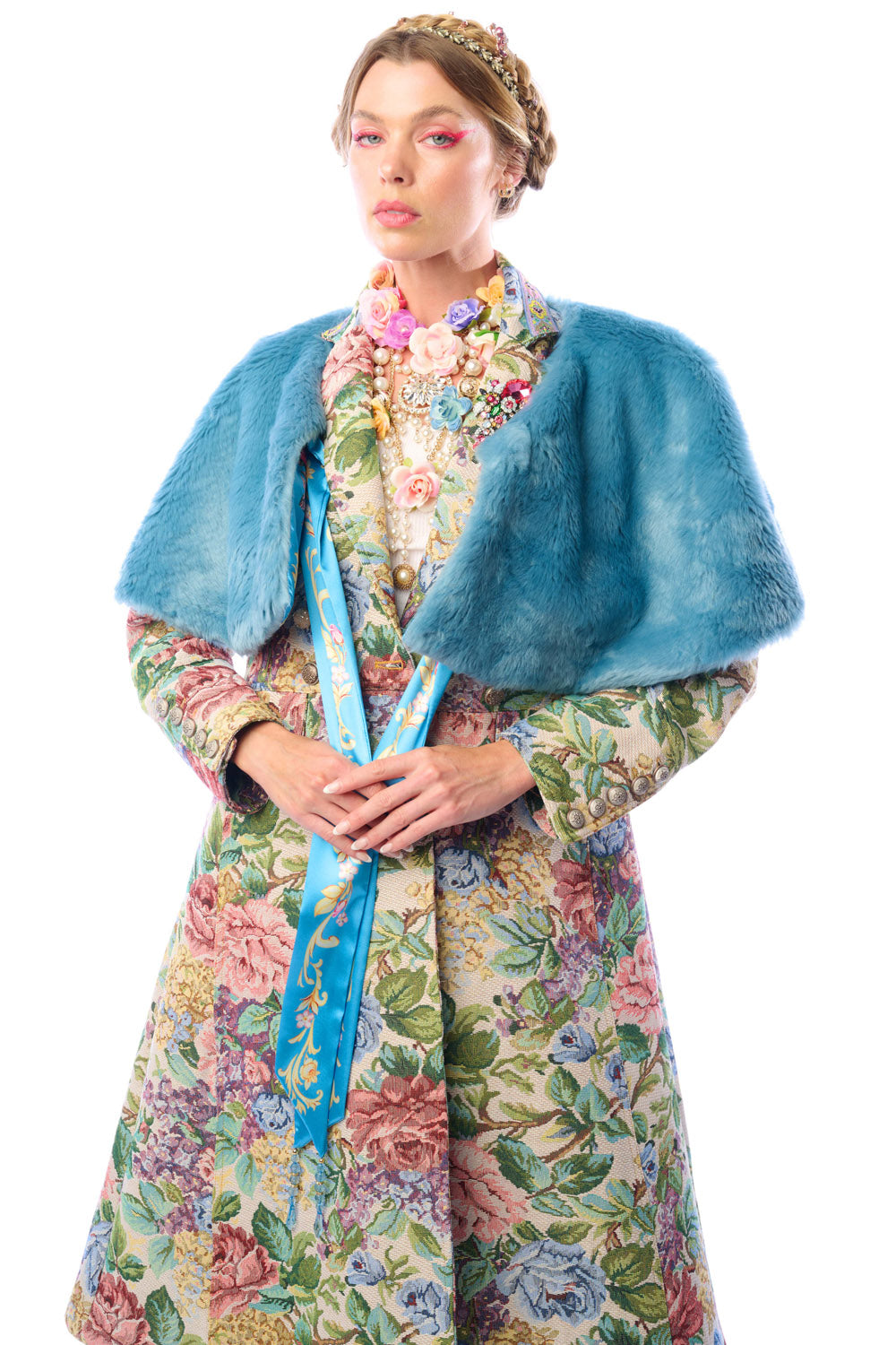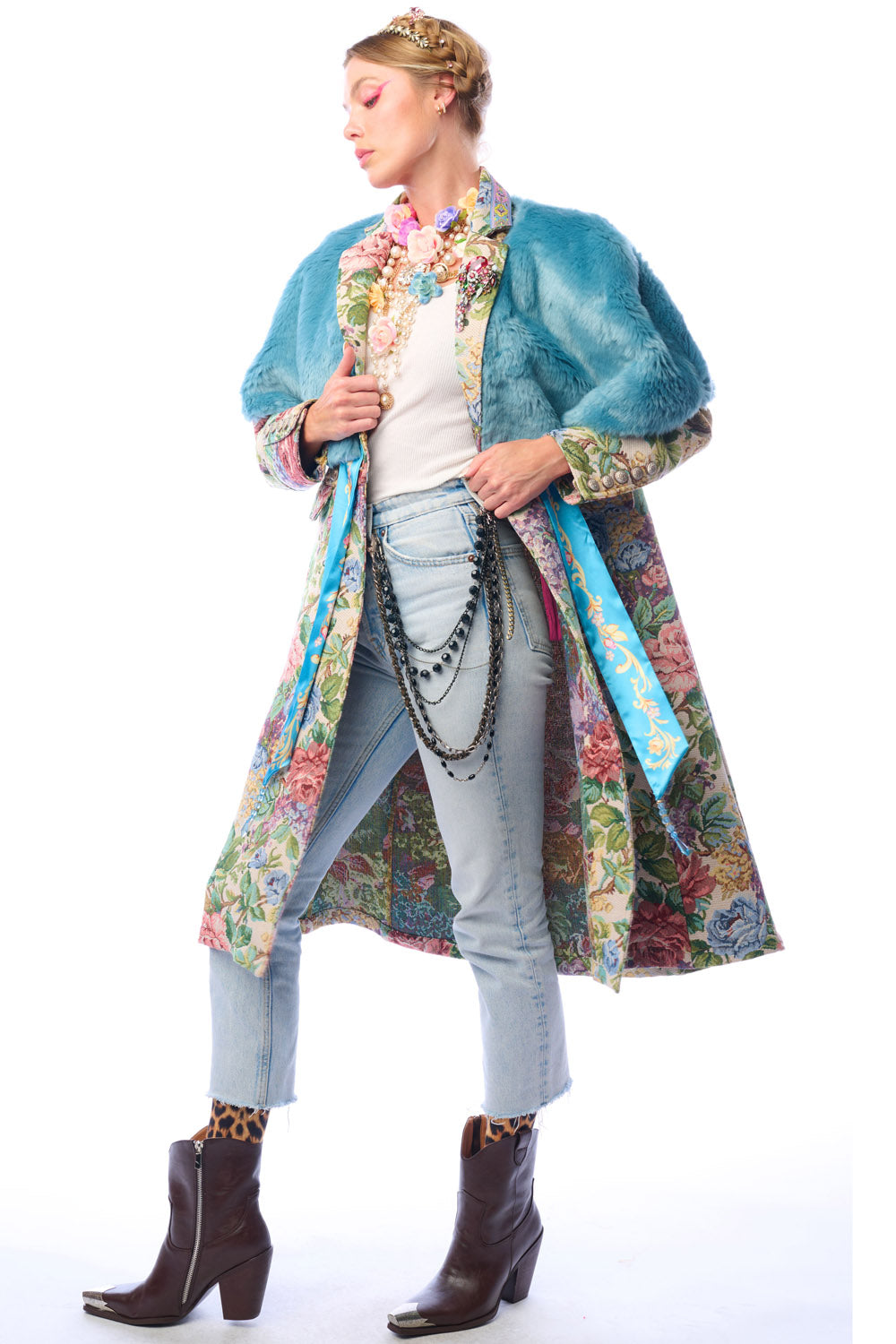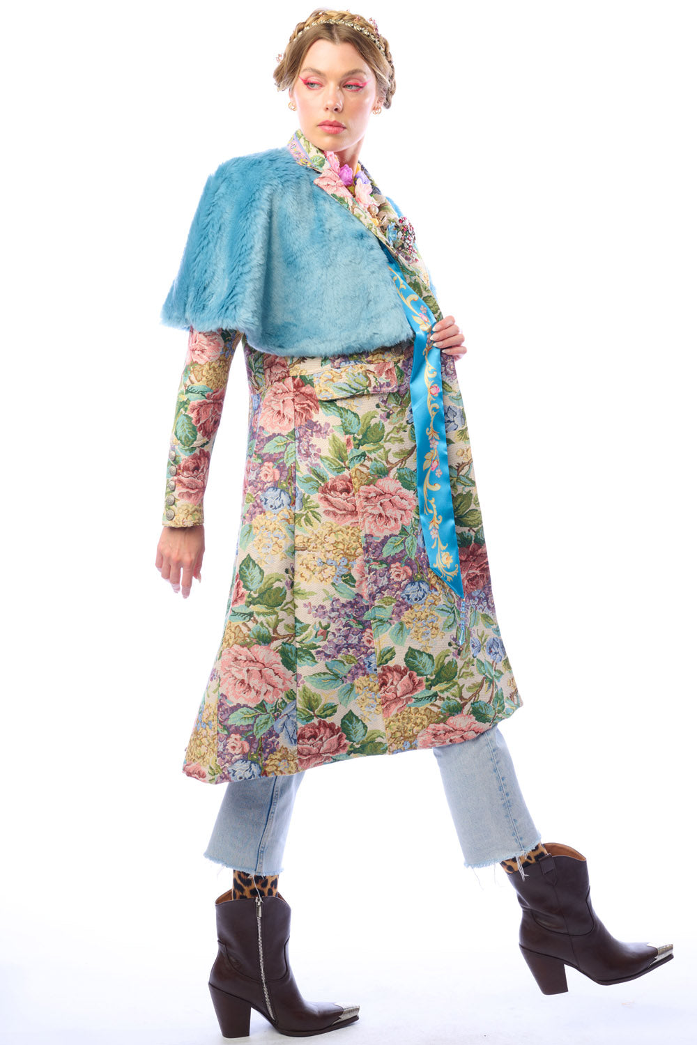 - Floral jacquard coat with 1 removable crystal brooch pinned on lapel, jacquard trim sewn on collar, brass buttons and floral crystal buttons, 2 front flap pockets, back slit