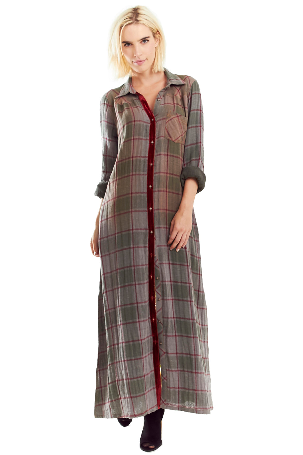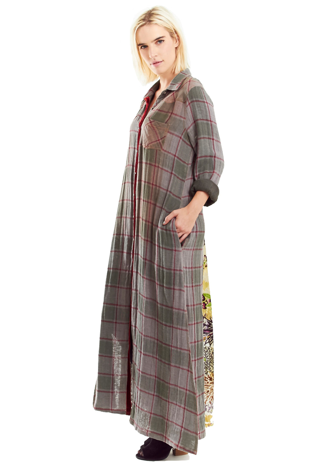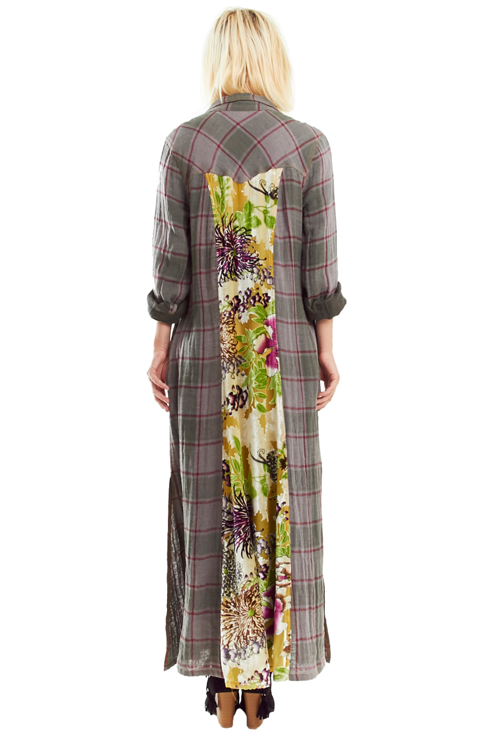 - Washed plaid button-up duster, floral burnout velvet on center back, velvet center front placket, 1 front pocket, 2 side pockets, side slits