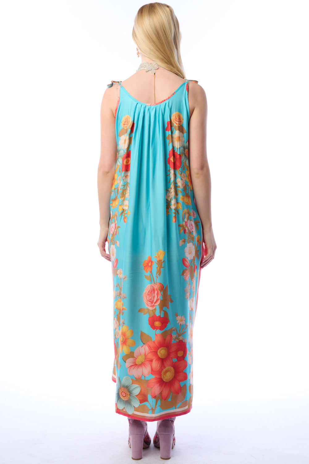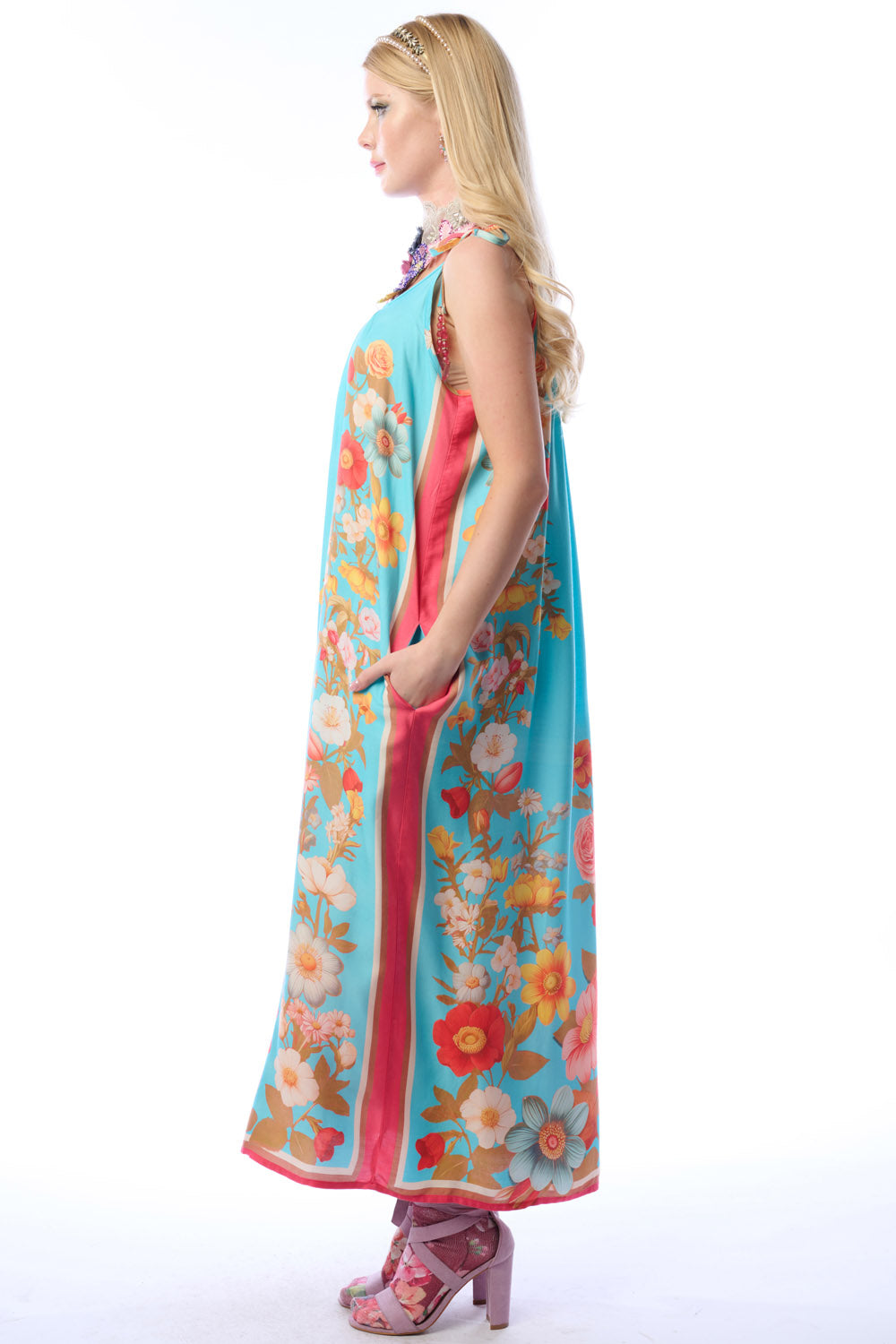 - Washed floral/stripes border print maxi dress, pleated front & back neck, shoulder ties with crystal tassels, 2 side pockets