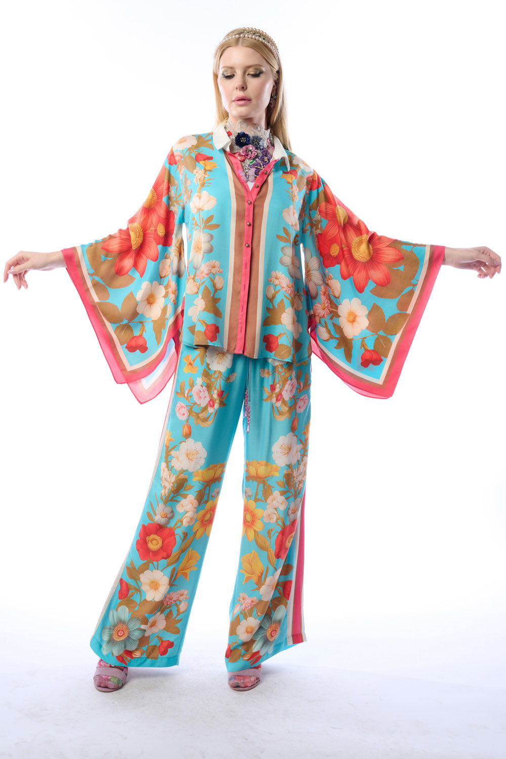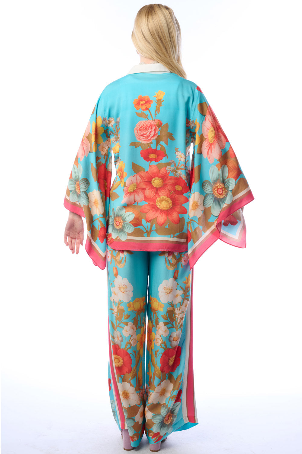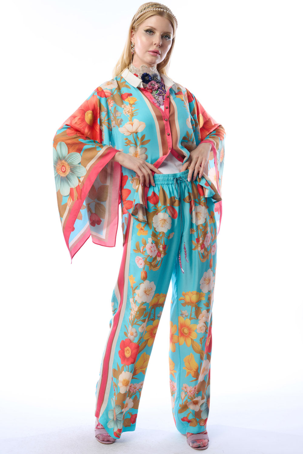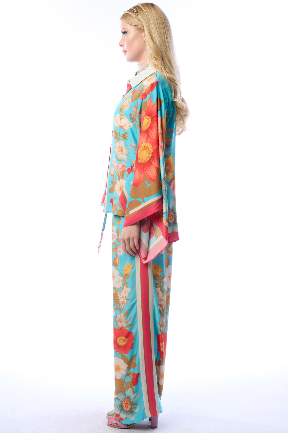 - Washed floral print wide leg elastic waist pants with beaded crystal tassel drawstring, stripes on sides, 2 side front pockets