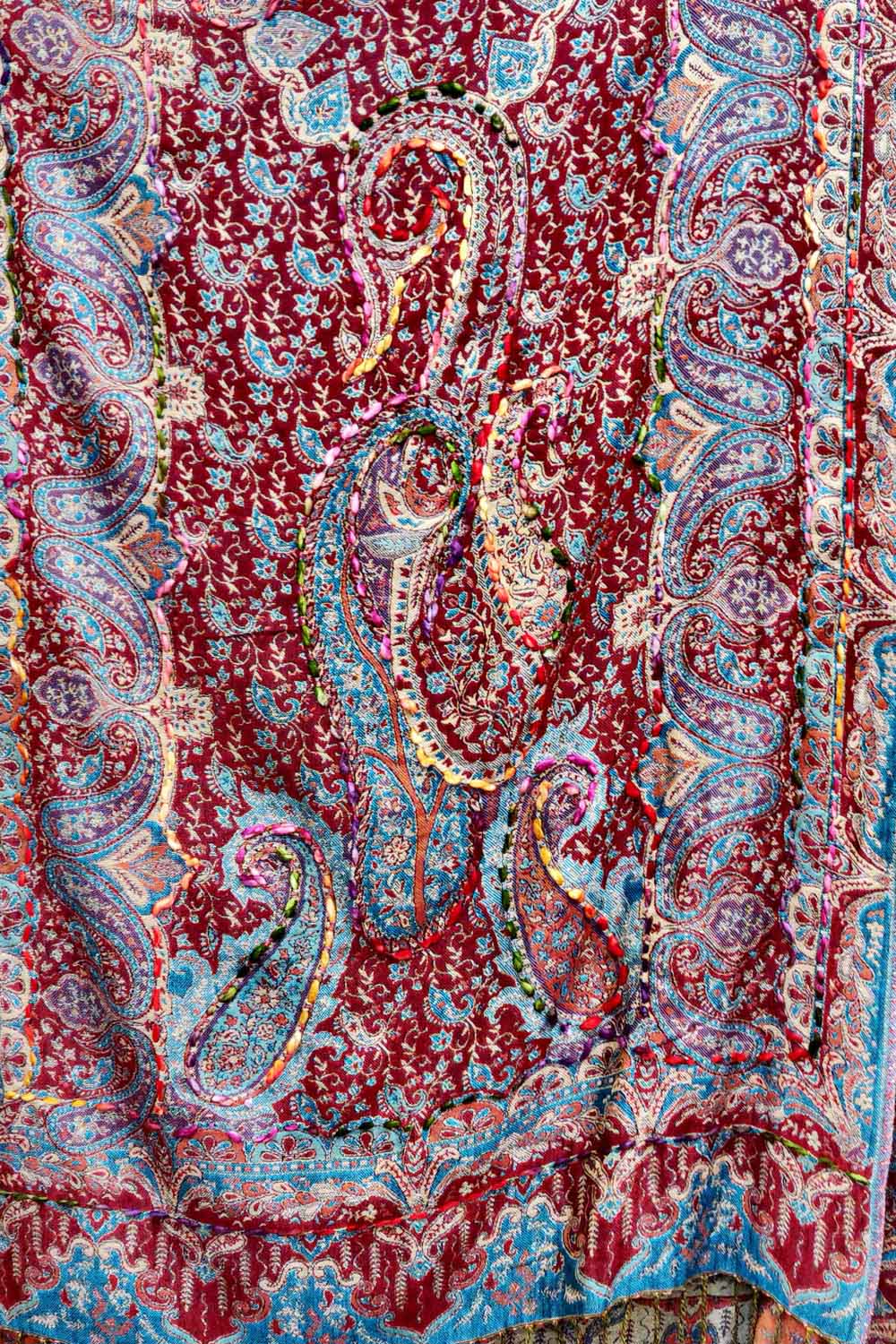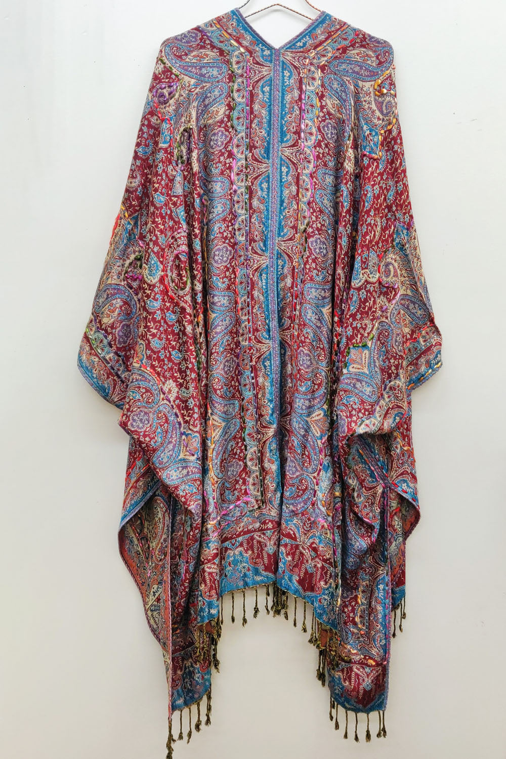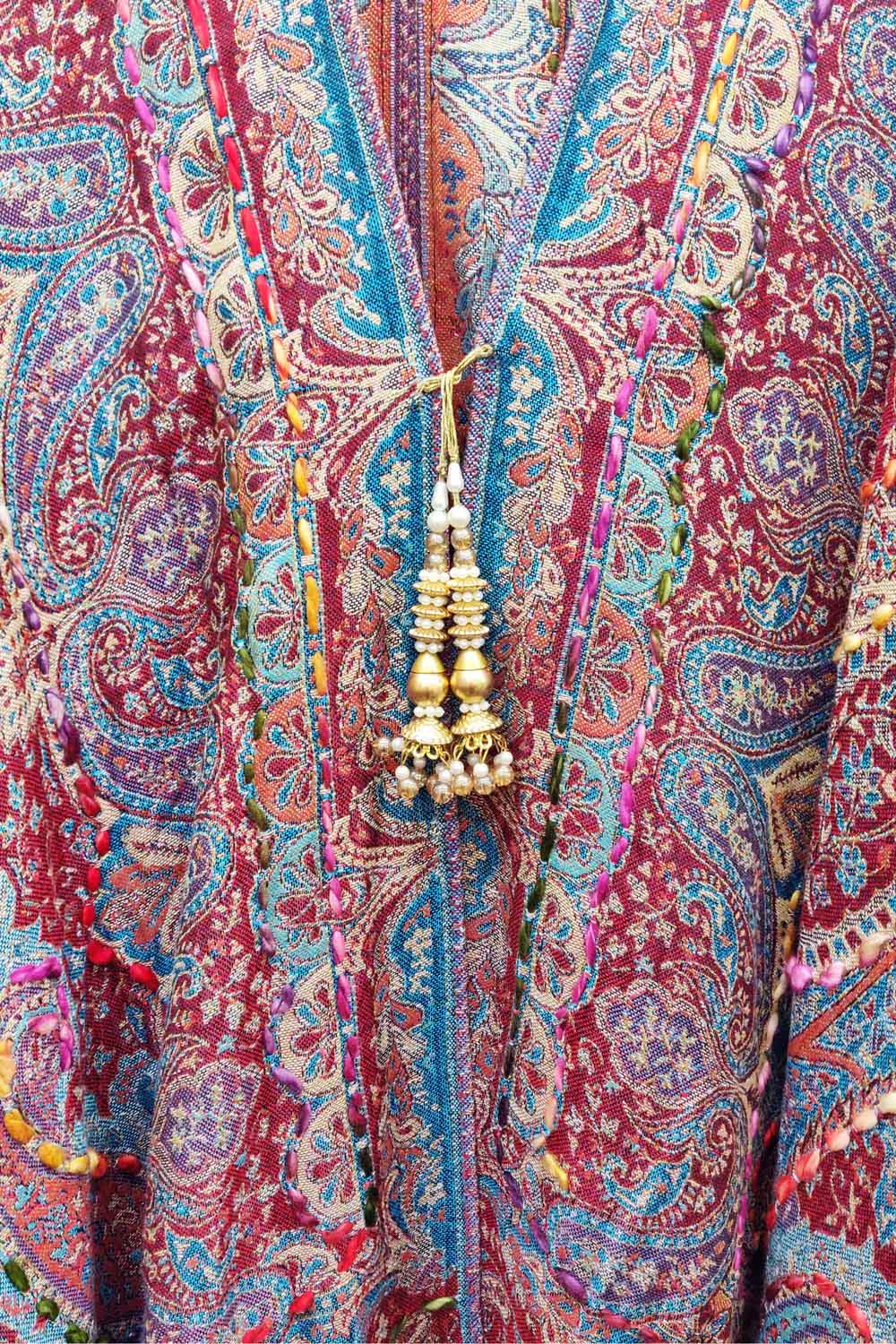 - Hand-stitched paisley floral print kimono with fringe hem, beaded pearl tassel closure on center front