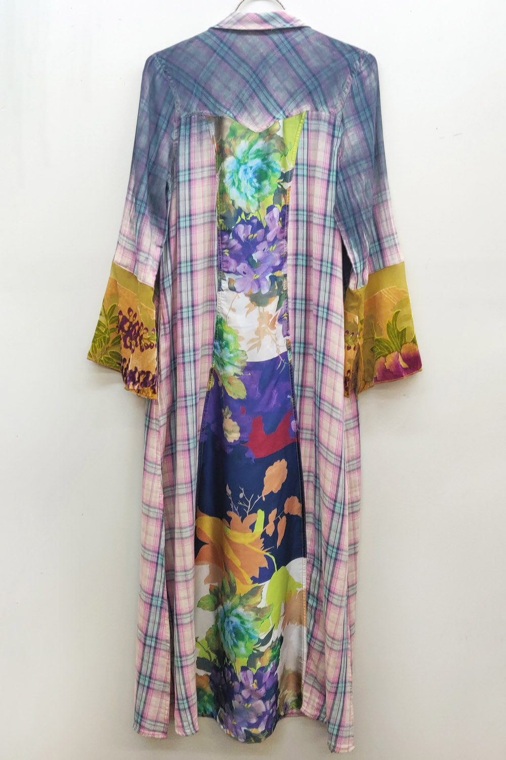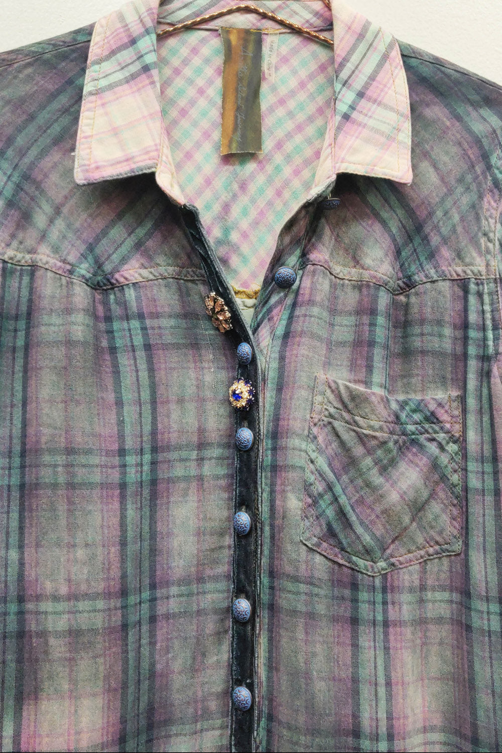 - Washed ombre plaid button-up duster, lower sleeves with burnout velvet contrast fabric, floral print on center back, 2 decorative crystal buttons sewn on velvet center front placket, 2 side pockets