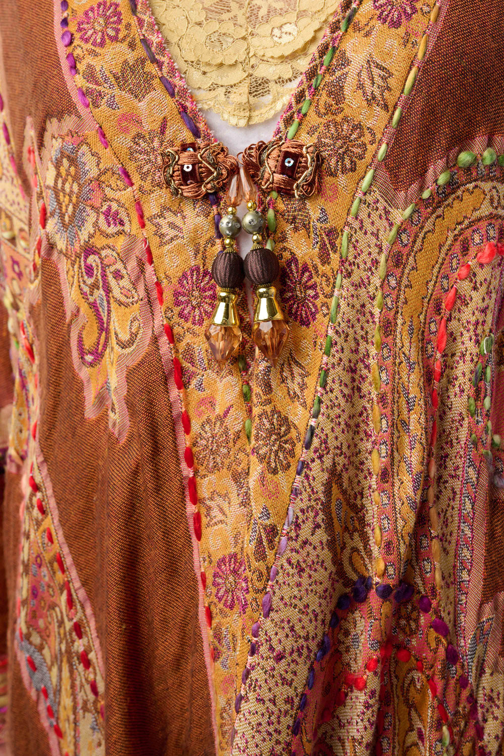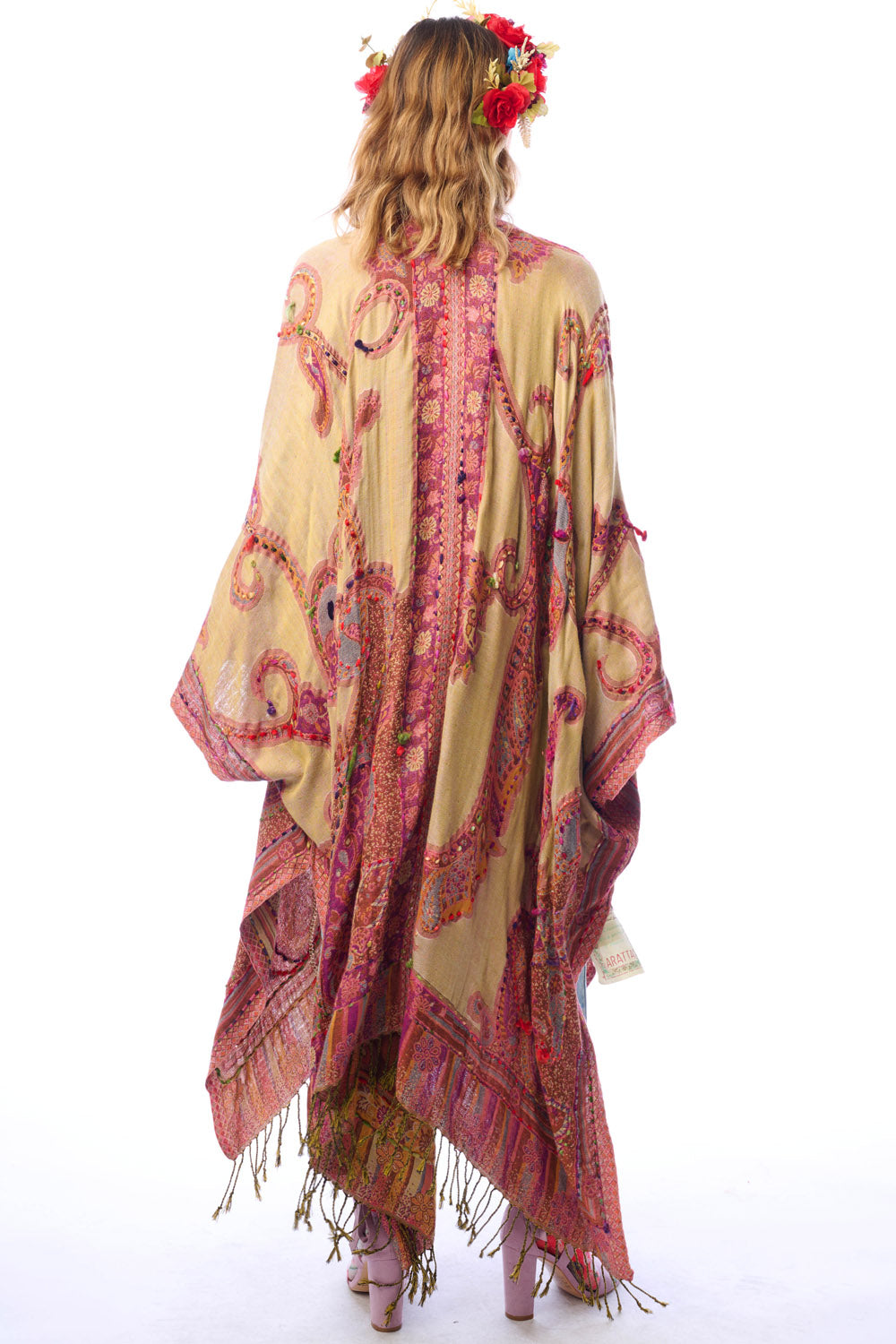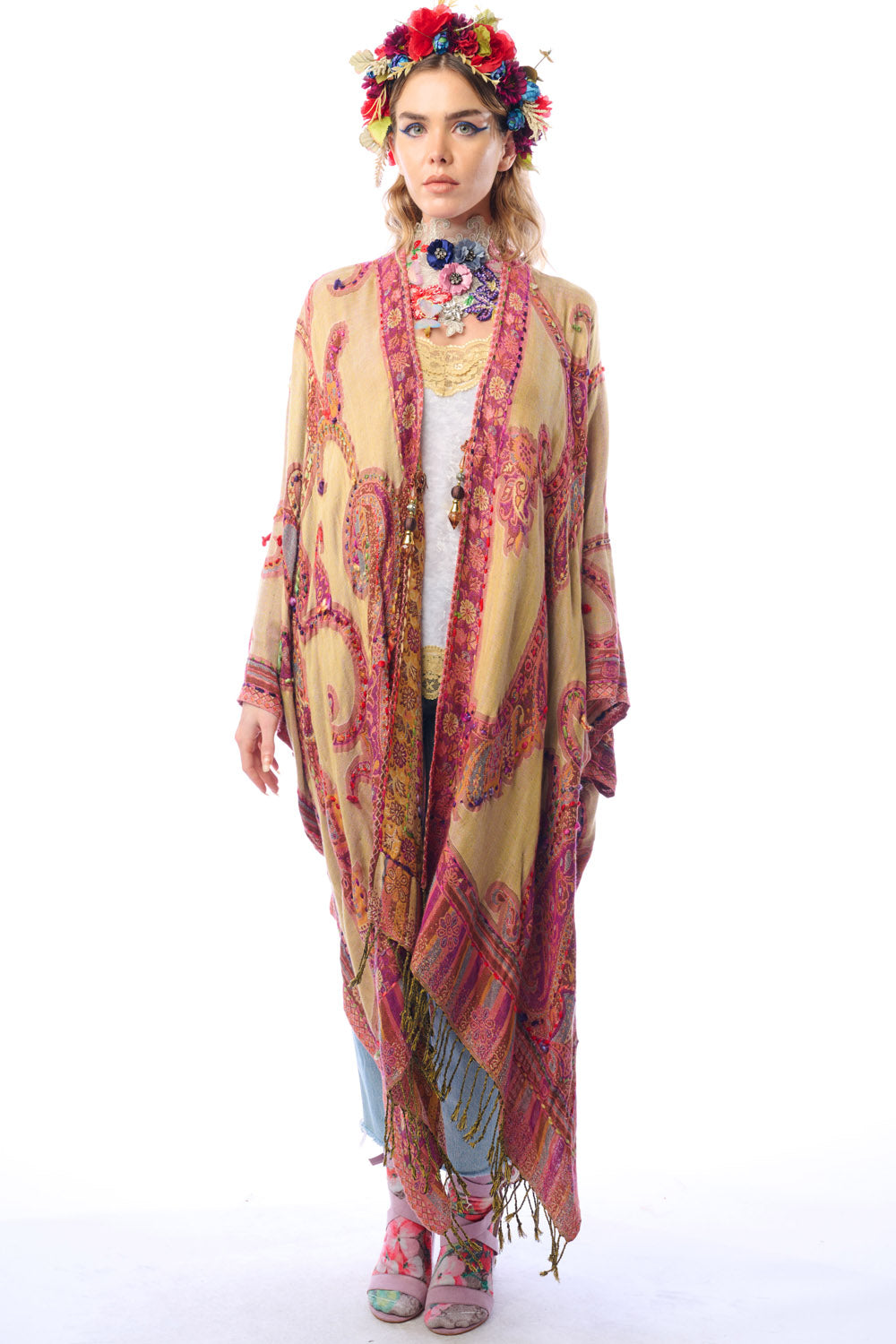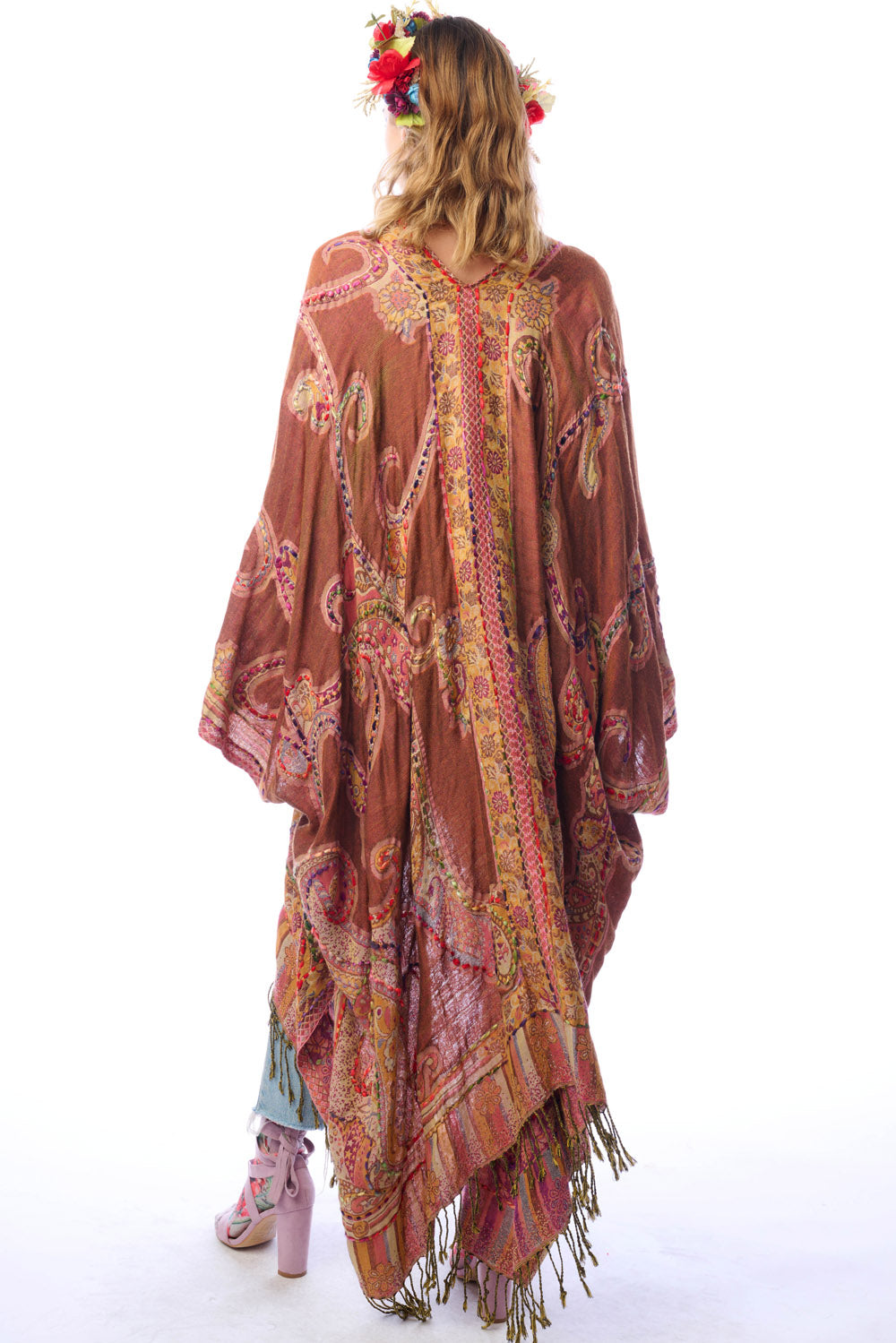 - Hand-stitched paisley print kimono with fringe hem, tassel closure on center front