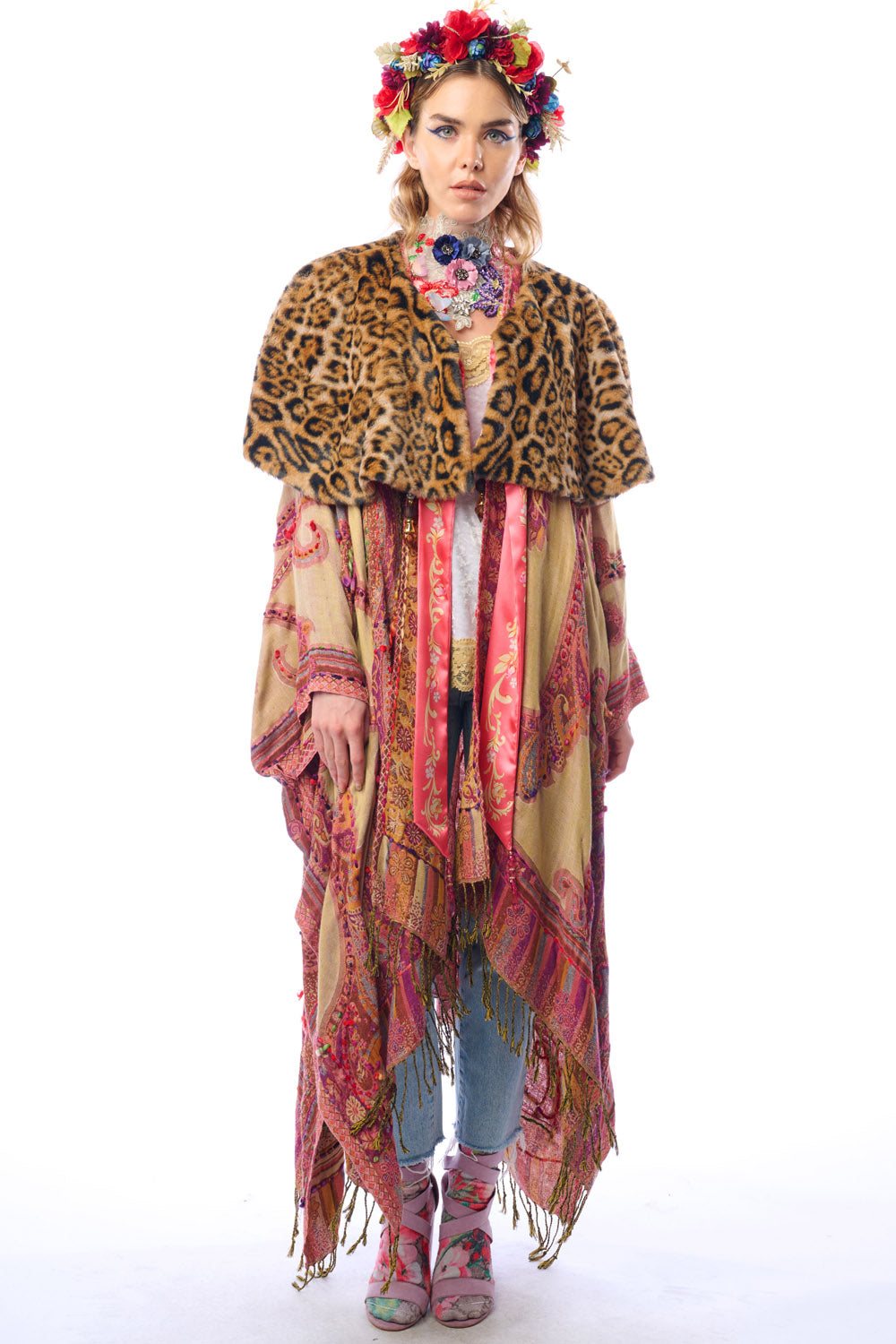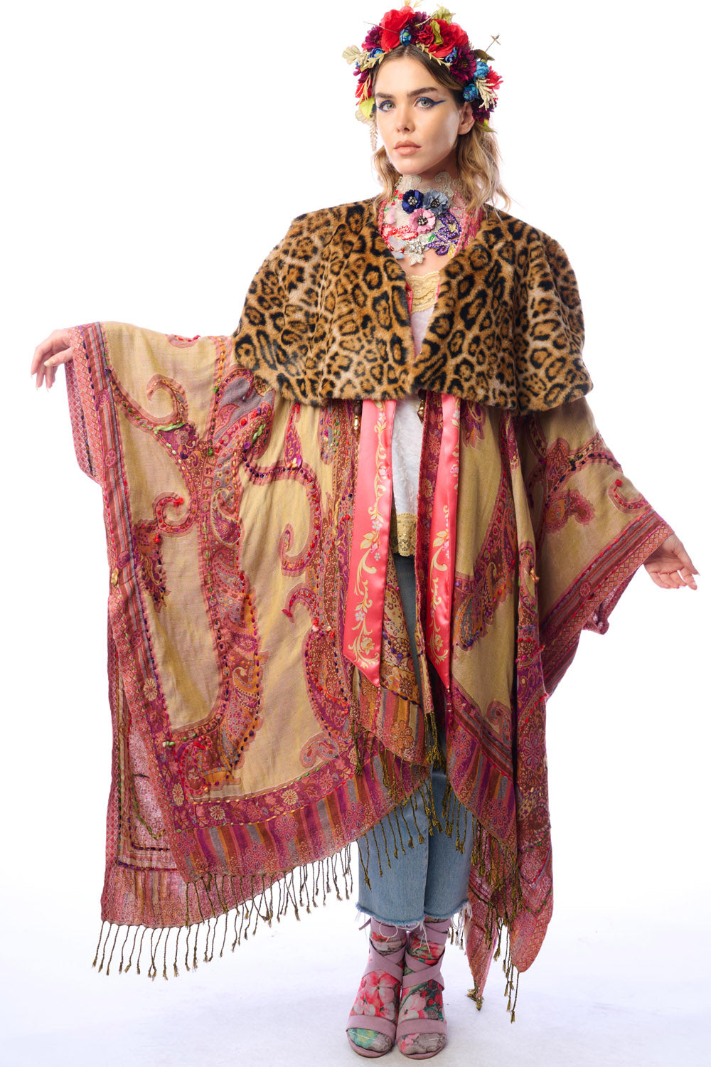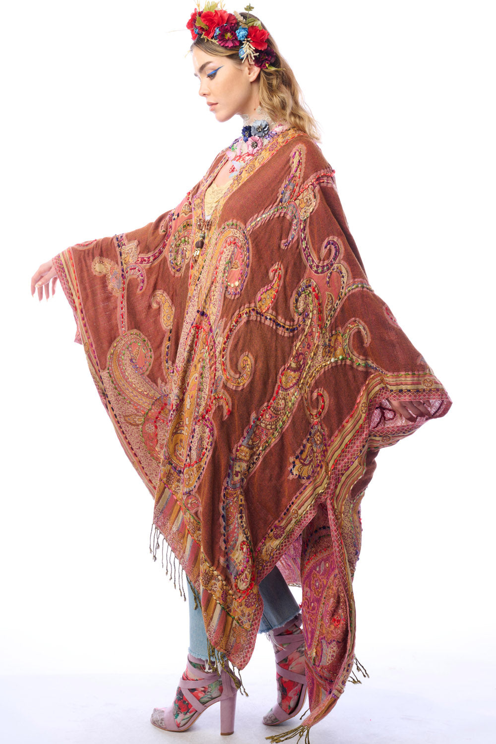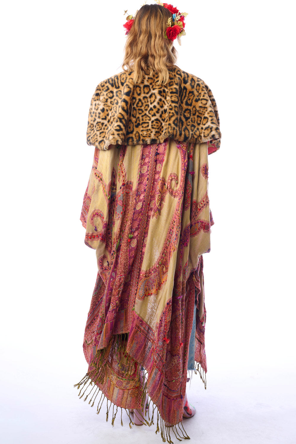 - Hand-stitched paisley print kimono with fringe hem, tassel closure on center front