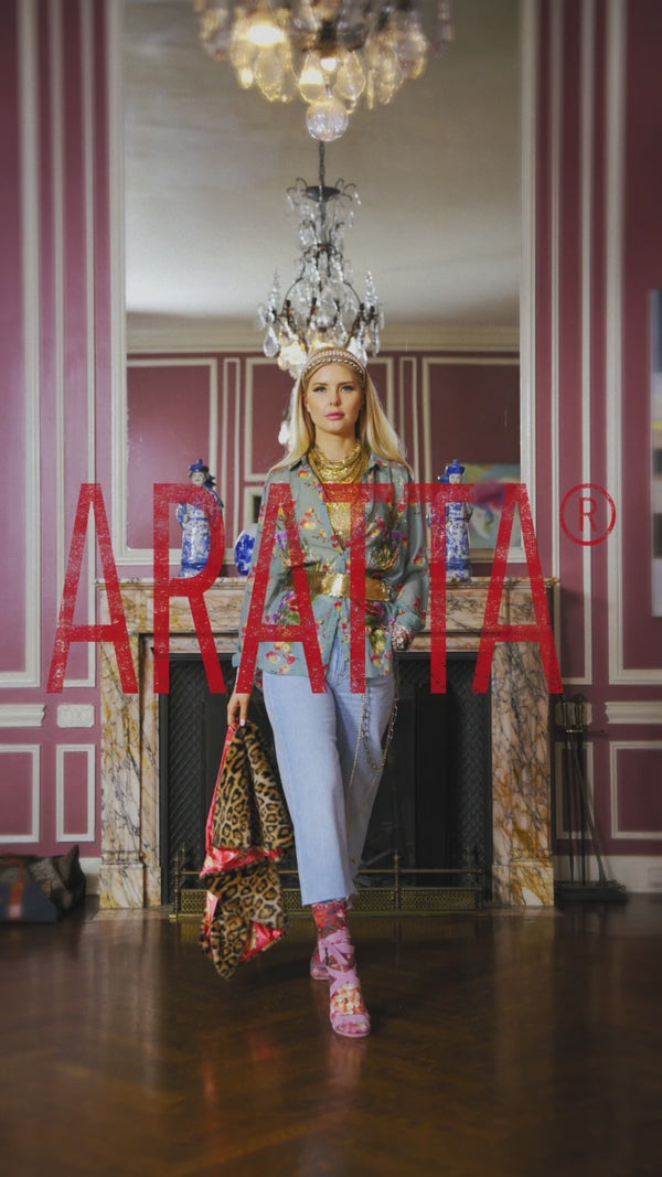 - Embroidered floral print button-down shirt, back yoke with embroidered trims, high-low hem