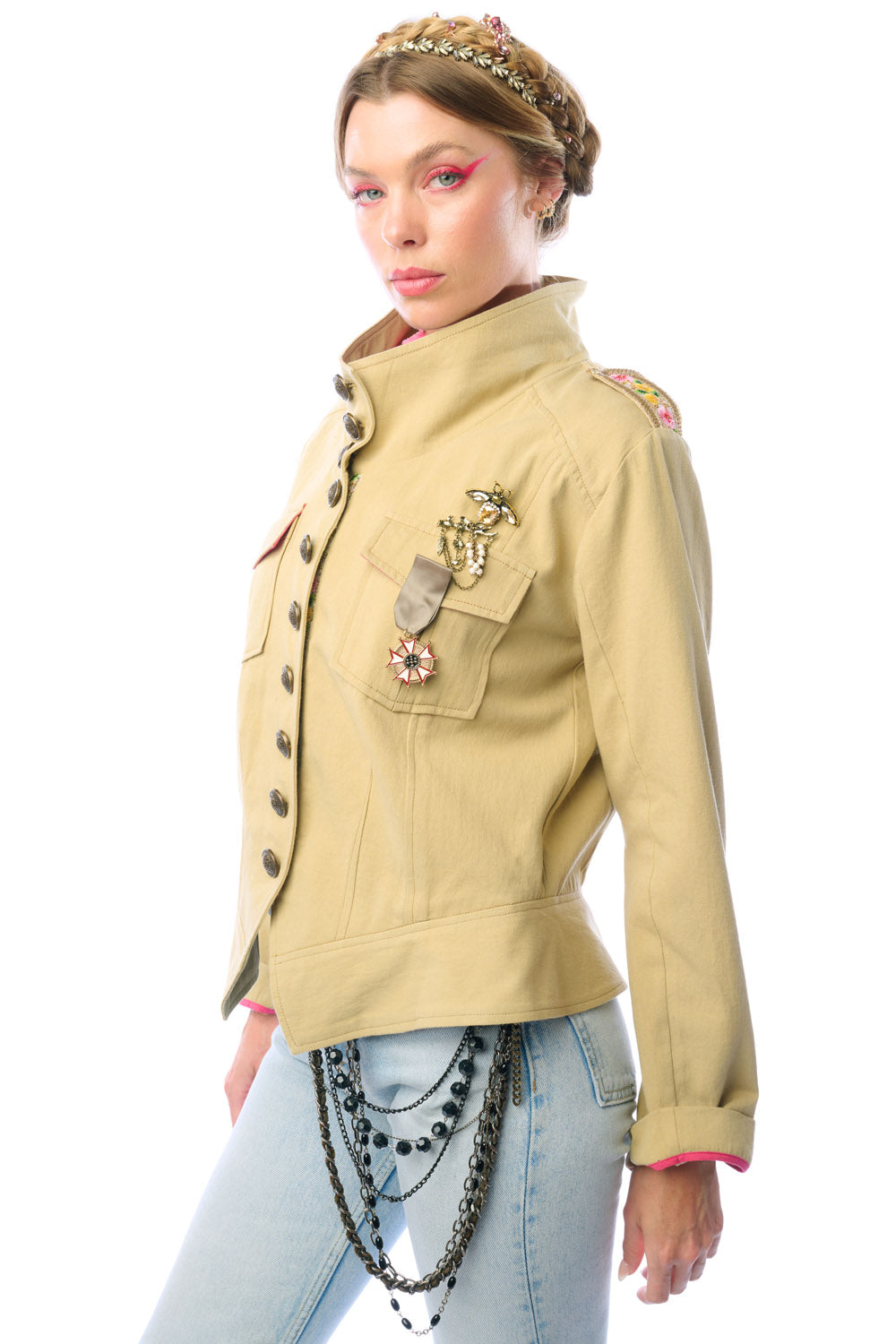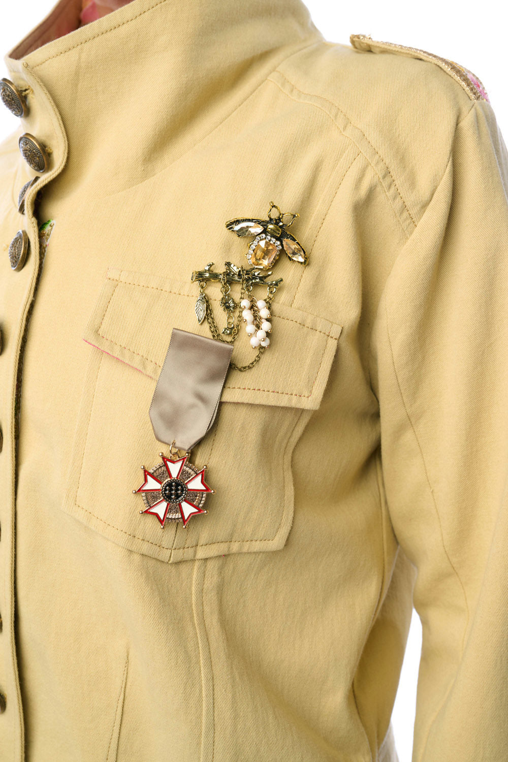 - Button-up jacket with embroidered floral trim on shoulder, 2 front flap pockets, brooches on left pocket