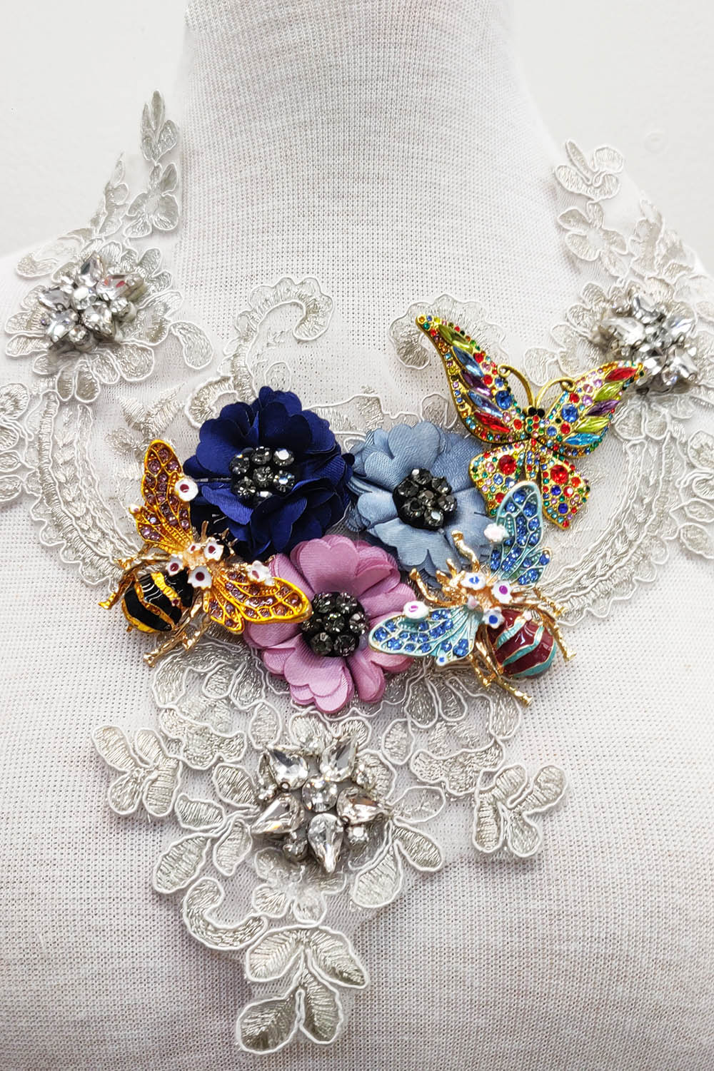 - Lace trim embellished floral crystal butterfly & queen bee brooches necklace, closure with antique gold chain & lobster claw clasp