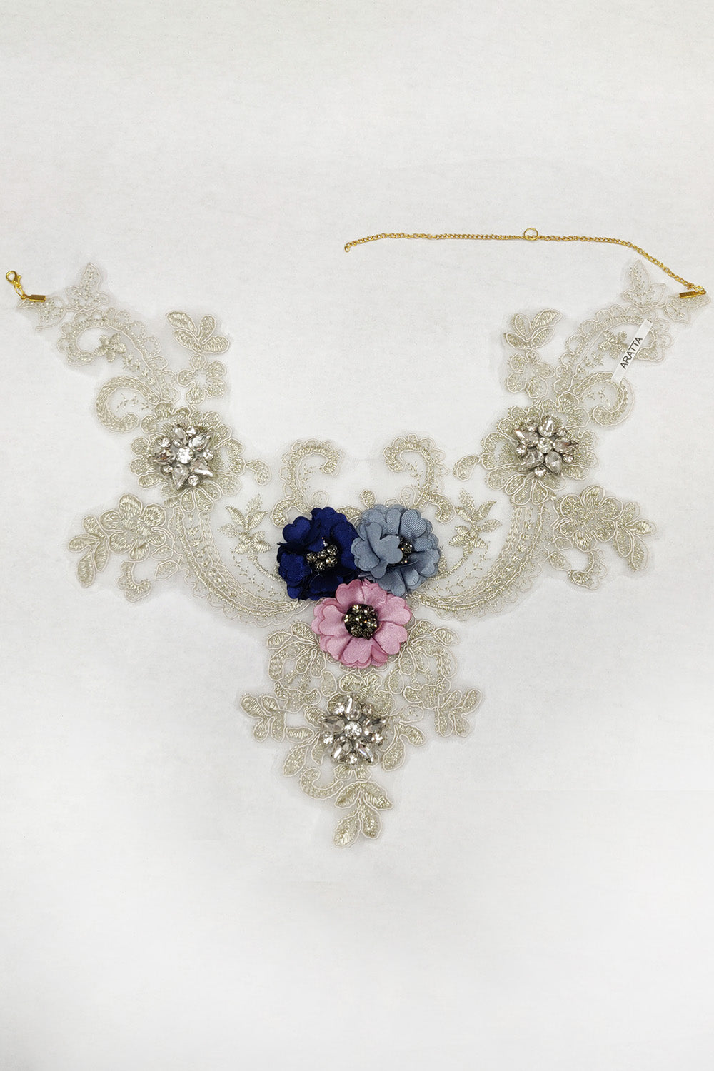 - Lace trim embellished floral crystal necklace, closure with antique gold chain & lobster claw clasp