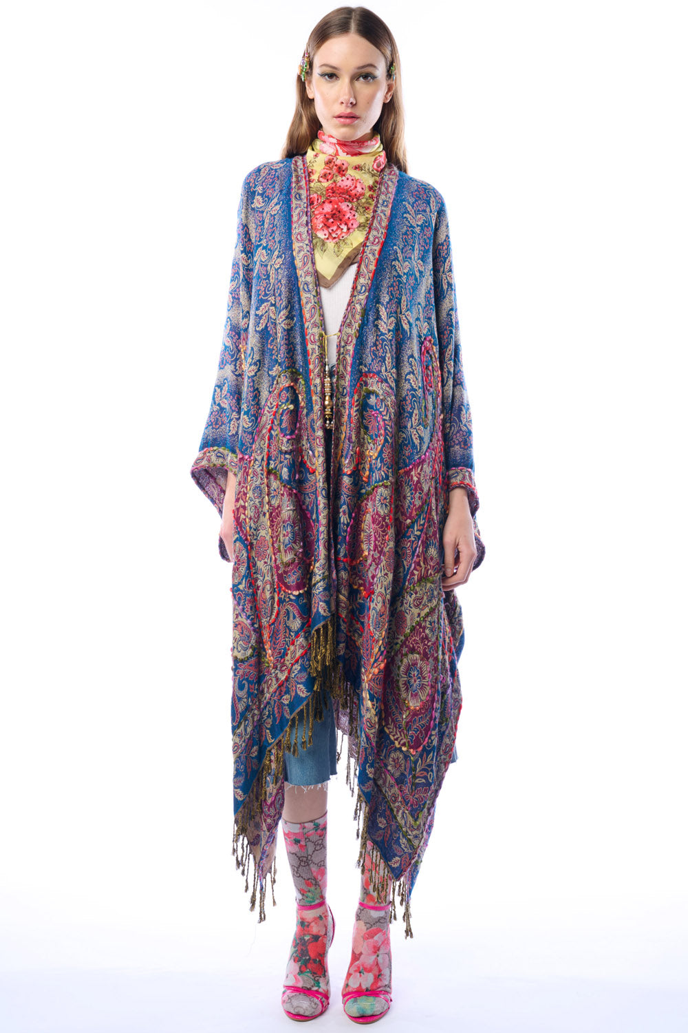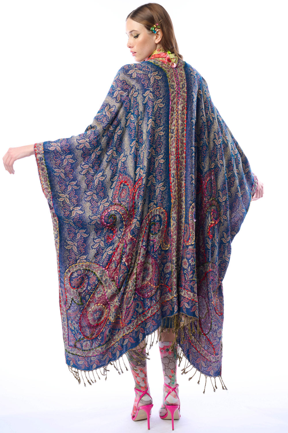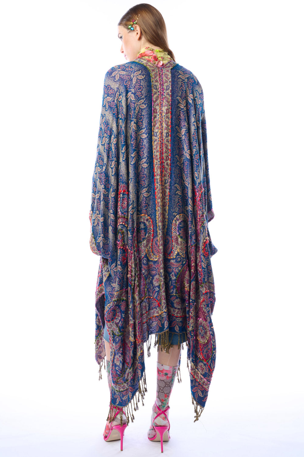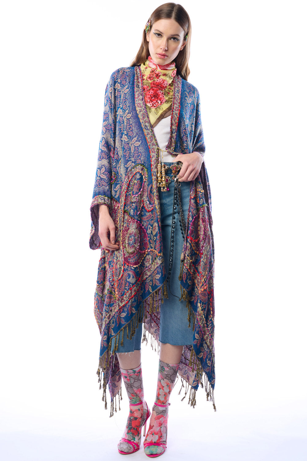 - Hand-stitched paisley floral print kimono with fringe hem, beaded pearl tassel closure on center front