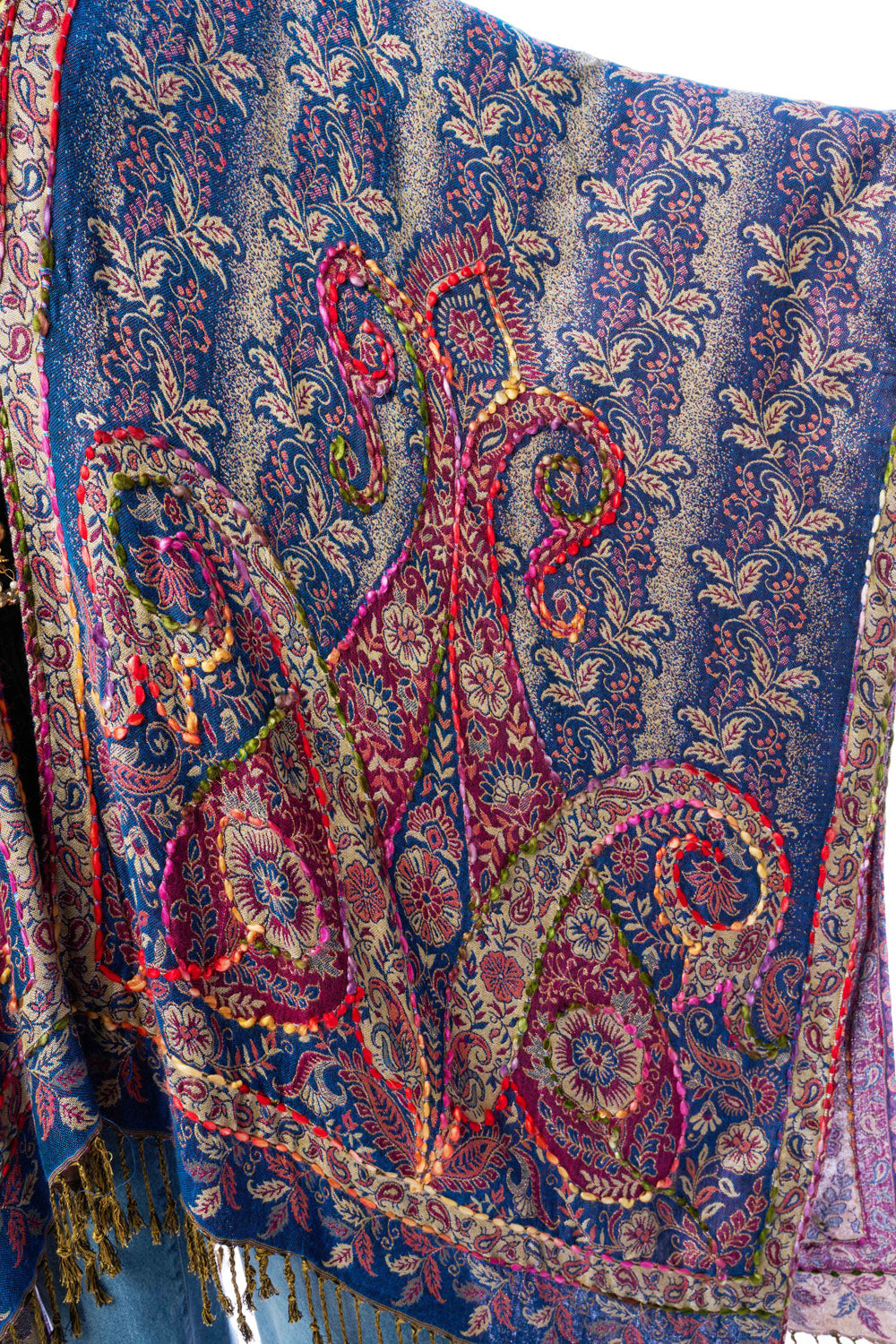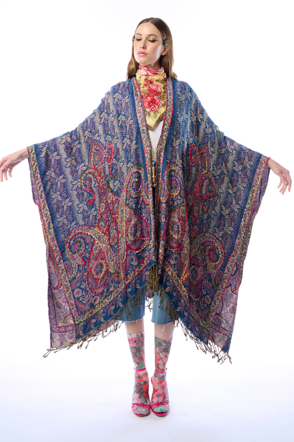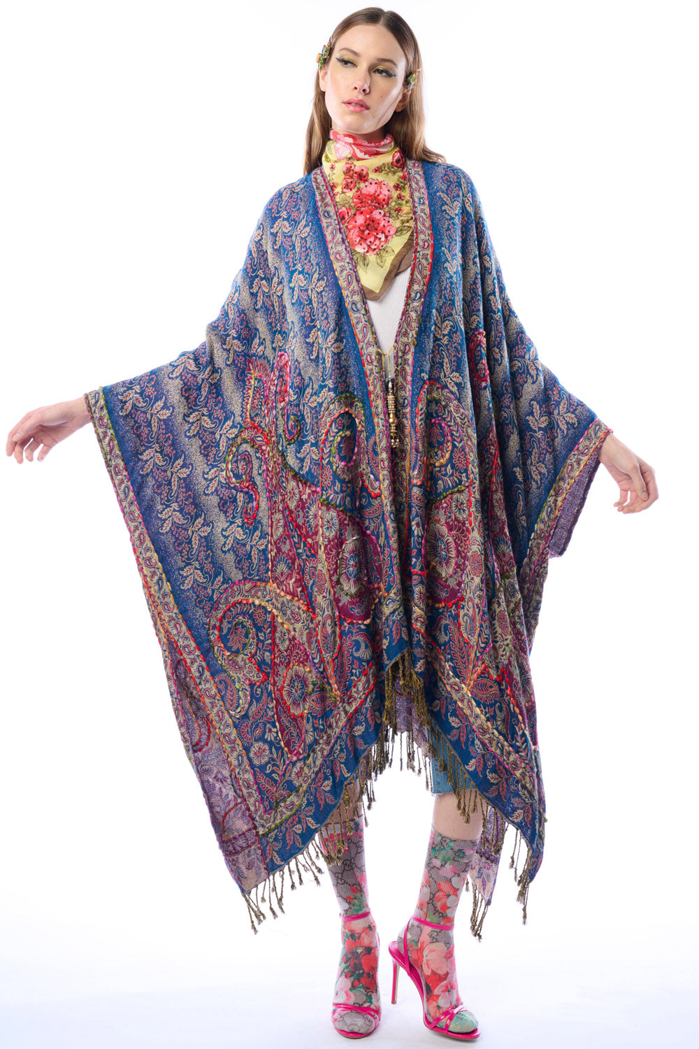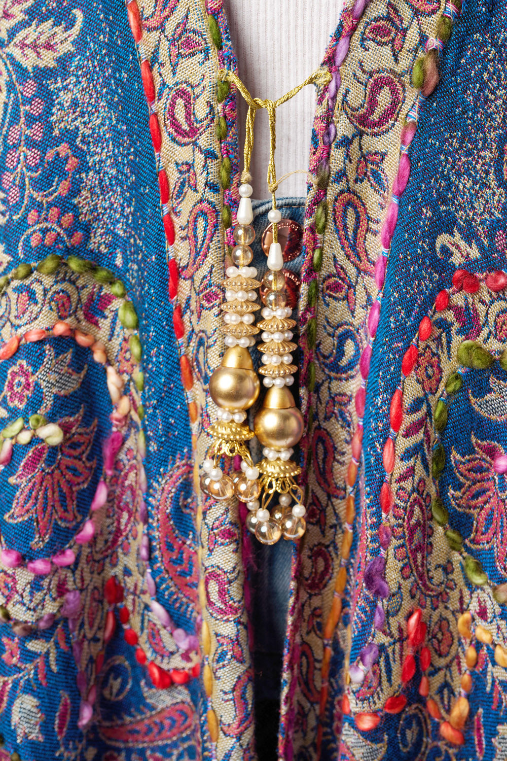 - Hand-stitched paisley floral print kimono with fringe hem, beaded pearl tassel closure on center front
