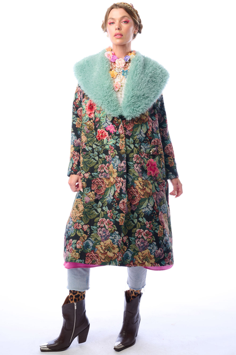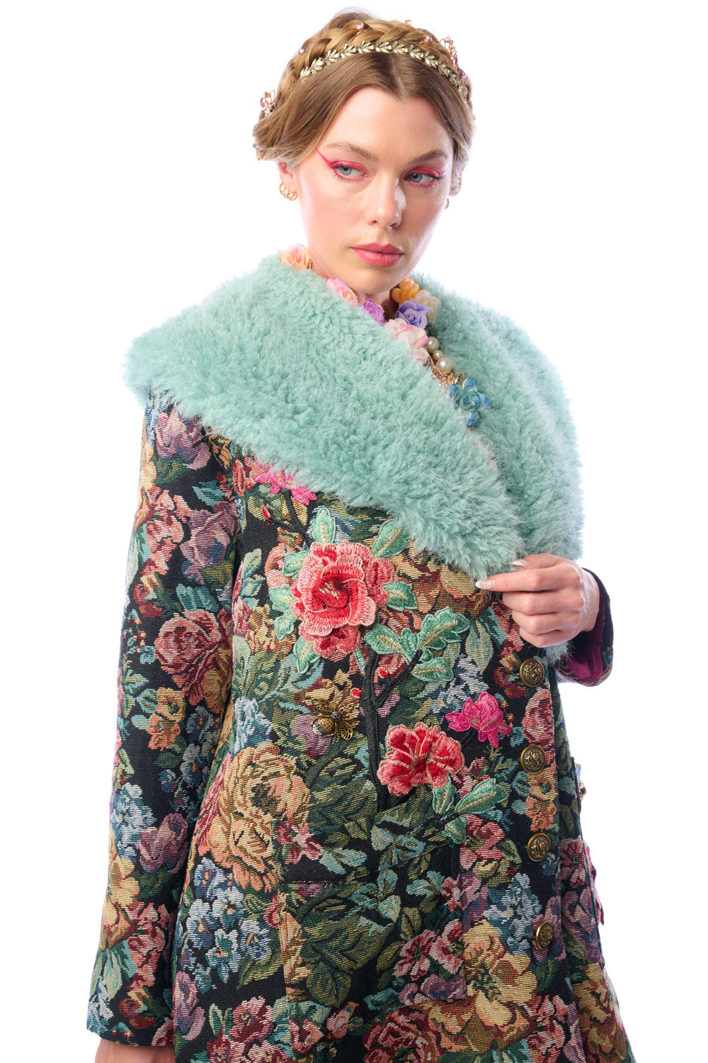 - Floral jacquard button-up coat with faux fur shawl collar, embroidered floral patches/ crystal removable brooches on upper right front & left pocket, 2 front pockets