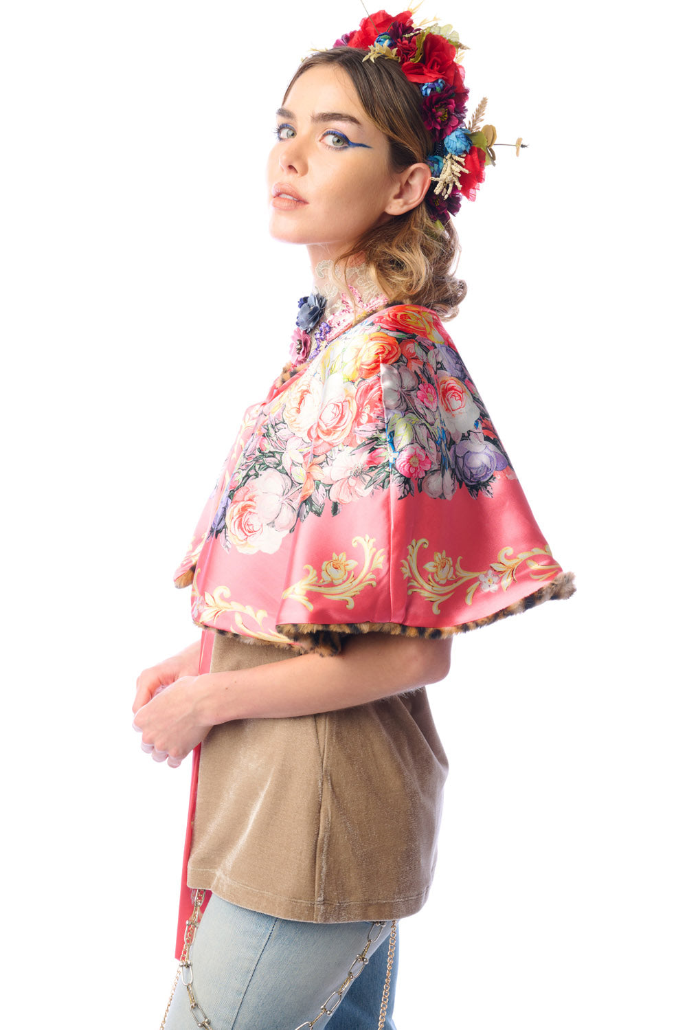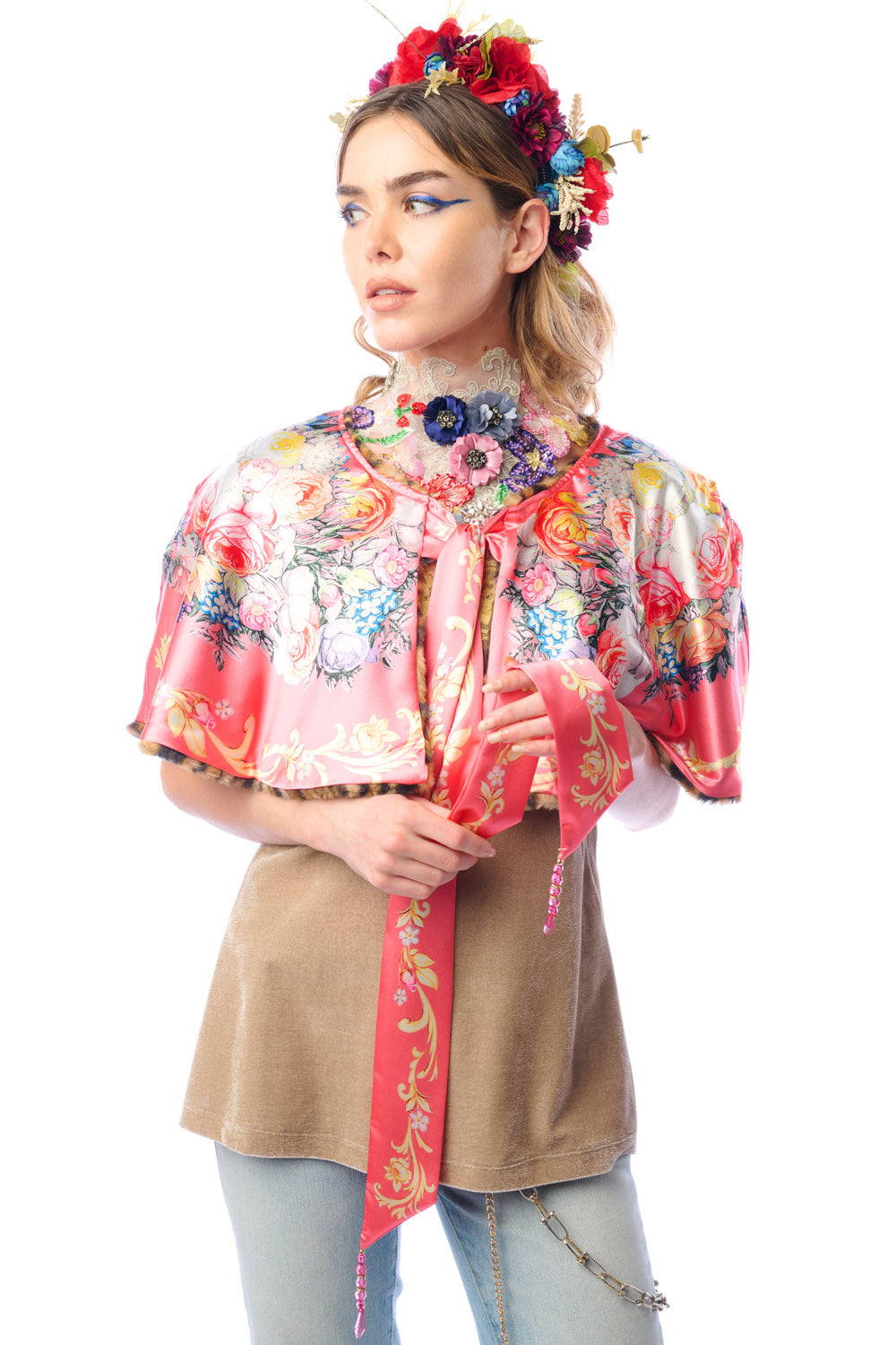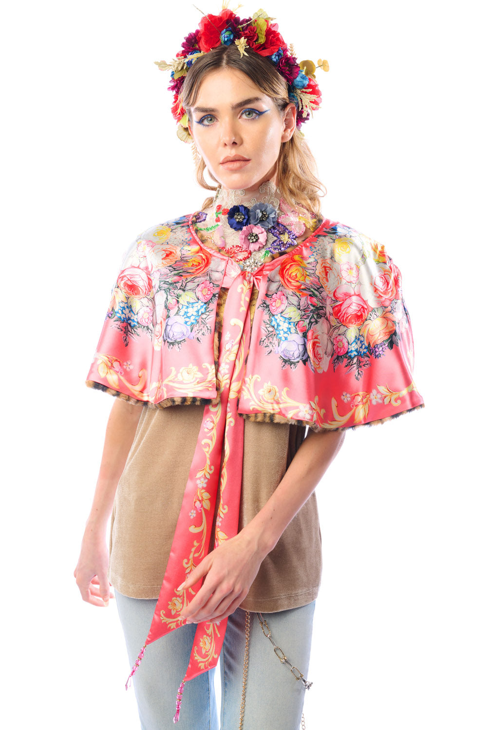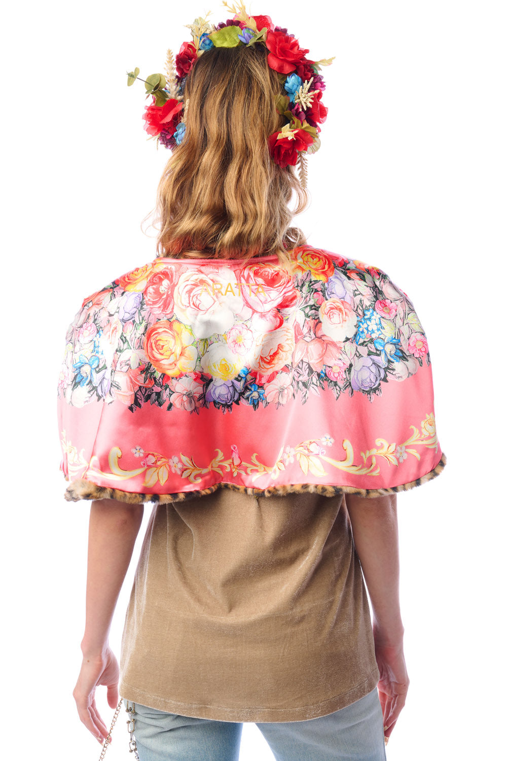 - Leopard faux fur cape with floral print satin lining, floral print tie with crystal tassels, can be worn reversibly