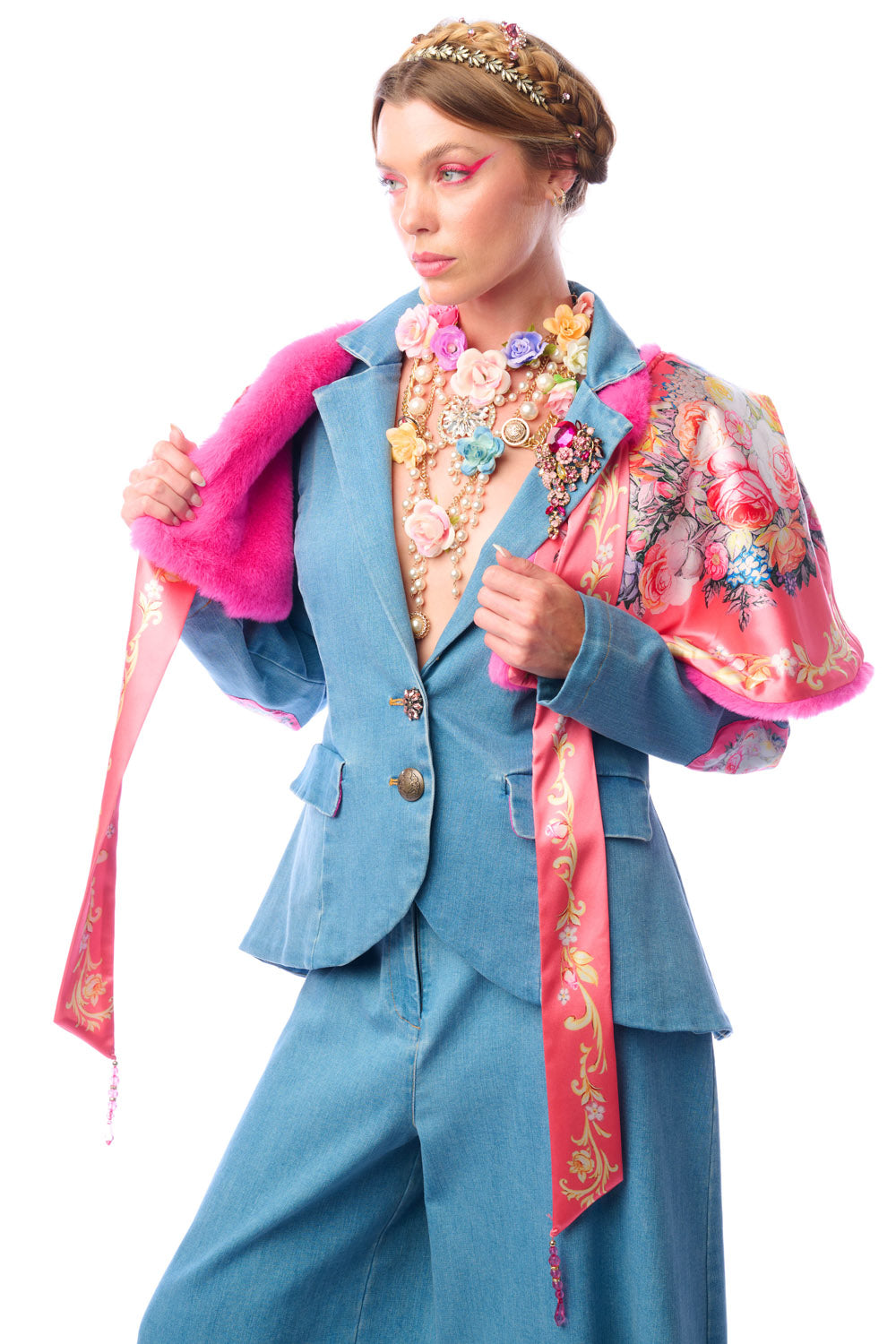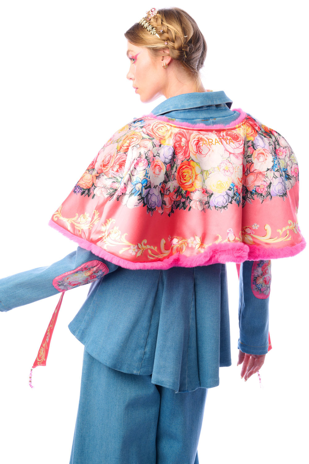 - Faux fur cape with floral print satin lining, floral print tie with crystal tassels, can be worn reversibly