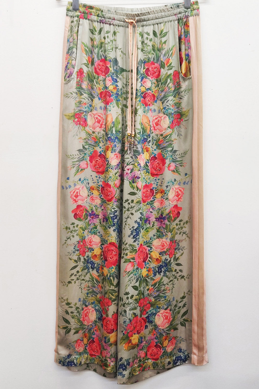 - Washed floral print wide leg elastic waist pants with beaded crystal tassel drawstring, stripes on sides, 2 side front pockets