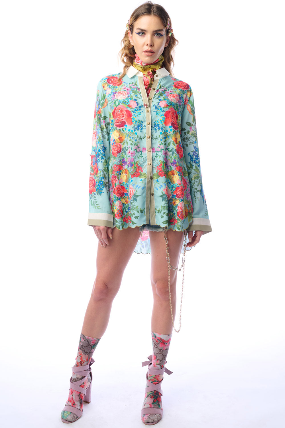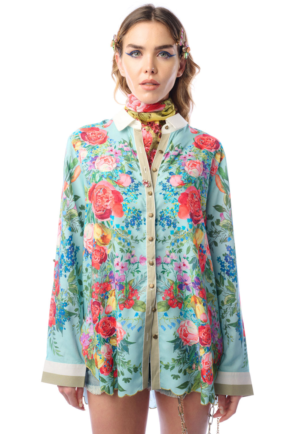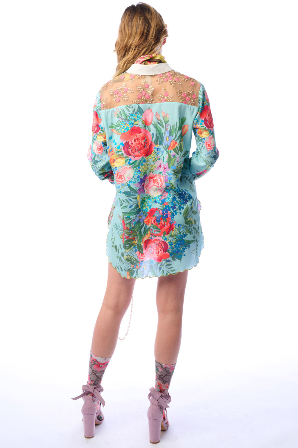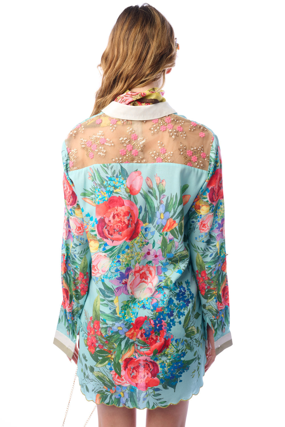 - Floral print long-sleeve button-up shirt, sequin embroidered mesh back yoke, stripe cuffs, solid collar/collar stand, center front placket with 1 decorative crystal button, antique gold metallic buttons closure, metallic gold thread scallop high-low hem