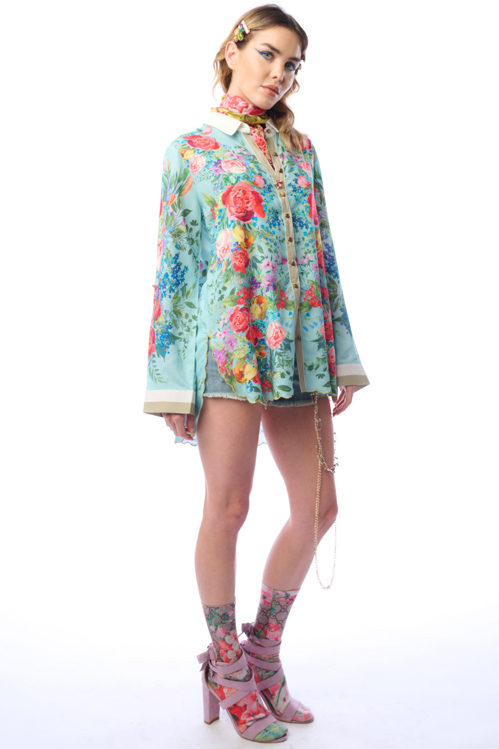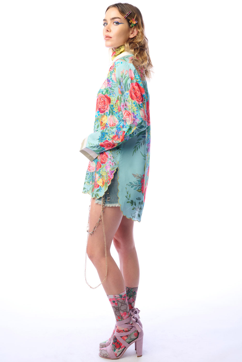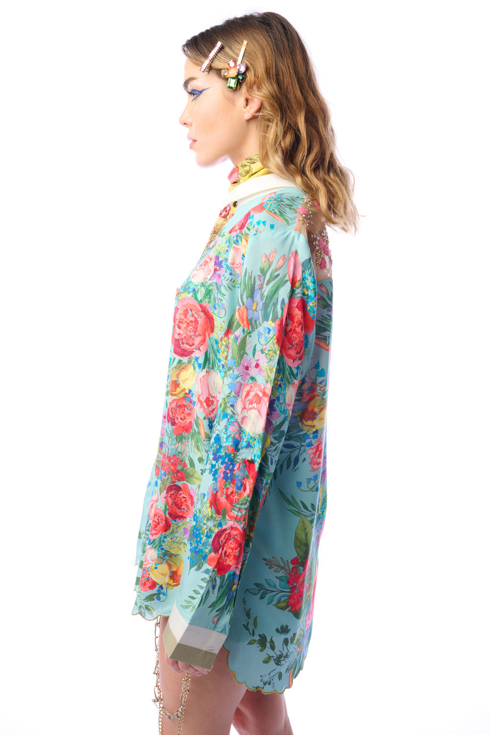 - Floral print long-sleeve button-up shirt, sequin embroidered mesh back yoke, stripe cuffs, solid collar/collar stand, center front placket with 1 decorative crystal button, antique gold metallic buttons closure, metallic gold thread scallop high-low hem