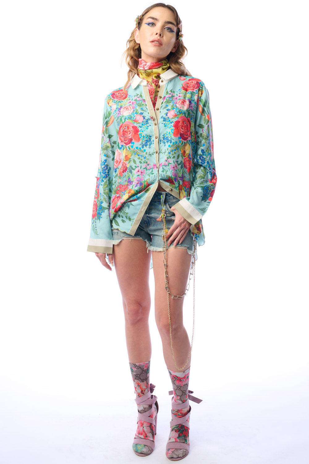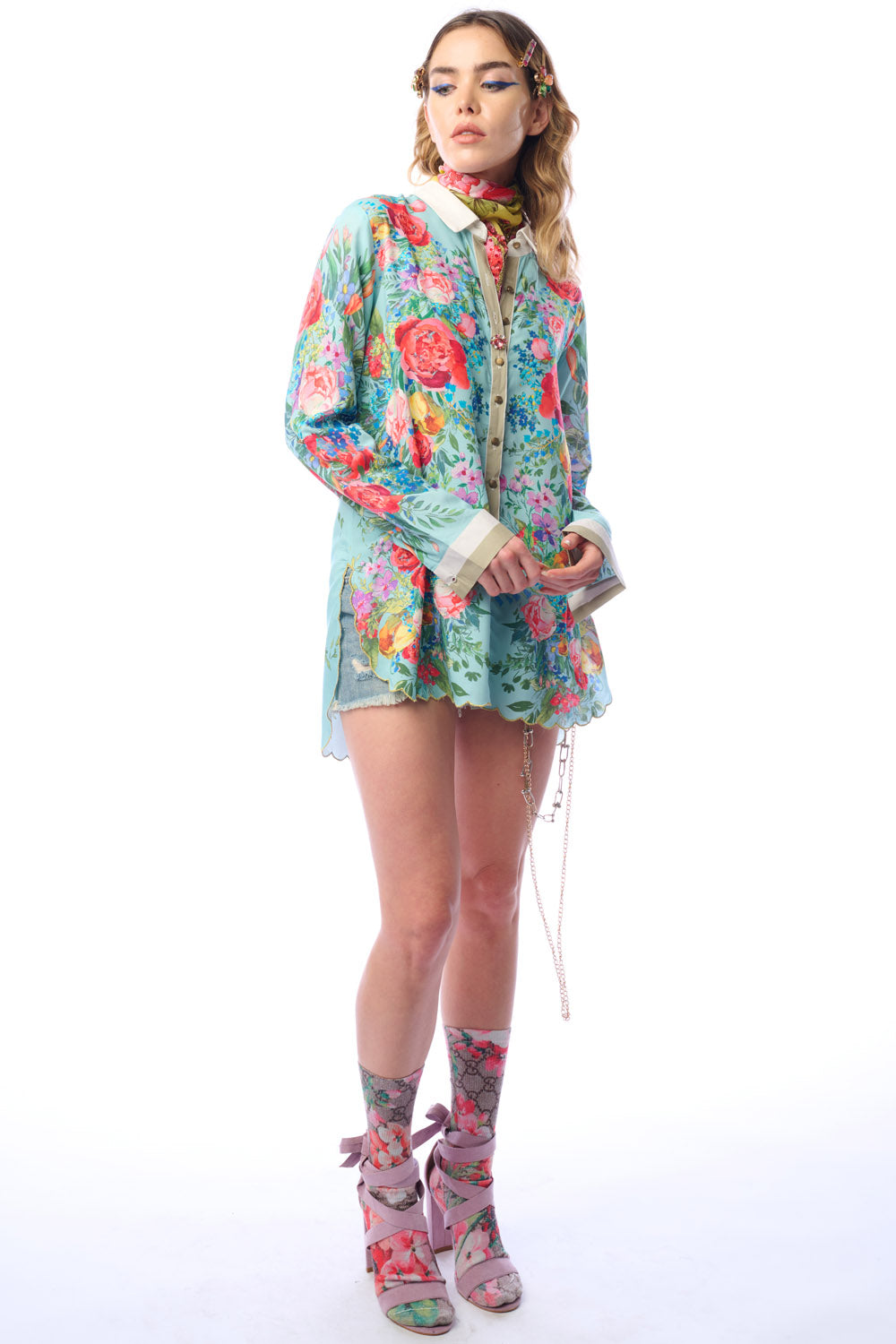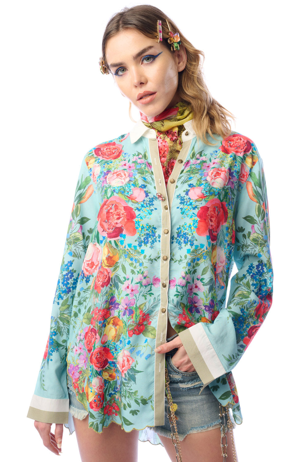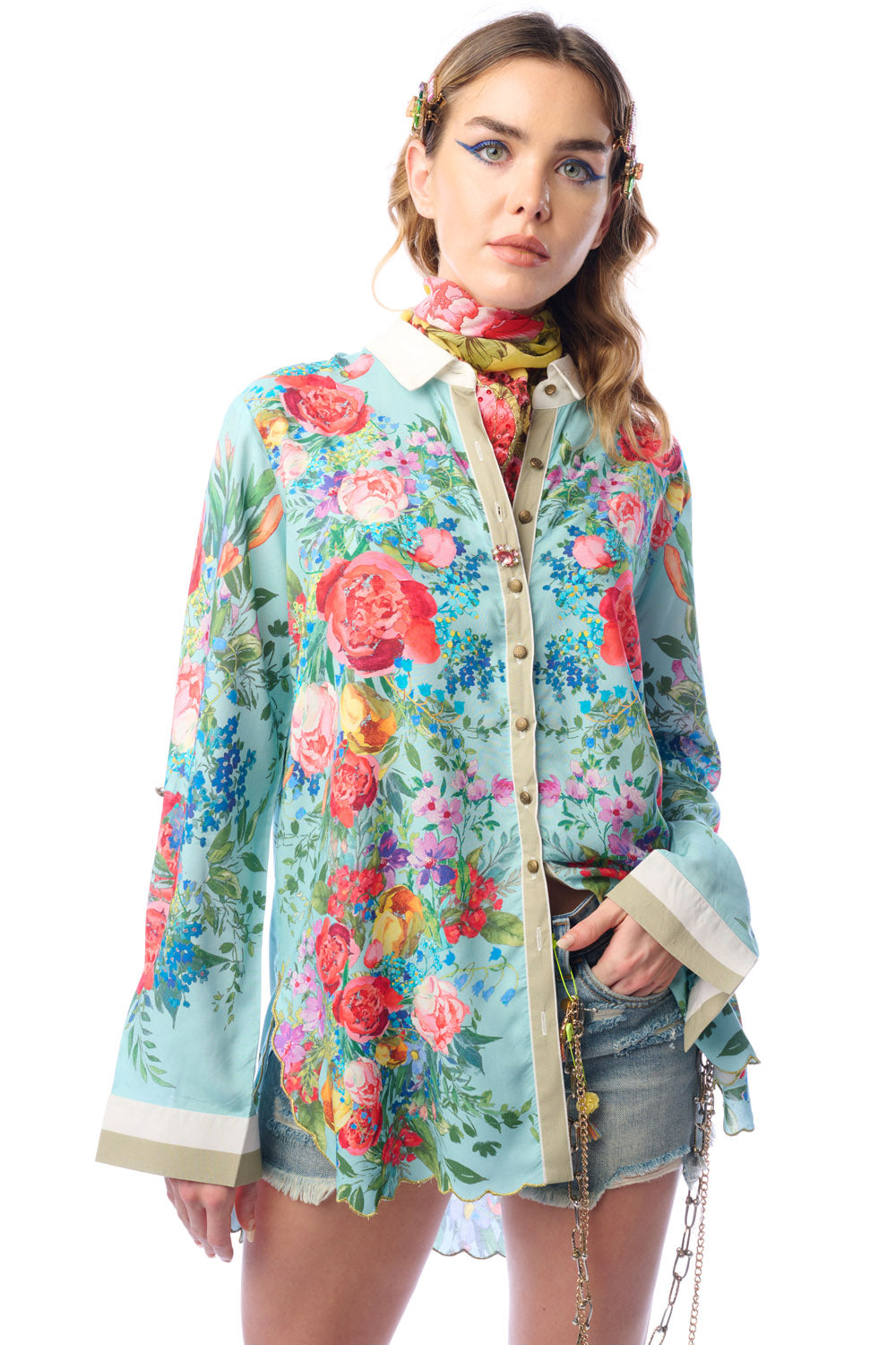 - Floral print long-sleeve button-up shirt, sequin embroidered mesh back yoke, stripe cuffs, solid collar/collar stand, center front placket with 1 decorative crystal button, antique gold metallic buttons closure, metallic gold thread scallop high-low hem