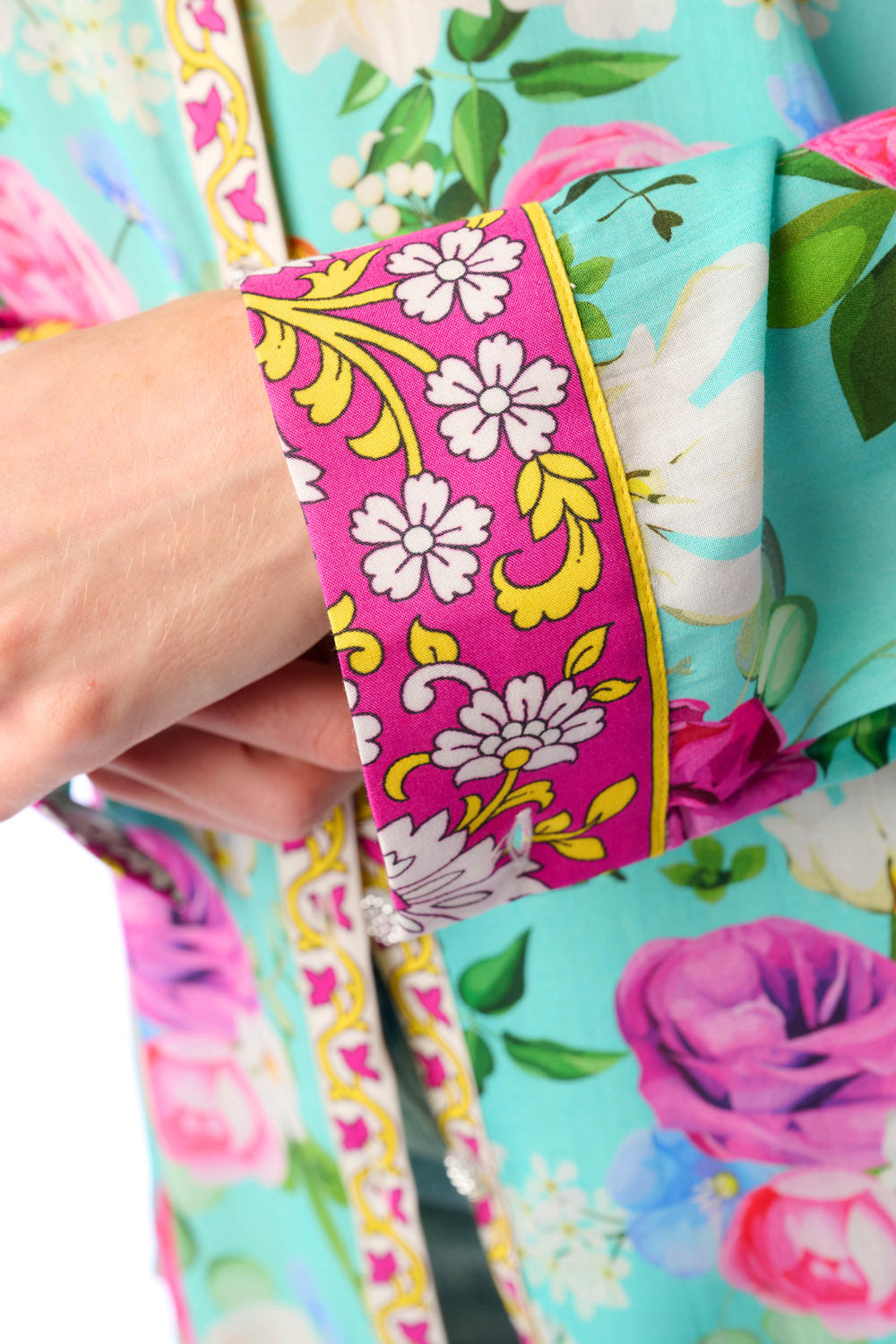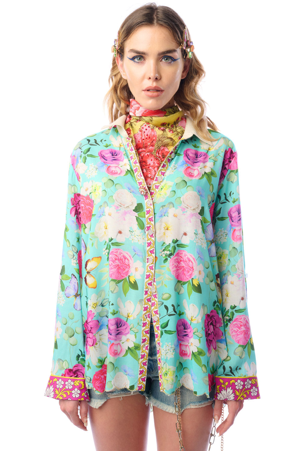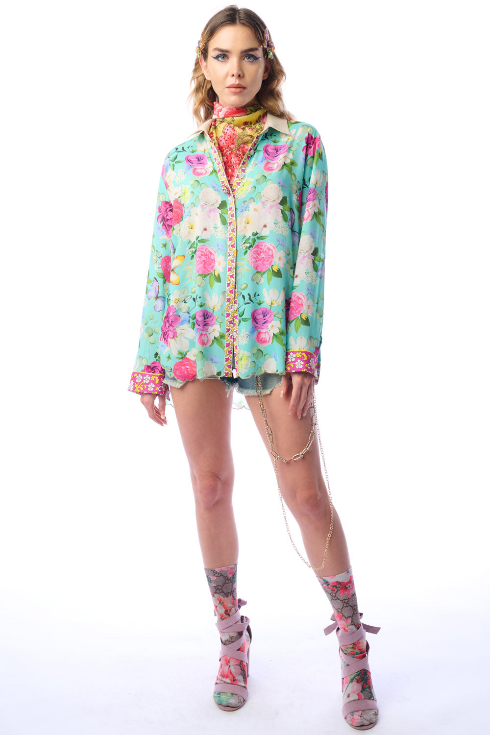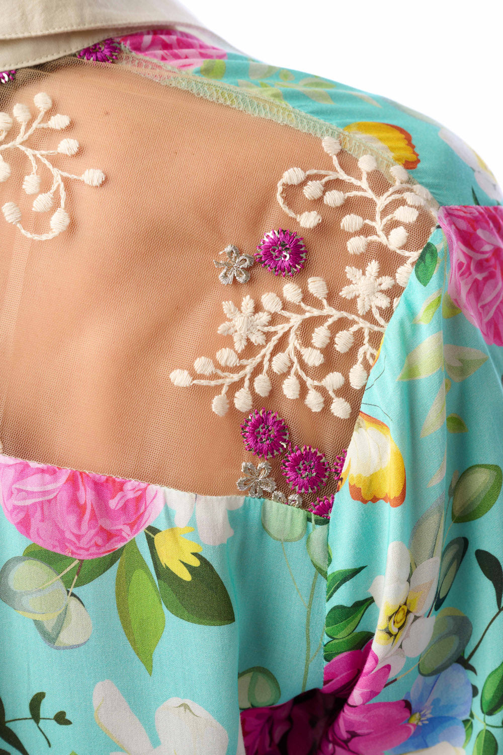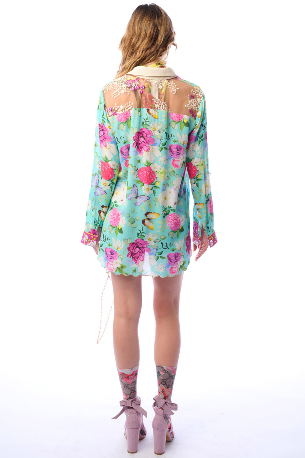 - Floral print long-sleeve button-up shirt, sequin embroidered mesh back yoke, solid collar/collar stand, center front placket with 1 decorative crystal button, metallic gold thread scallop high-low hem