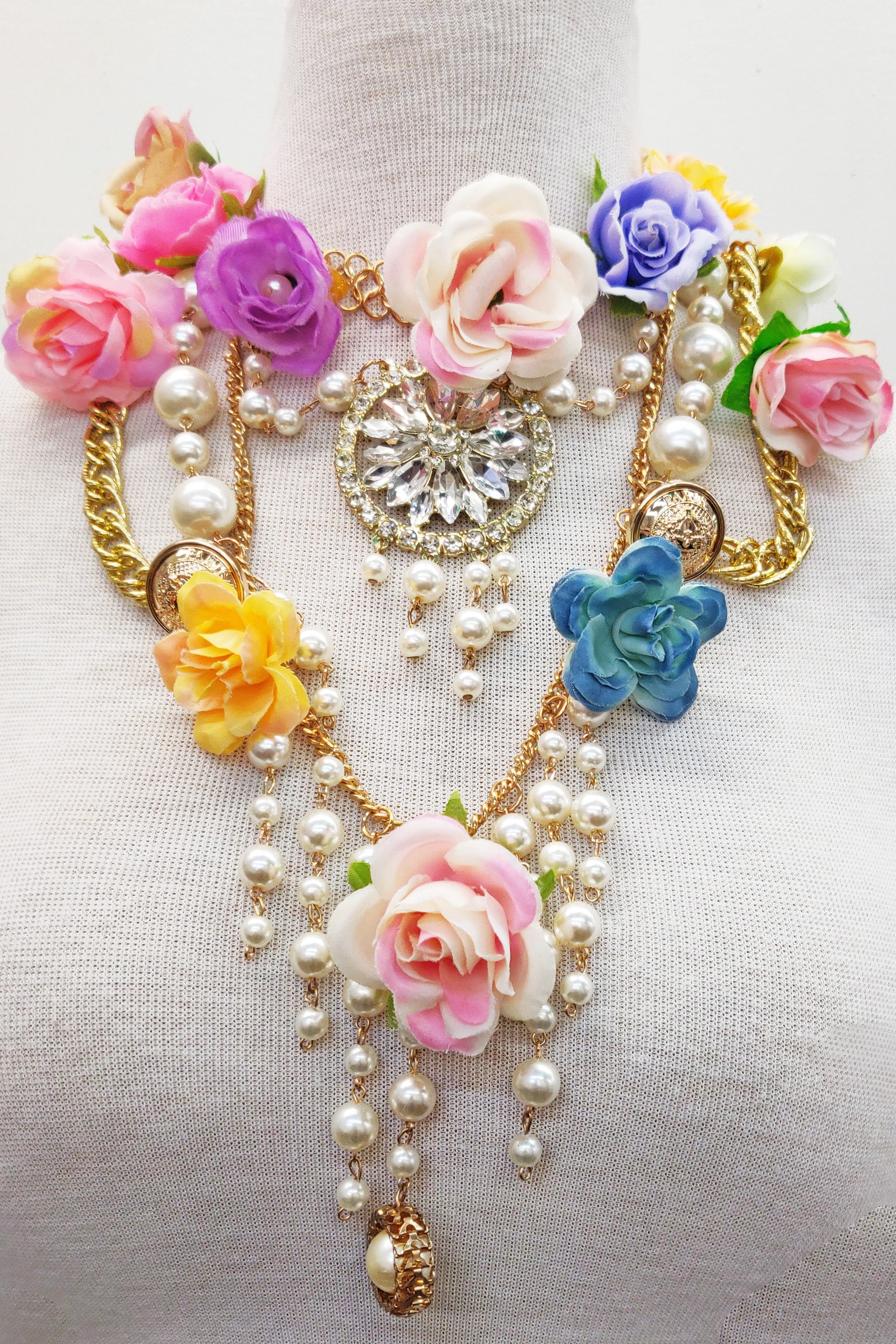 - Embellished floral pearl crystal pendant gold necklace, closure with antique gold chain & lobster claw clasp