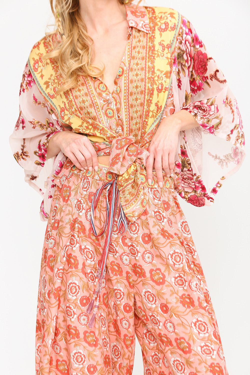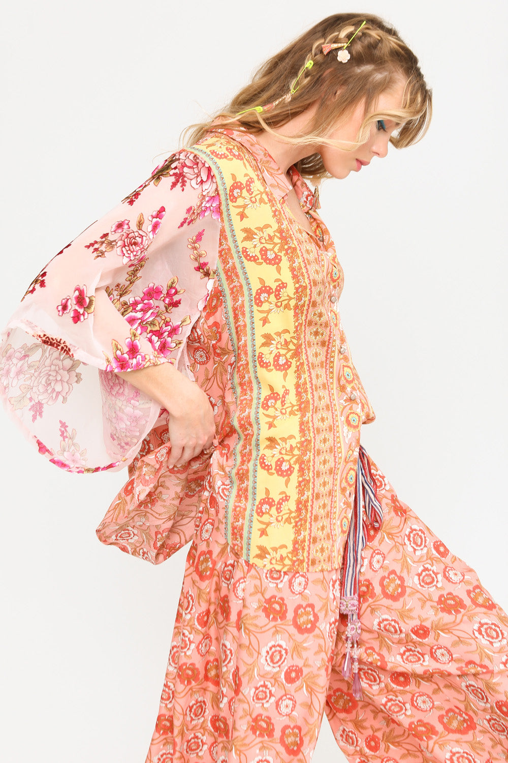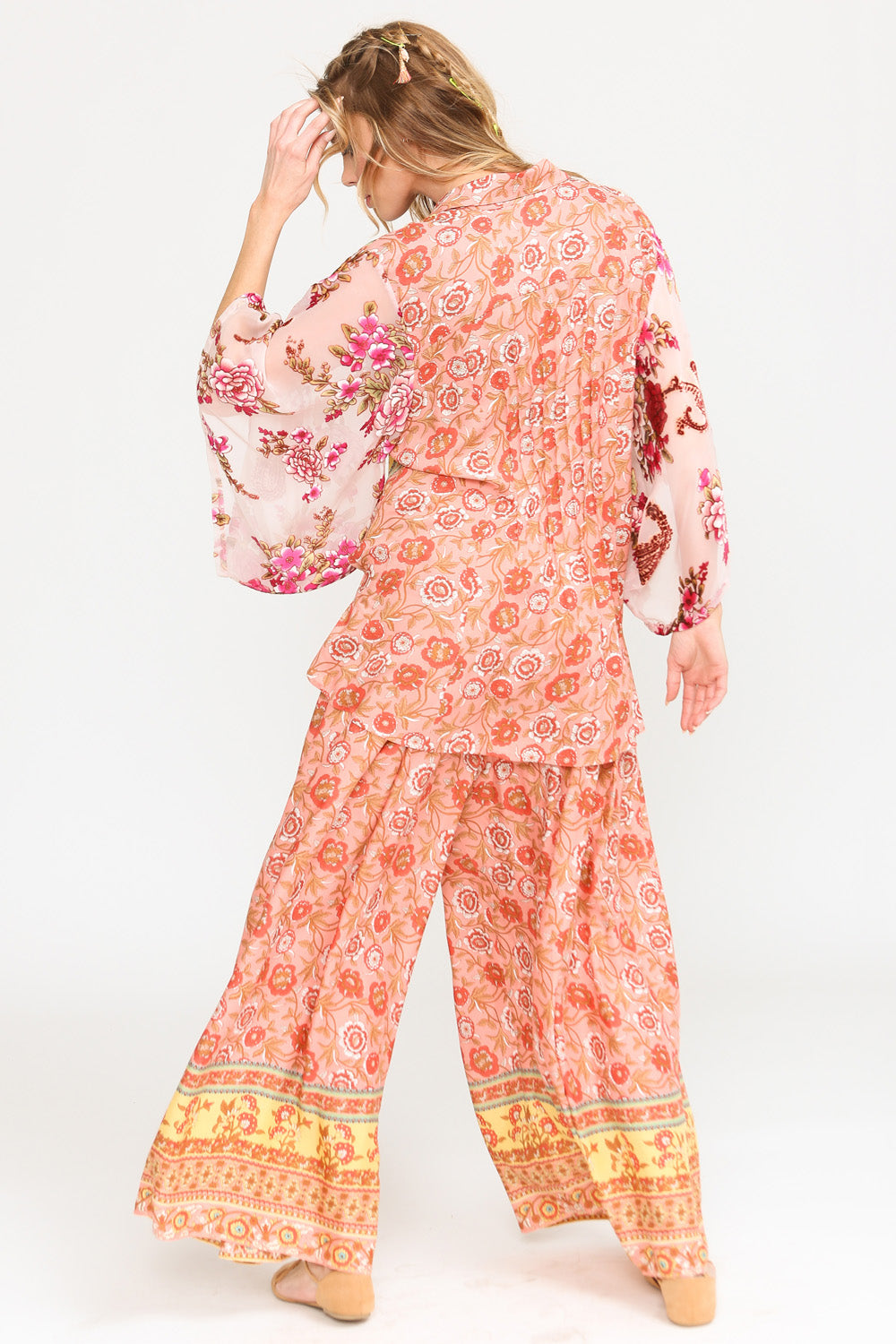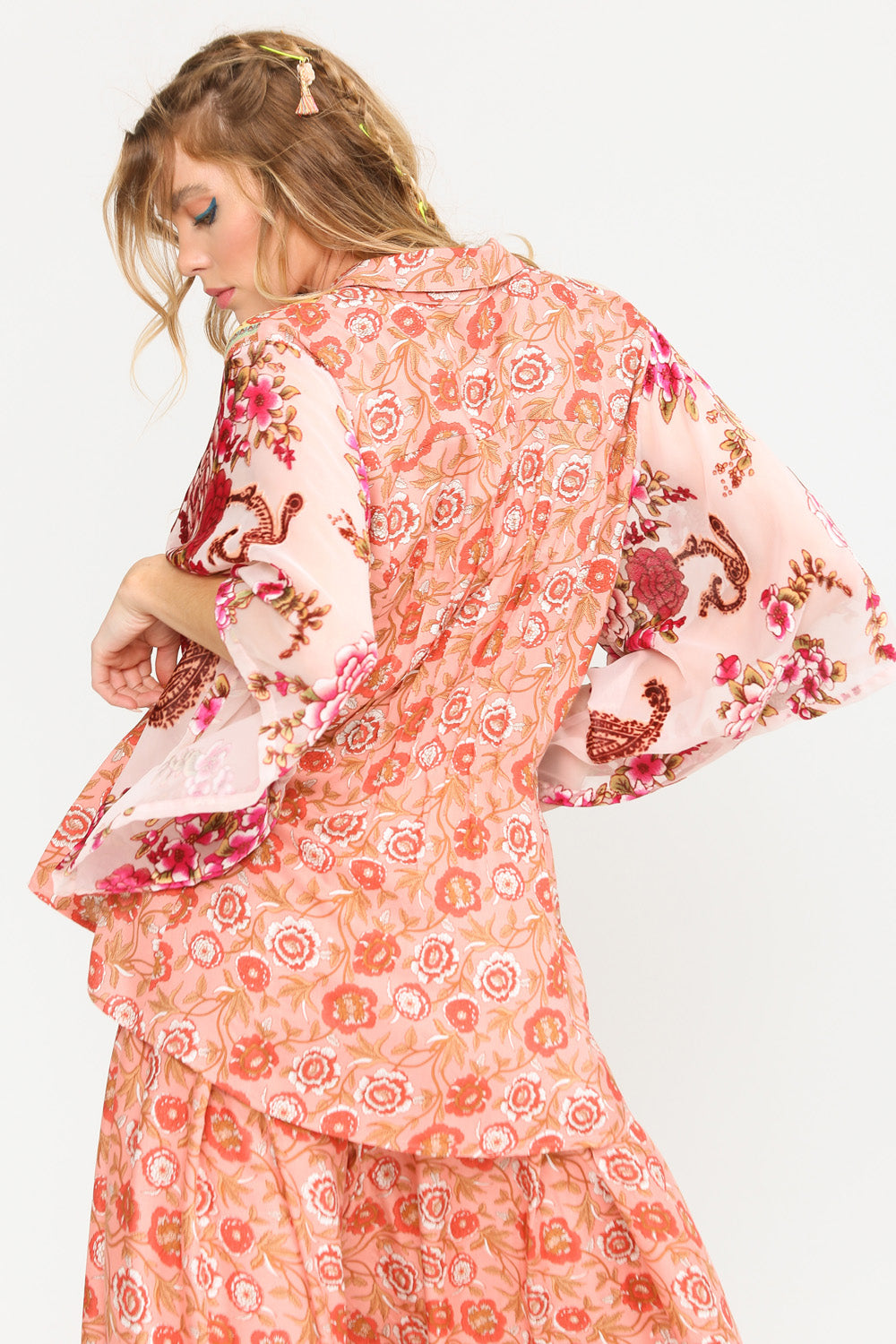 - Border floral print button-up shirt with pintuck back & floral burnout velvet sleeves
