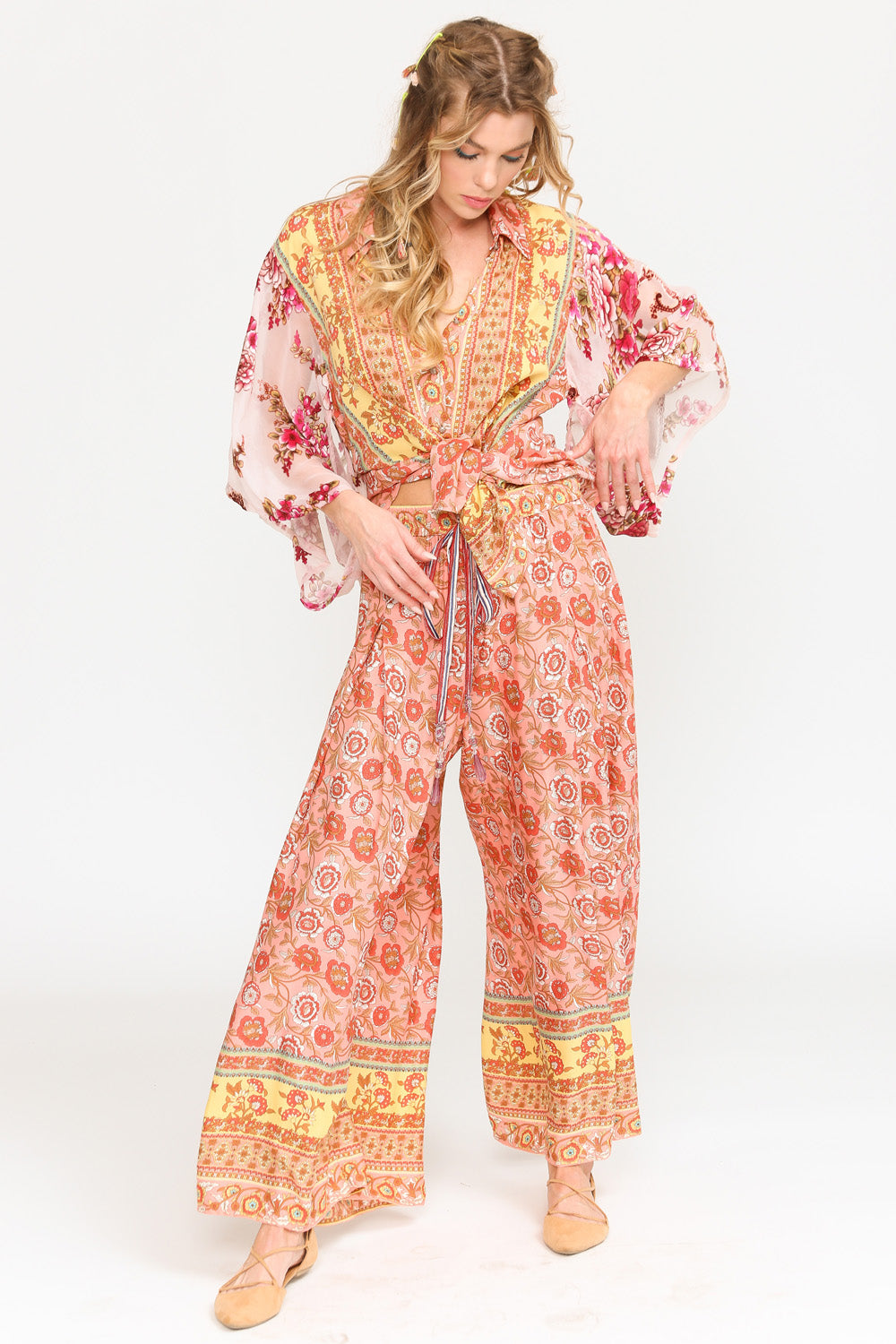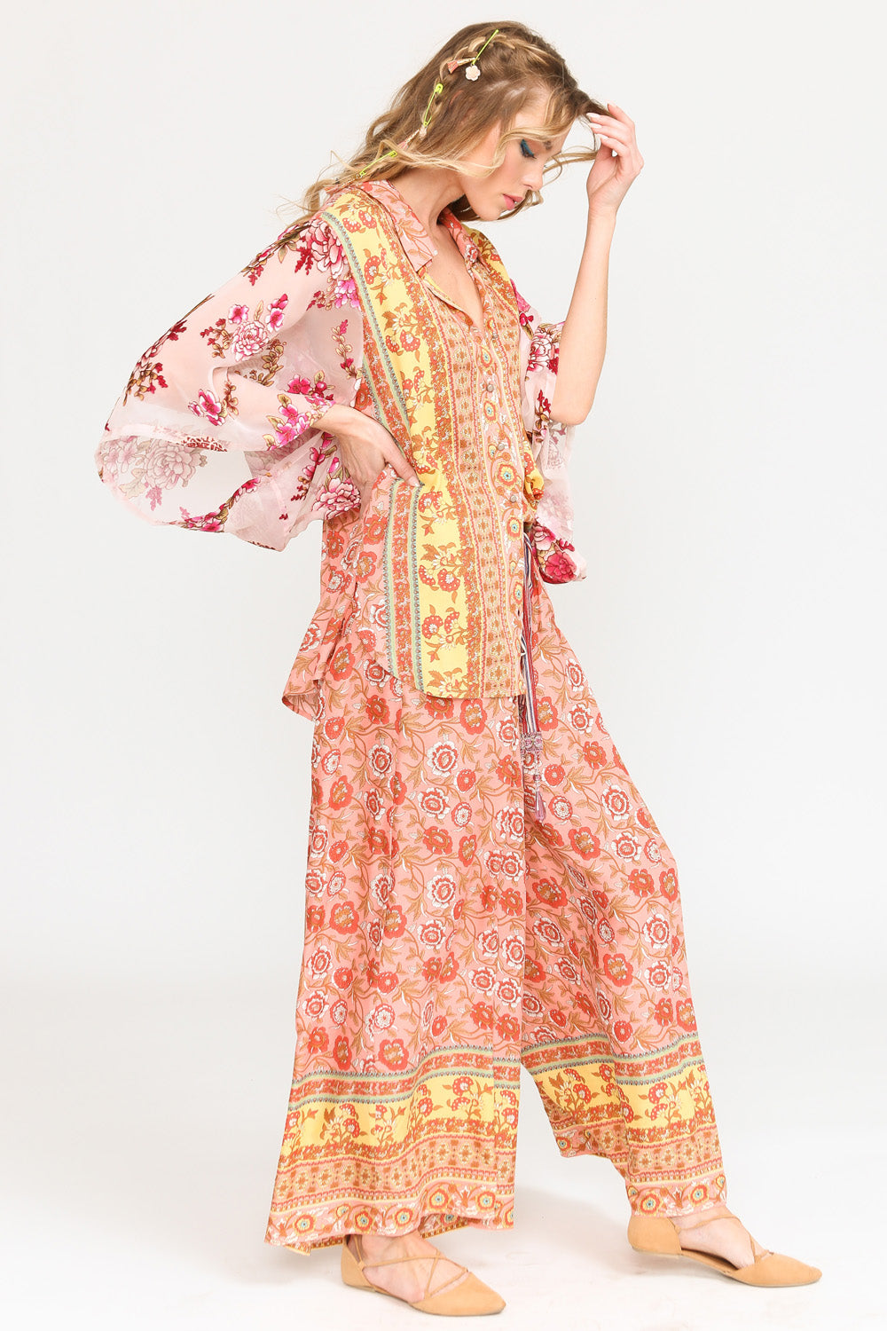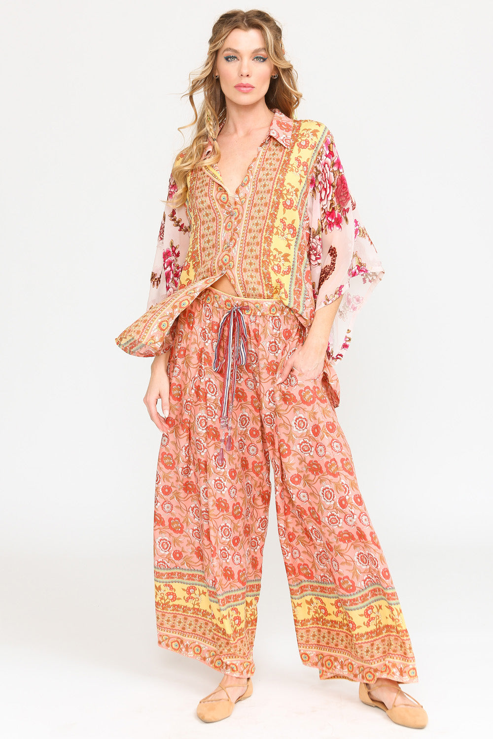 - Border floral print button-up shirt with pintuck back & floral burnout velvet sleeves