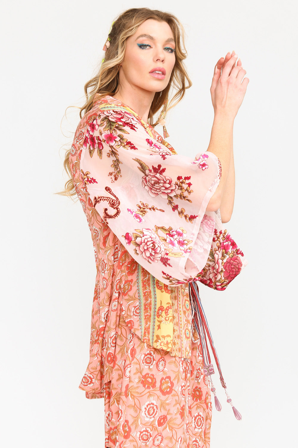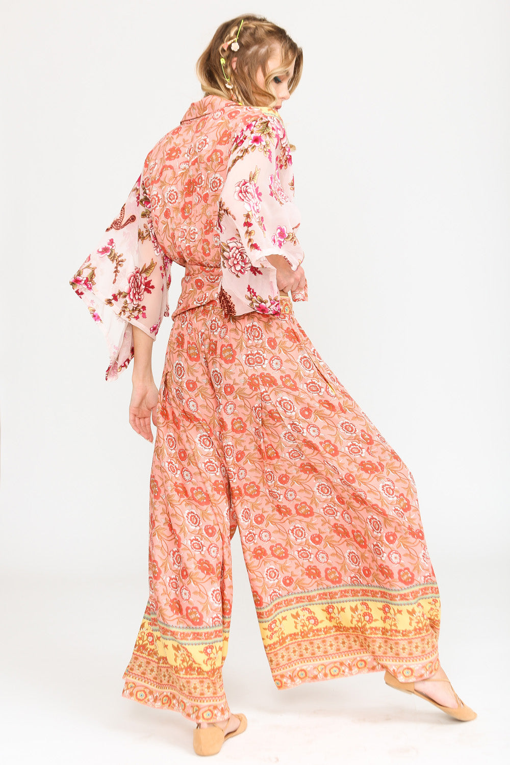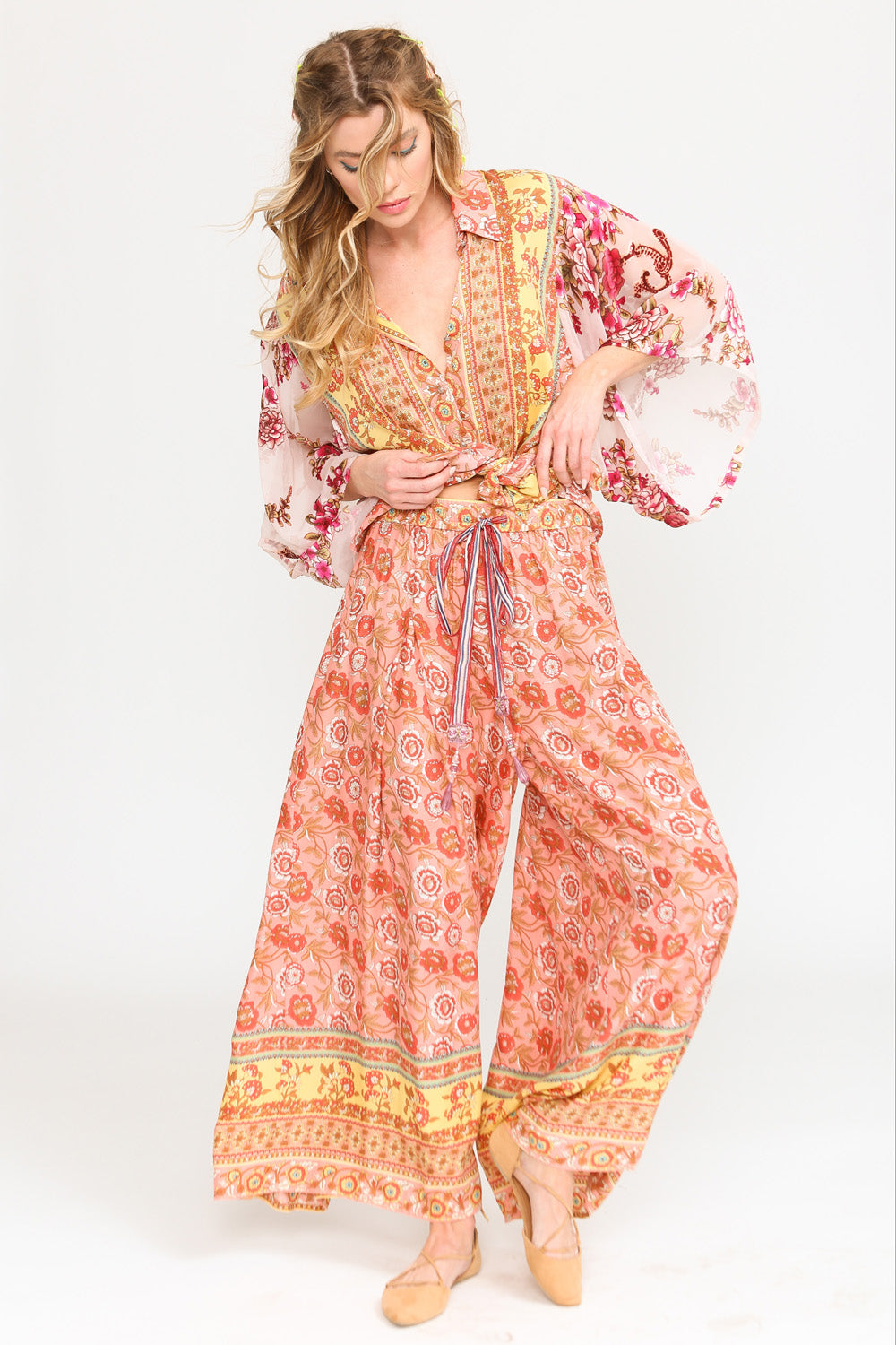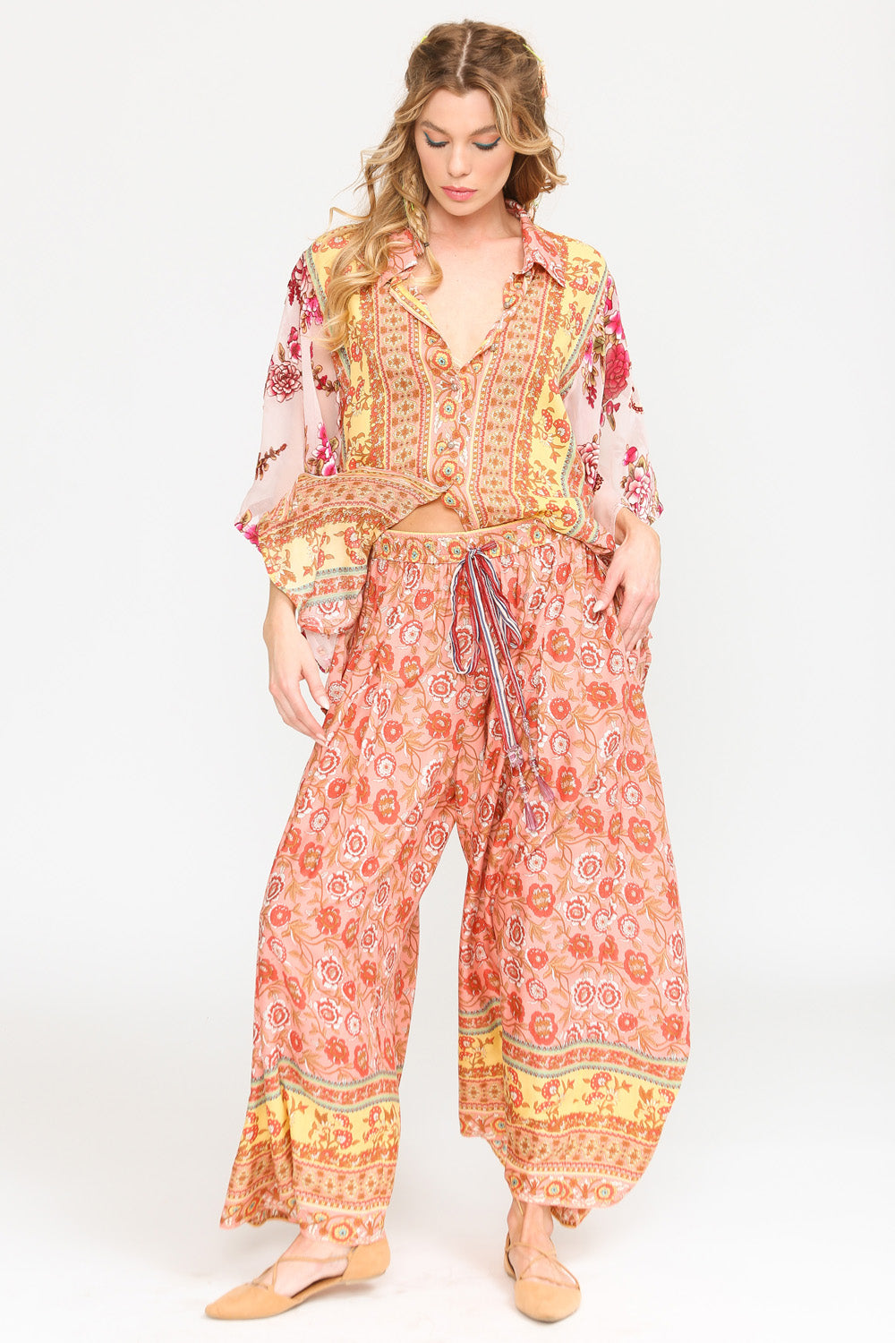 - Border floral print button-up shirt with pintuck back & floral burnout velvet sleeves