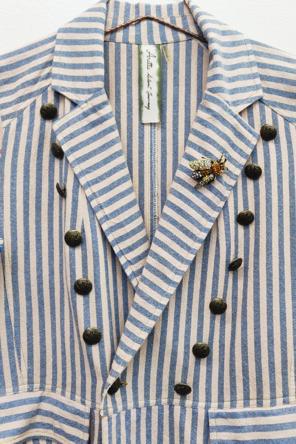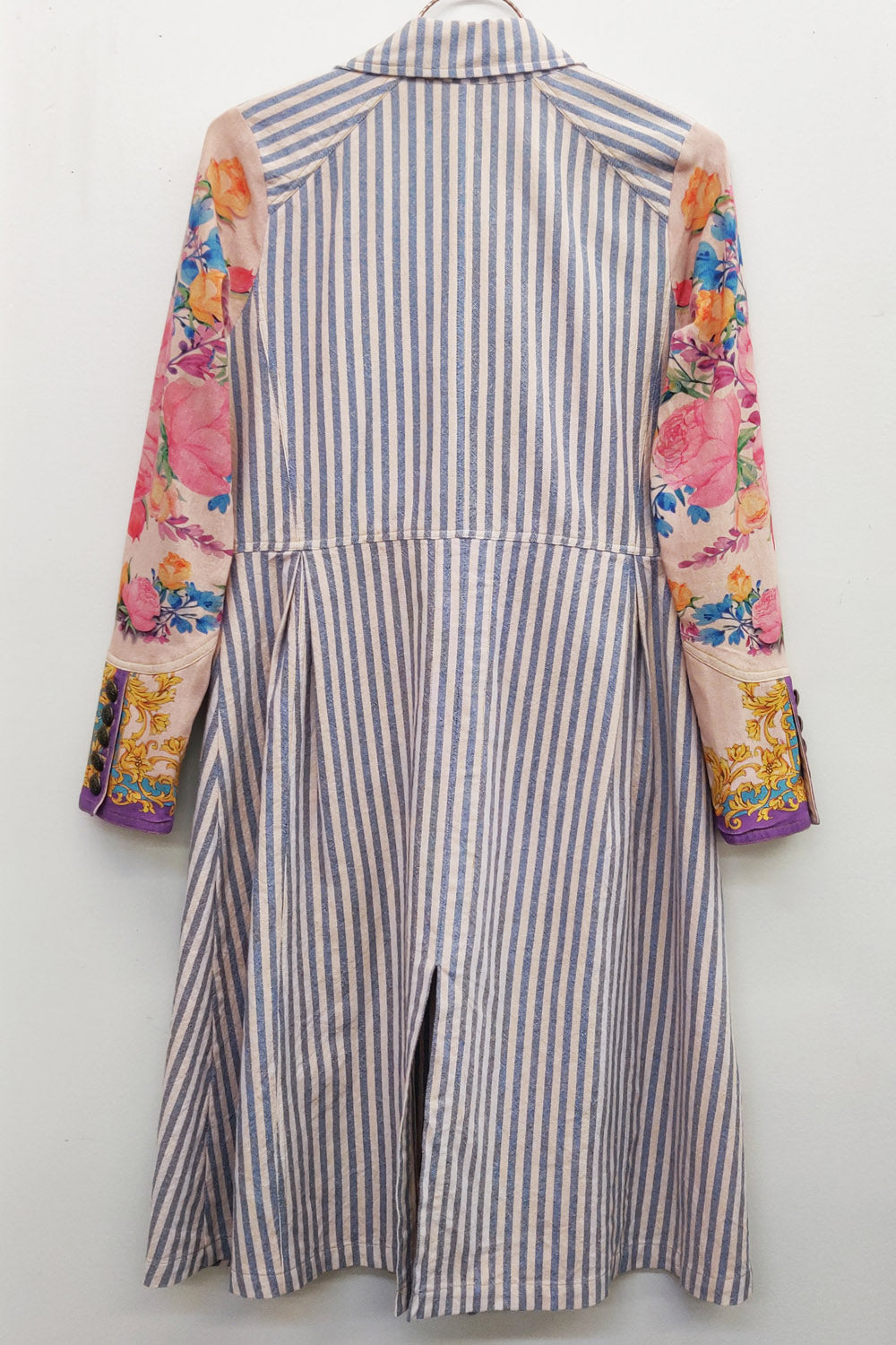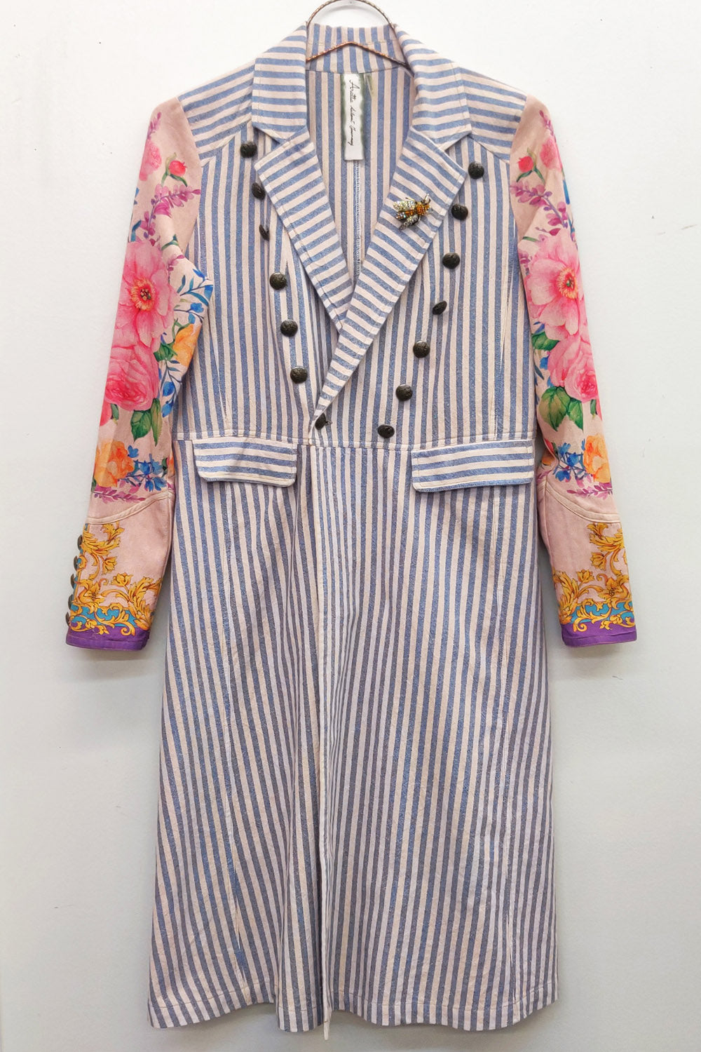 - Washed stripe unlined coat with 2 front flap pockets, 1 removable crystal wasp brooch pinned on the lapel, contrast floral print sleeves with scarf print cuffs, back hem slit, antique gold metallic button closure